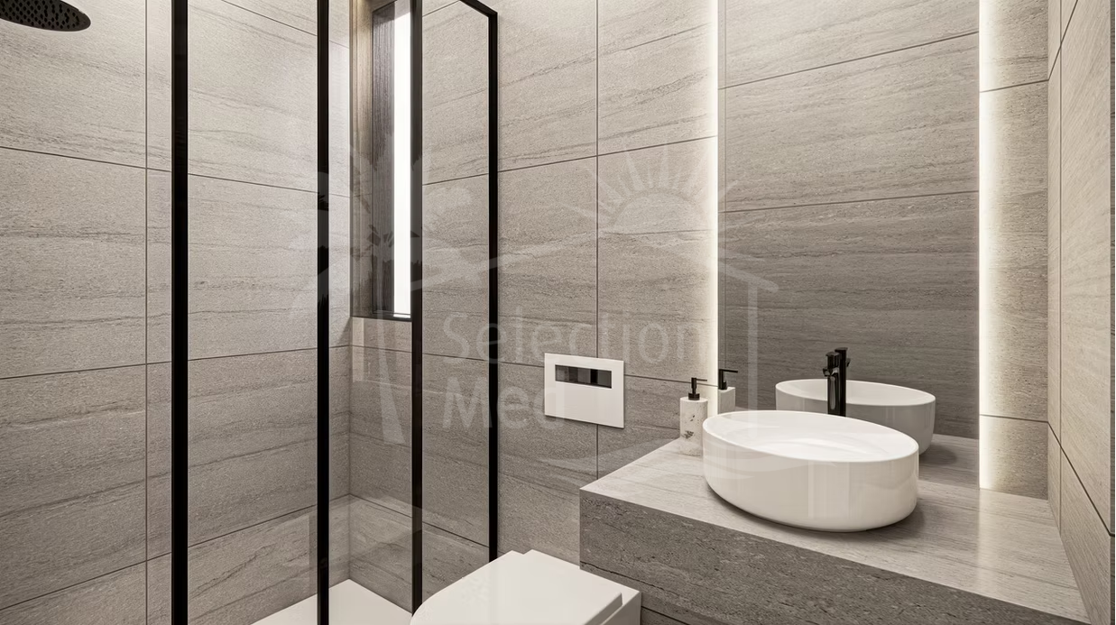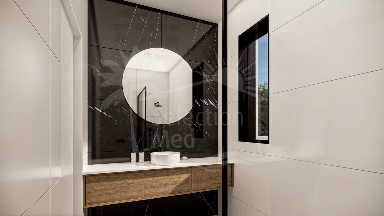 The exterior is designed for the ultimate Mediterranean lifestyle, featuring a large 91 m² terrace and a private heated saltwater infinity pool. A unique feature of this project is the 18 m² barbecue pavilion, fully equipped with a fridge, dishwasher, and TV, perfect for entertaining. For parking, each villa includes a private closed garage for two vehicles as well as two additional parking spaces on the plot.