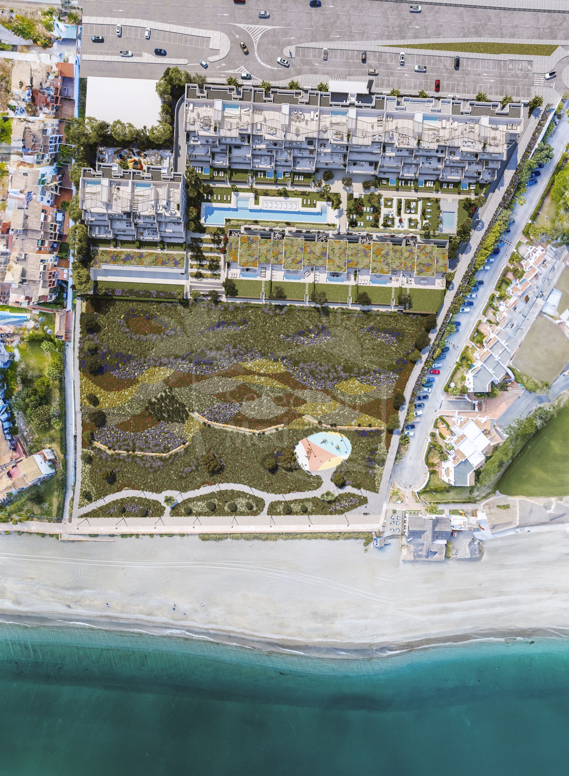 Le développement dispose d'un plan d'aménagement paysager intégré qui comprend un impressionnant 5 000 mètres carrés de jardins privés réservés exclusivement aux résidents, à côté d'une importante zone verte publique de 13 500 mètres carrés positionné stratégiquement entre les résidences et le rivage. Ces espaces verts méticuleux ont été conçus non seulement pour améliorer la beauté naturelle des environs, mais aussi pour maintenir une vue panoramique dégagée sur la mer, créant un environnement tranquille et serein orné de flore indigène et de fleurs vibrantes.