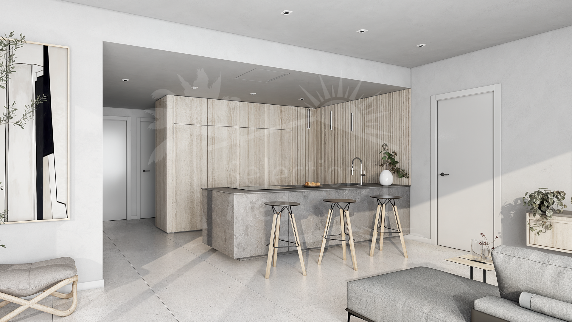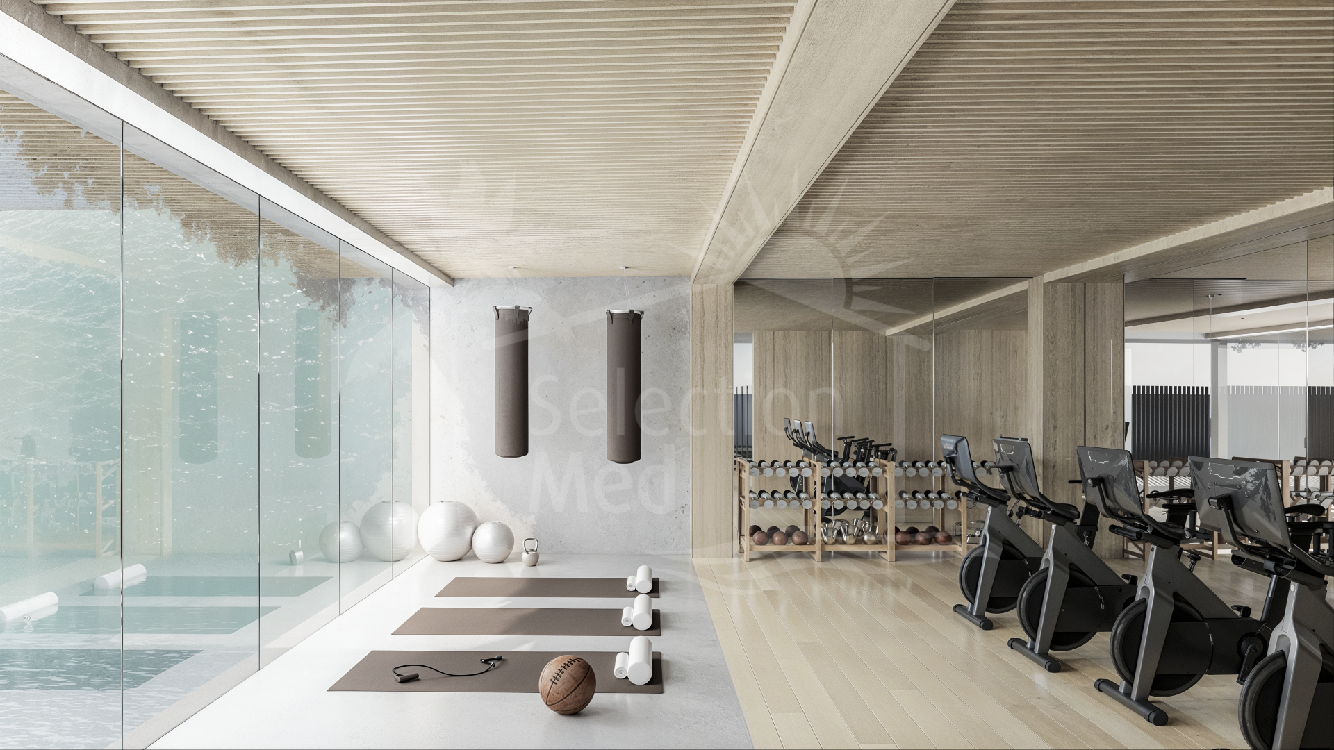 La vida al aire libre es protagonista. Los apartamentos en planta baja cuentan con jardines privados y piscina privada, mientras que los áticos disponen de amplios soláriums, también con piscina privada, creando espacios ideales para relajarse, recibir invitados y disfrutar del clima mediterráneo. Todas las propiedades incluyen aparcamiento subterráneo con acceso por ascensor, lo que aporta comodidad en el día a día.