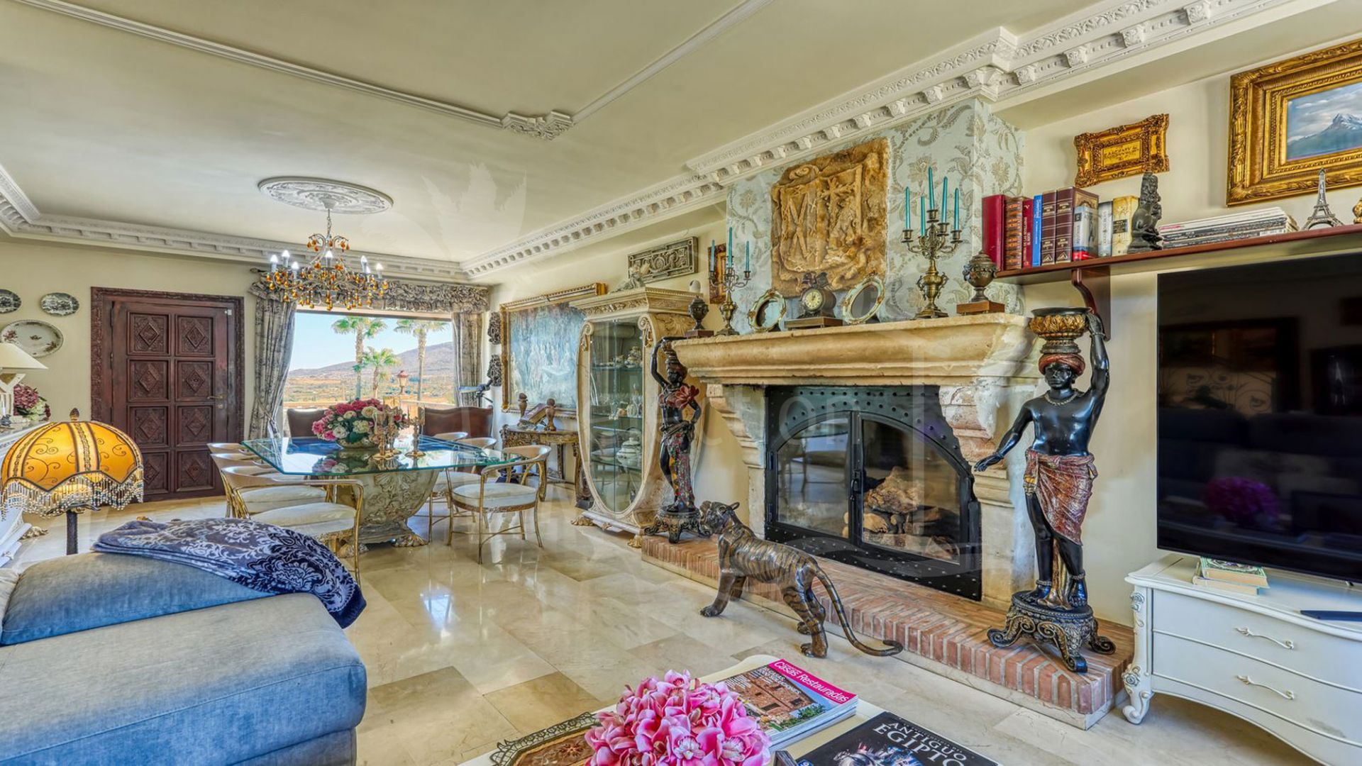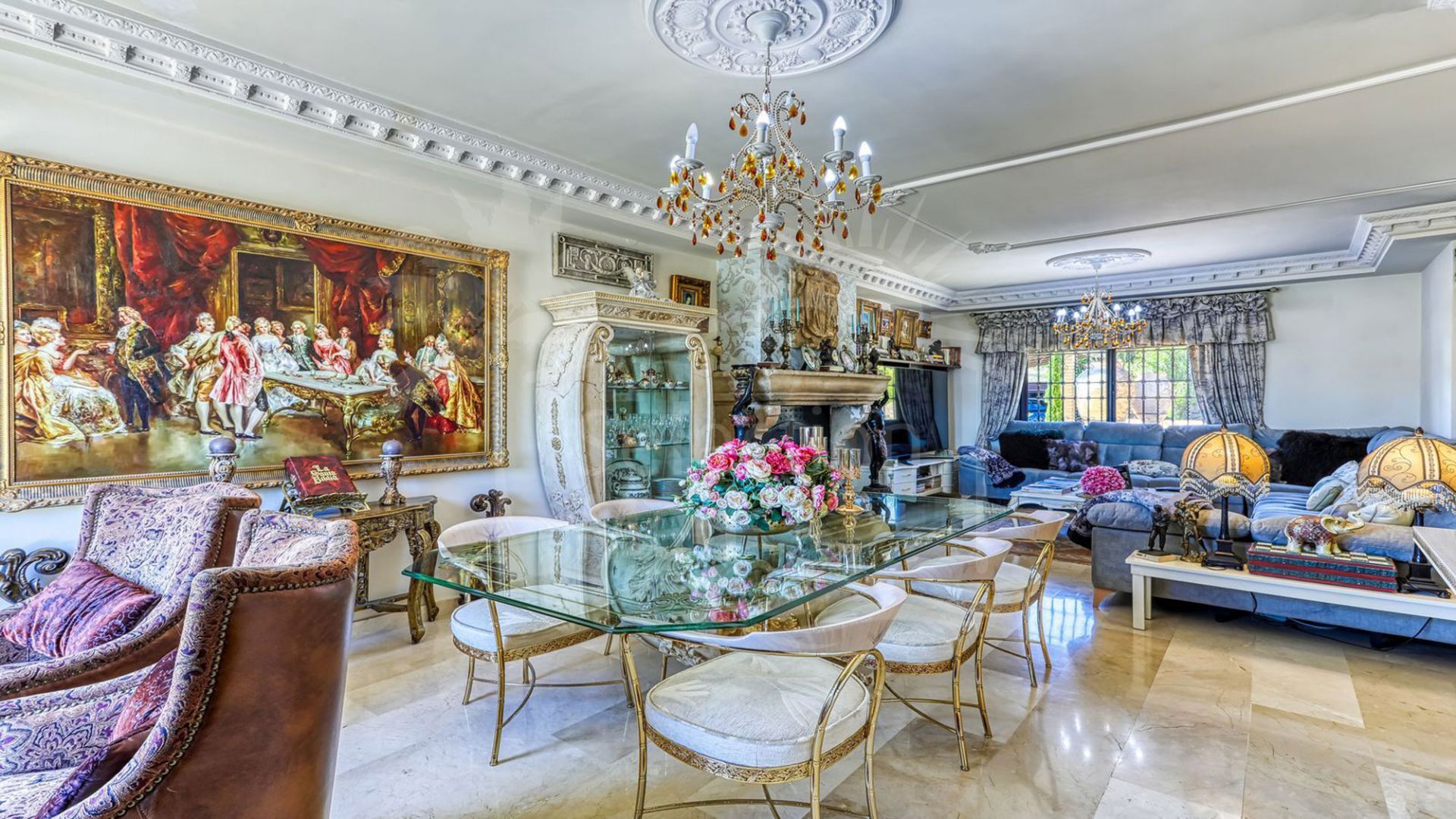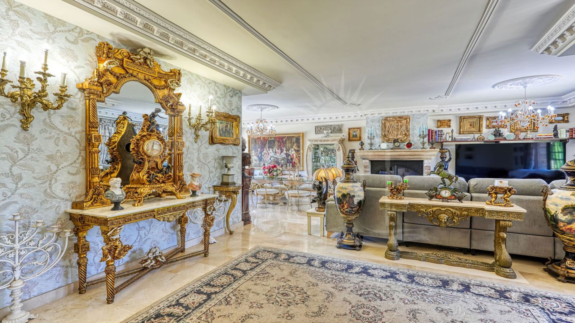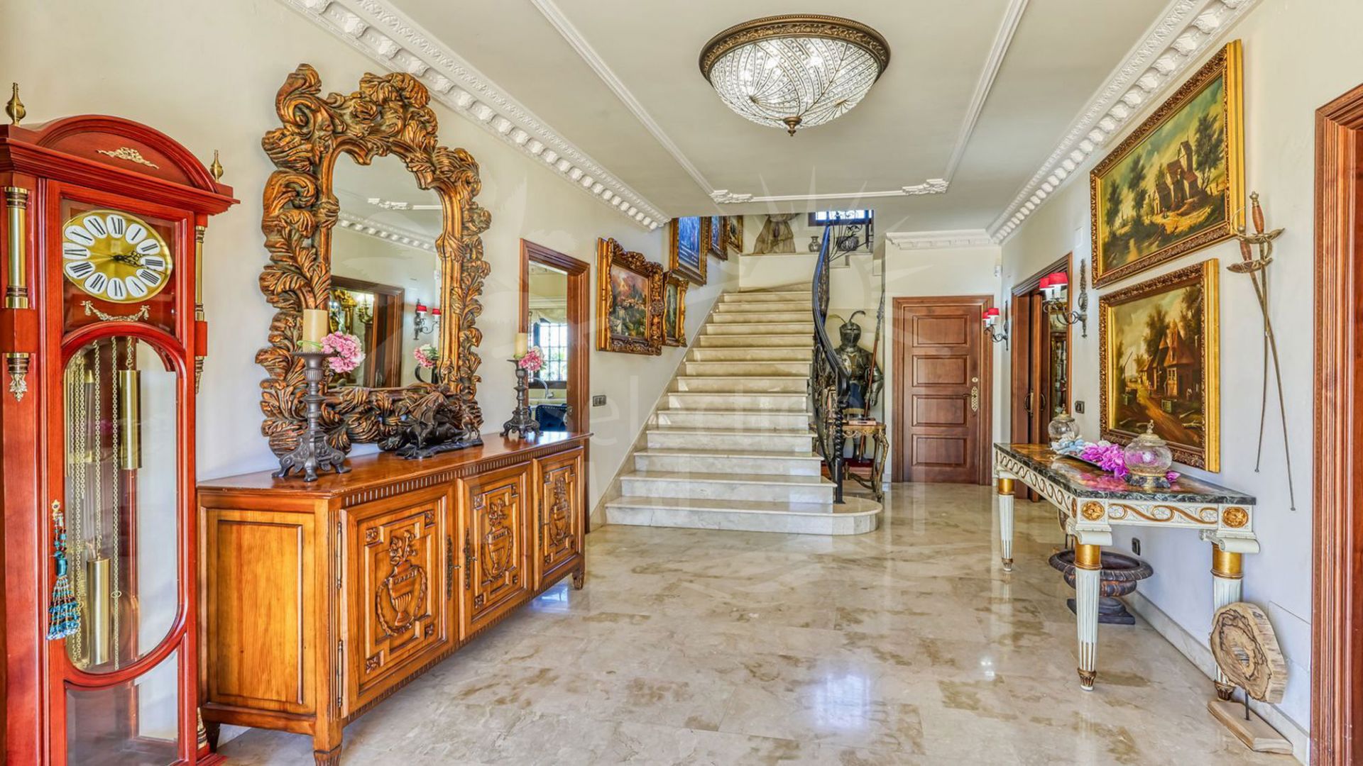The property features ample spaces surrounded by palm trees and a mature garden, highlighted by a beautiful central fountain. Vehicle access is wide, facilitating arrival to this gem. On the ground floor, there is an entrance hall and a guest toilet, as well as a kitchen with a separate laundry room and a large living room with a fireplace, ideal for enjoying cozy moments.