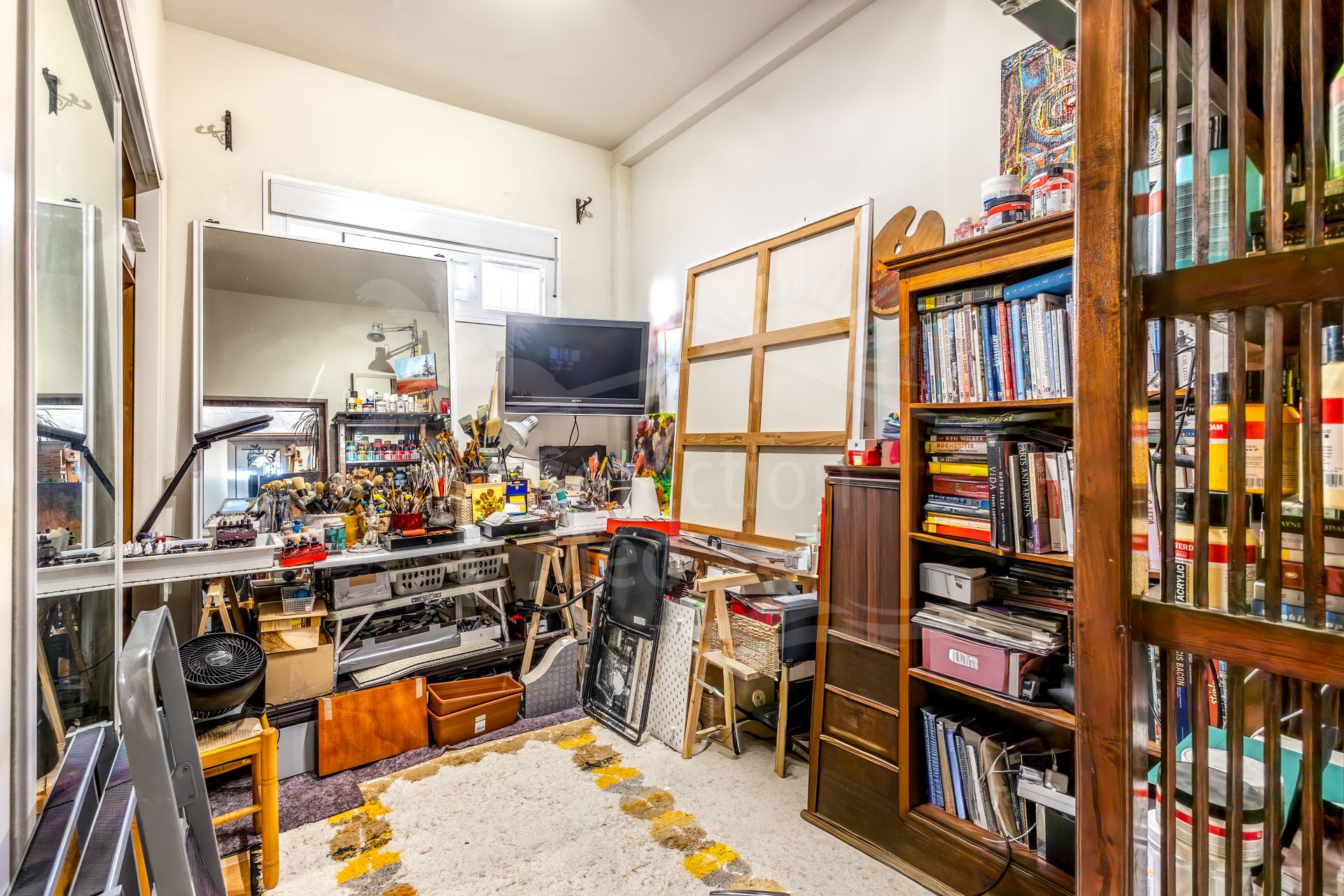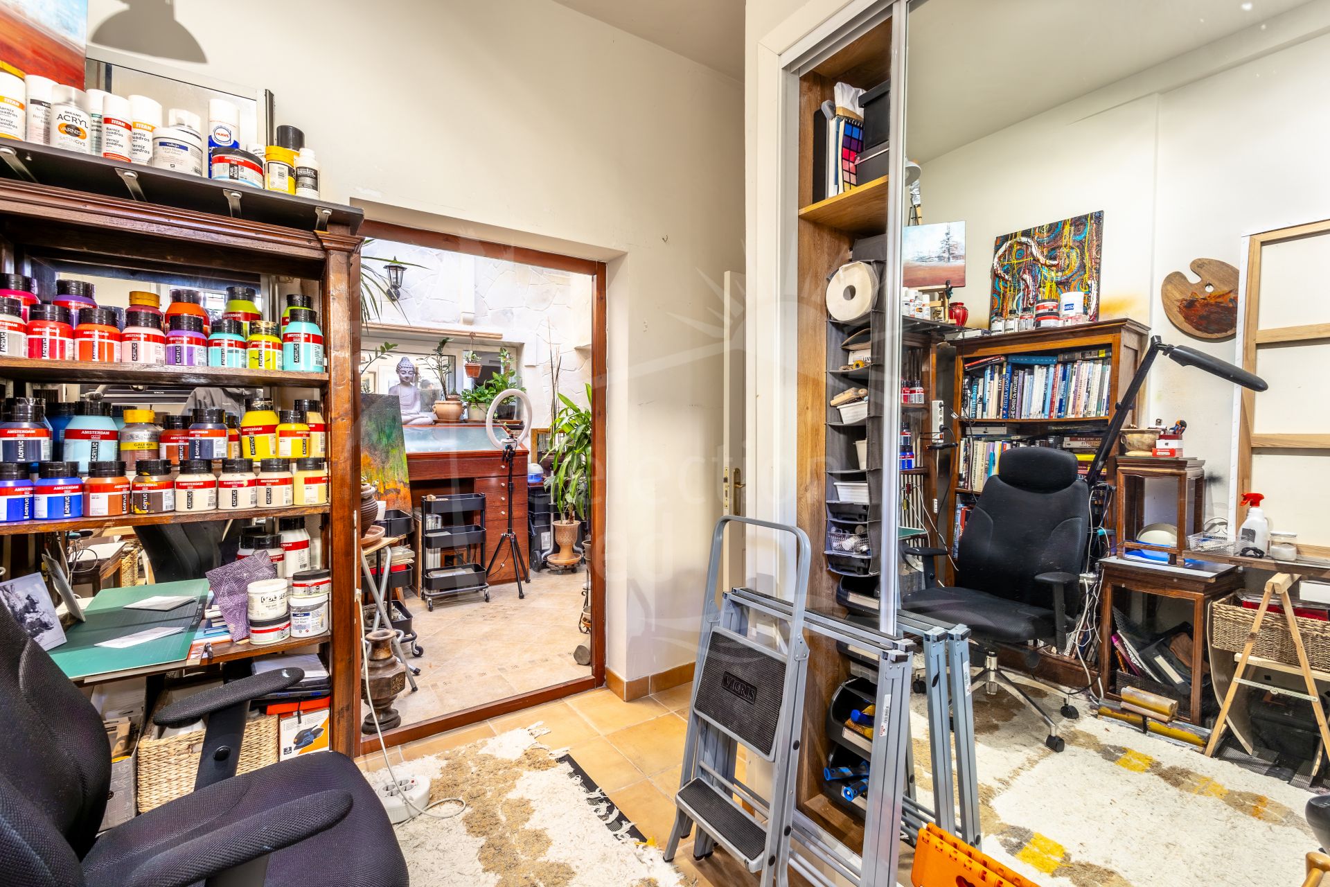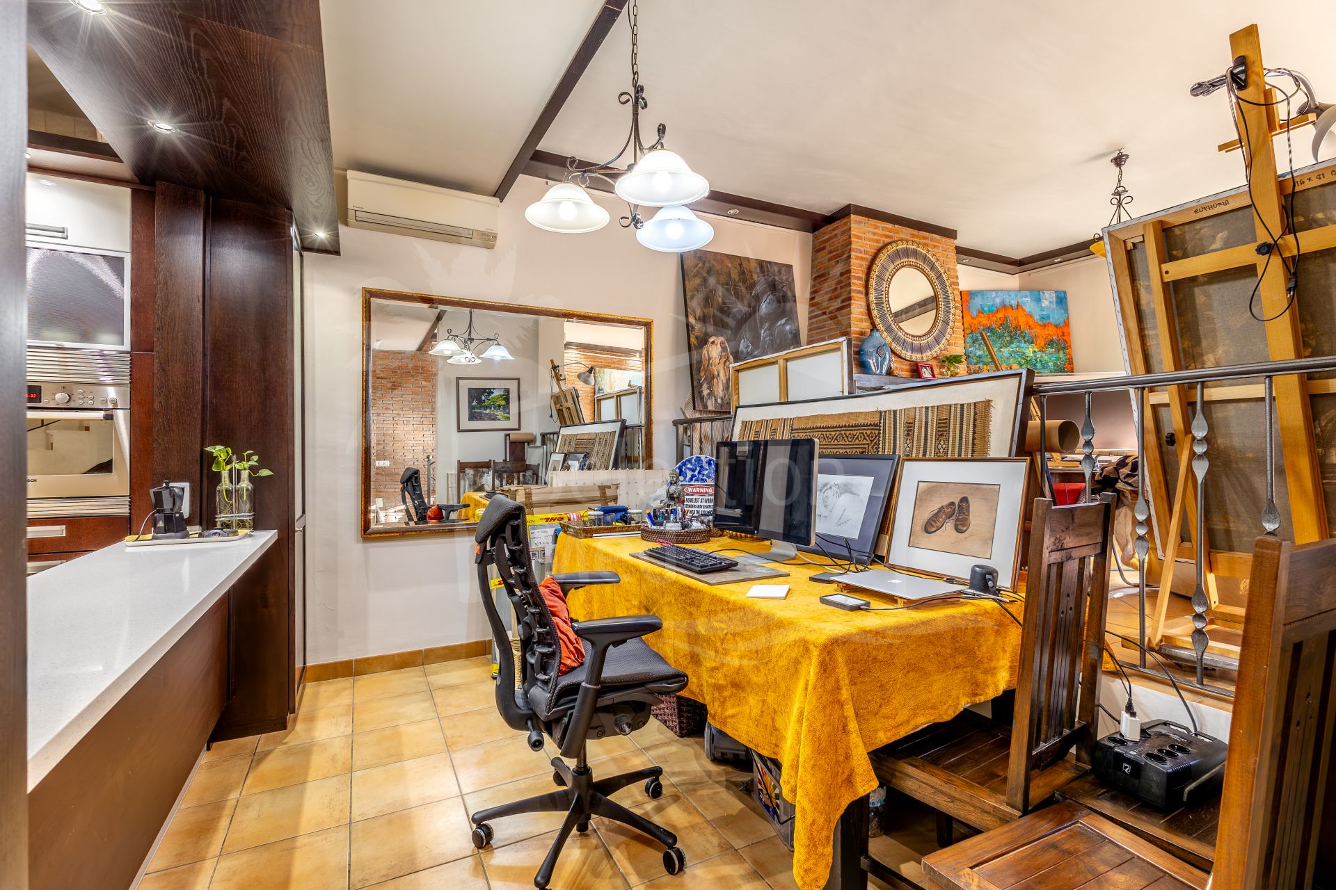 The kitchen is large, modern, and of high quality, equipped with Bosch appliances. A wide hallway connects to the second bedroom, a bathroom with a shower, and an additional atrium-type room, currently used as an art studio, also ideal as an office or creative space.