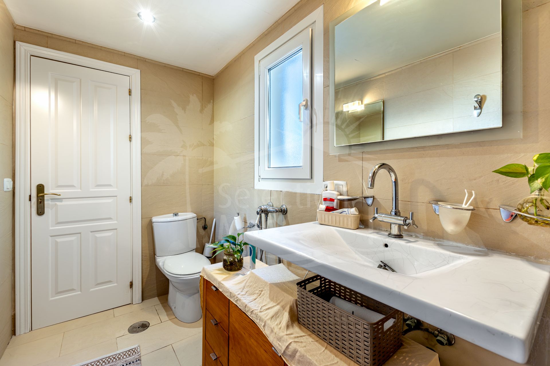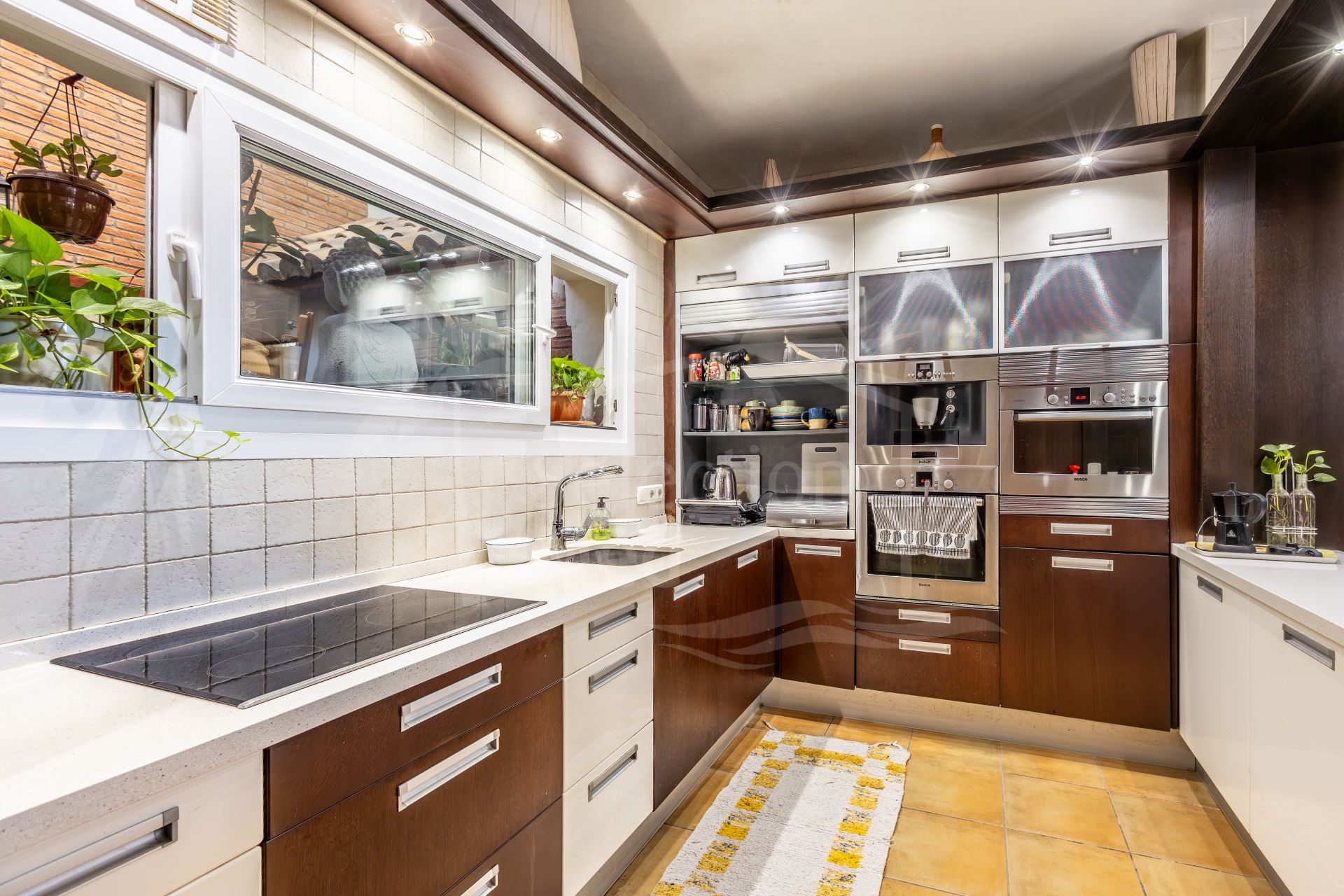 On the main floor, you will find a spacious open-concept living-dining room, distributed over two levels, very bright and welcoming. From here, there is access to a southwest-facing dining terrace, perfect for enjoying the sun and views of the Alhaurín Golf mountains, Barranco Blanco, and the surrounding area.