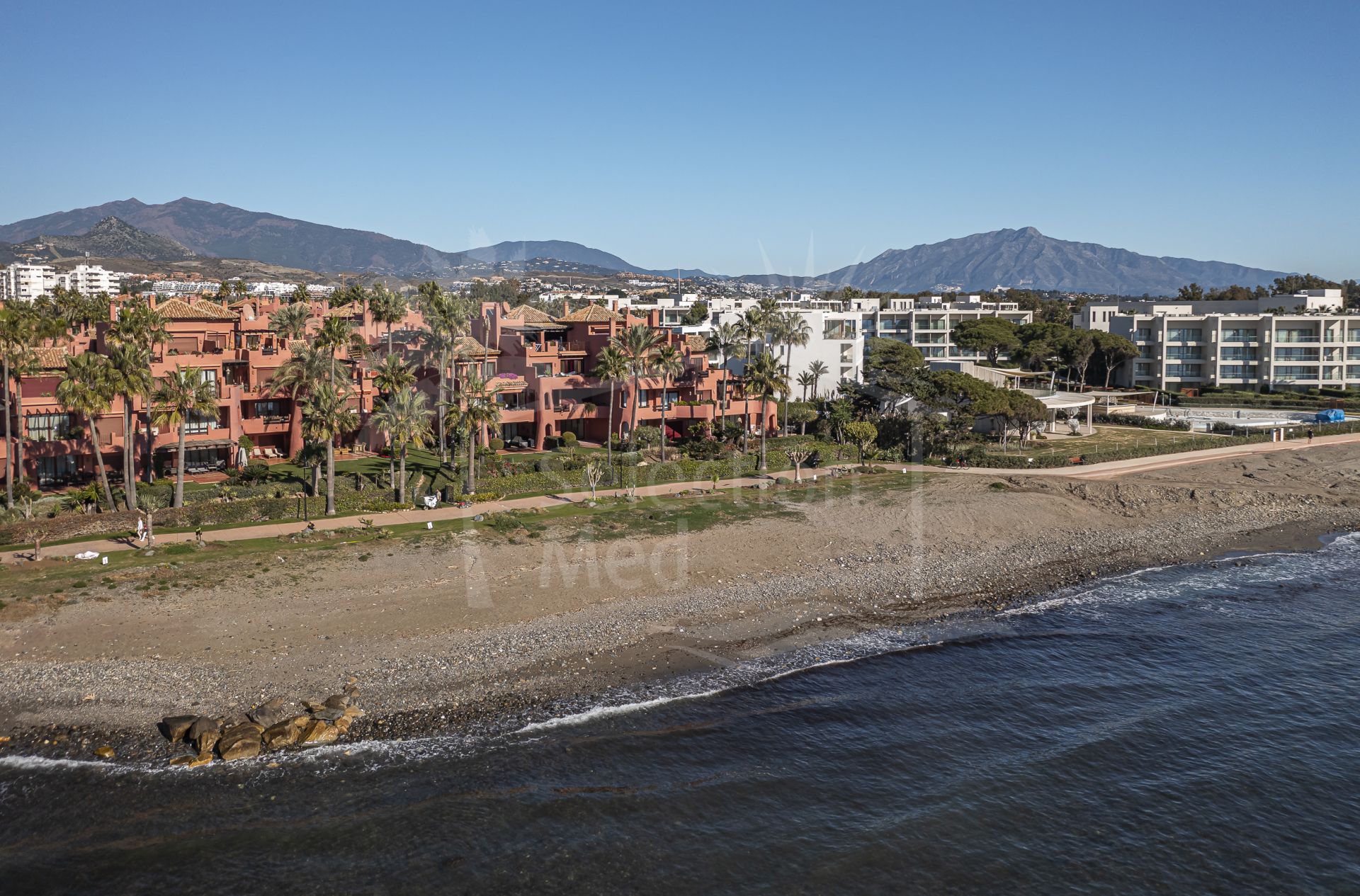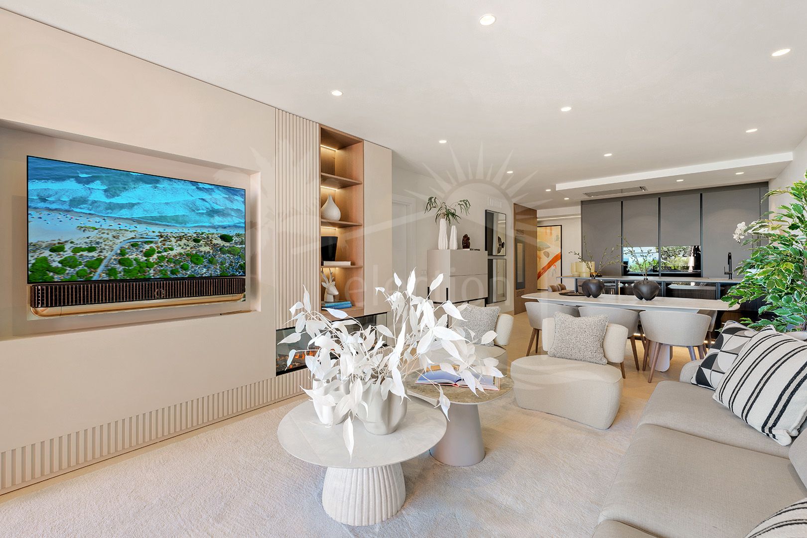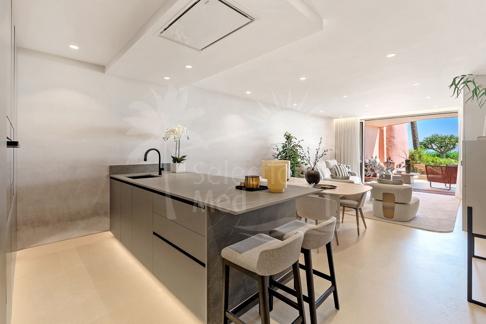 Positioned on the beachfront, this spacious apartment offers a well-considered layout with a bright living area that opens onto a large terrace, ideal for enjoying the sea views and the sound of the waves. The open-plan kitchen features high-spec finishes including an invisible hob, B&O sound system and a wine fridge, seamlessly combining practicality with style.