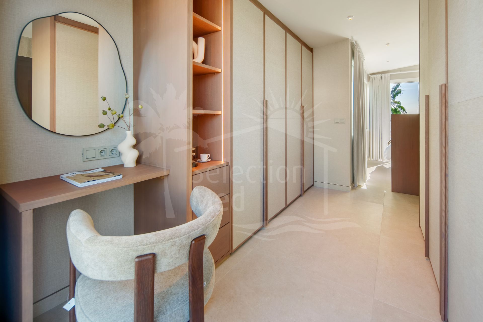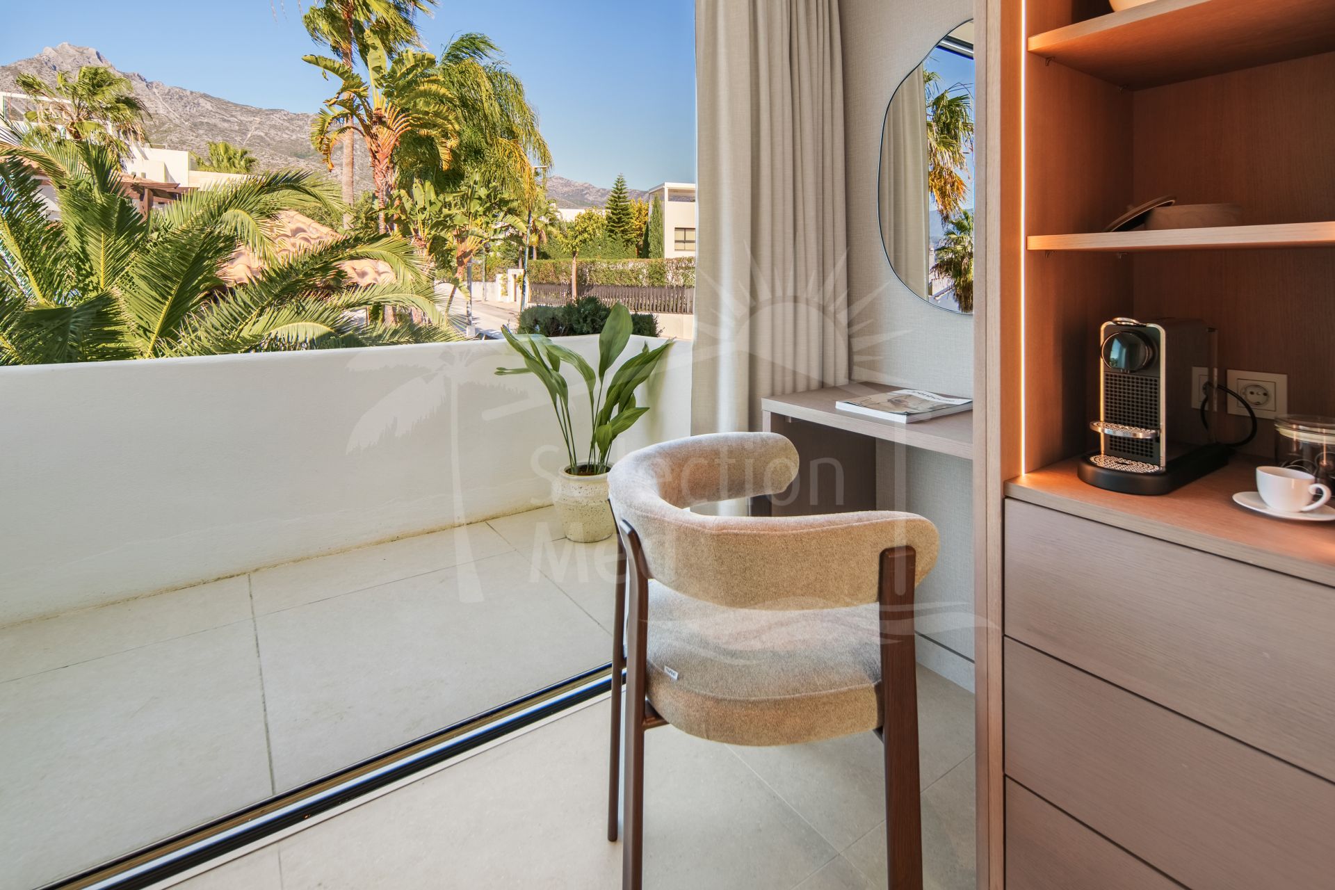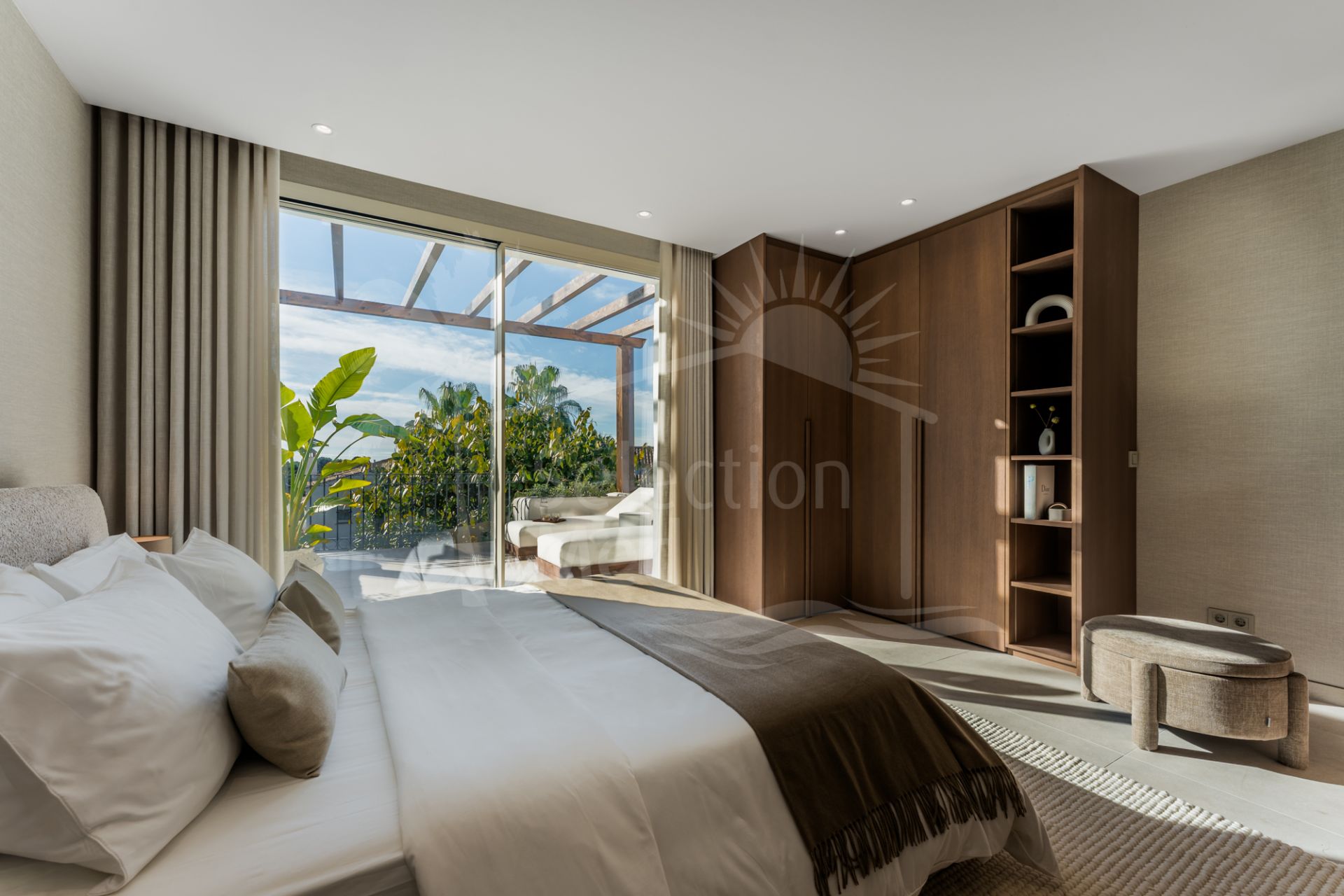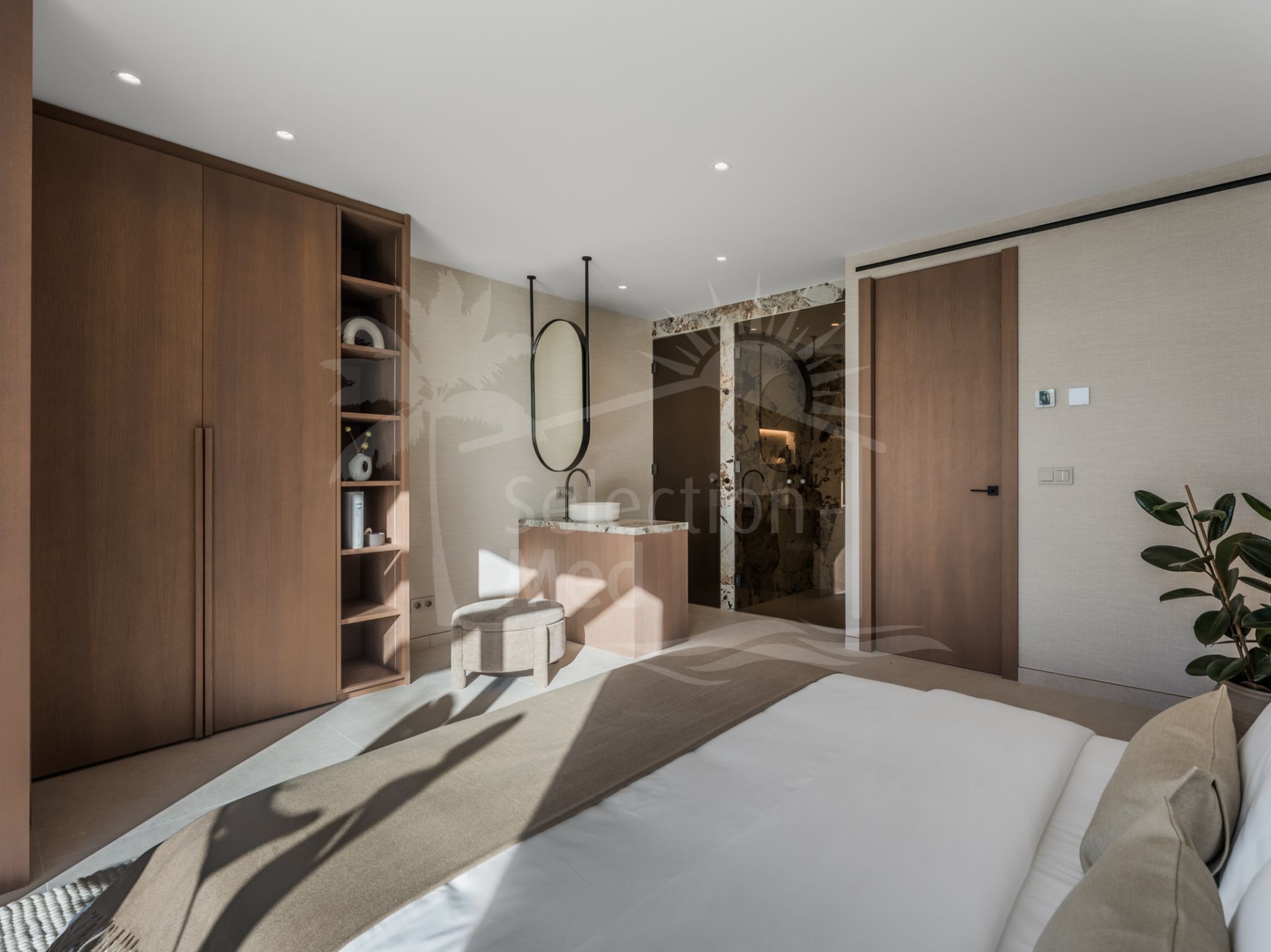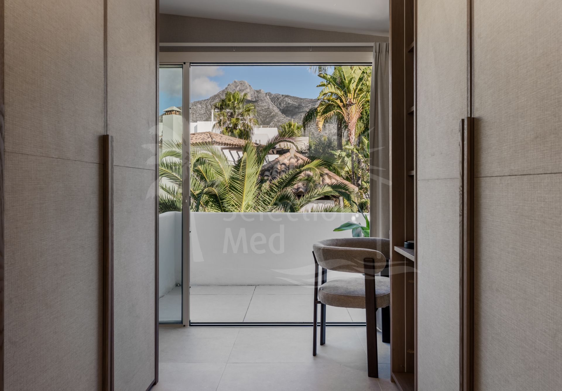 Upstairs, the villa features three generously sized en-suite bedrooms, each thoughtfully designed for comfort, privacy, and natural light. The master suite, located on this level, is a true highlight—featuring a stylishly centered bed, a spacious walk-in wardrobe, and a luxurious en-suite bathroom. This serene retreat offers uninterrupted panoramic views of both La Concha Mountain and the Mediterranean Sea, creating a breathtaking visual experience from the moment you wake.