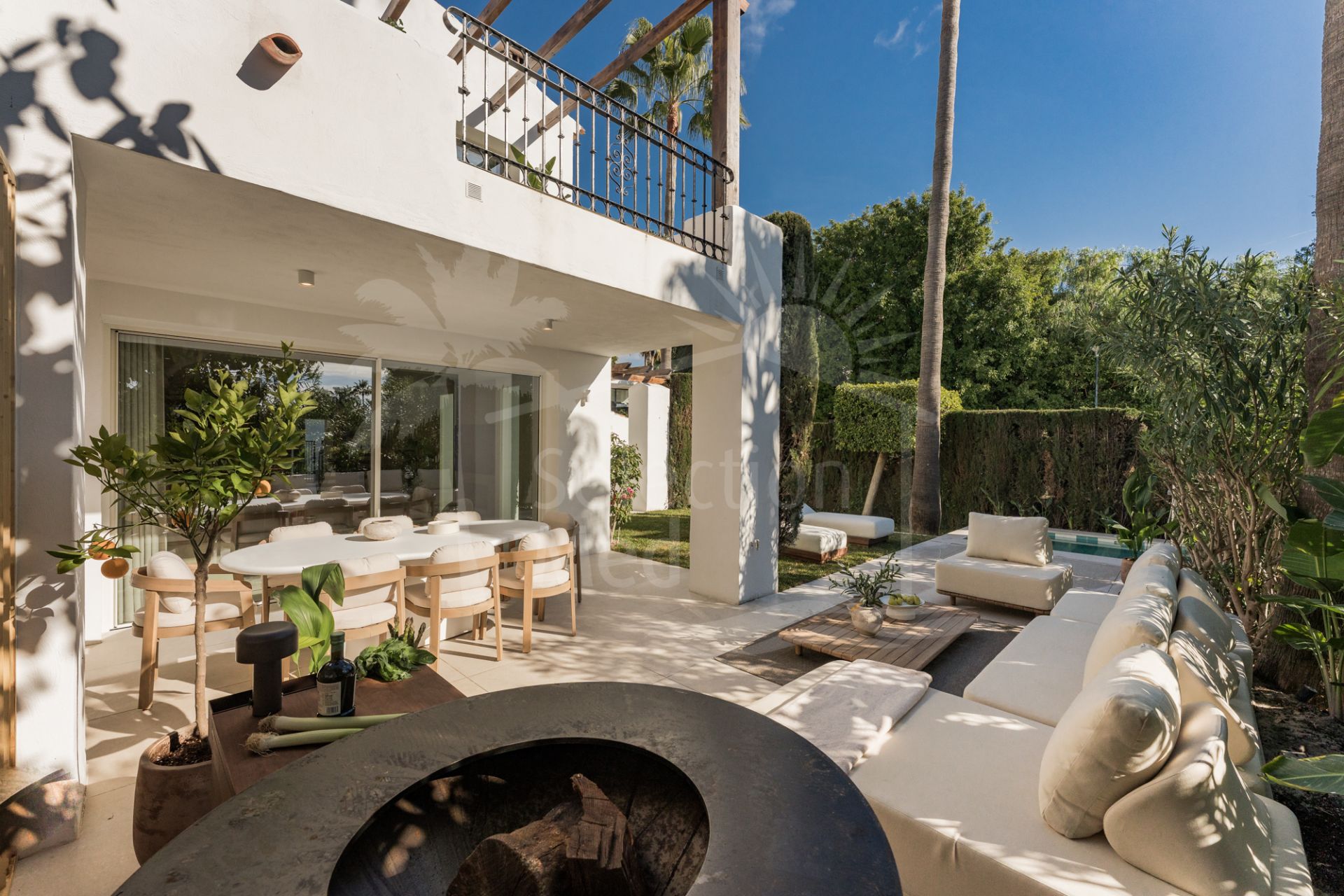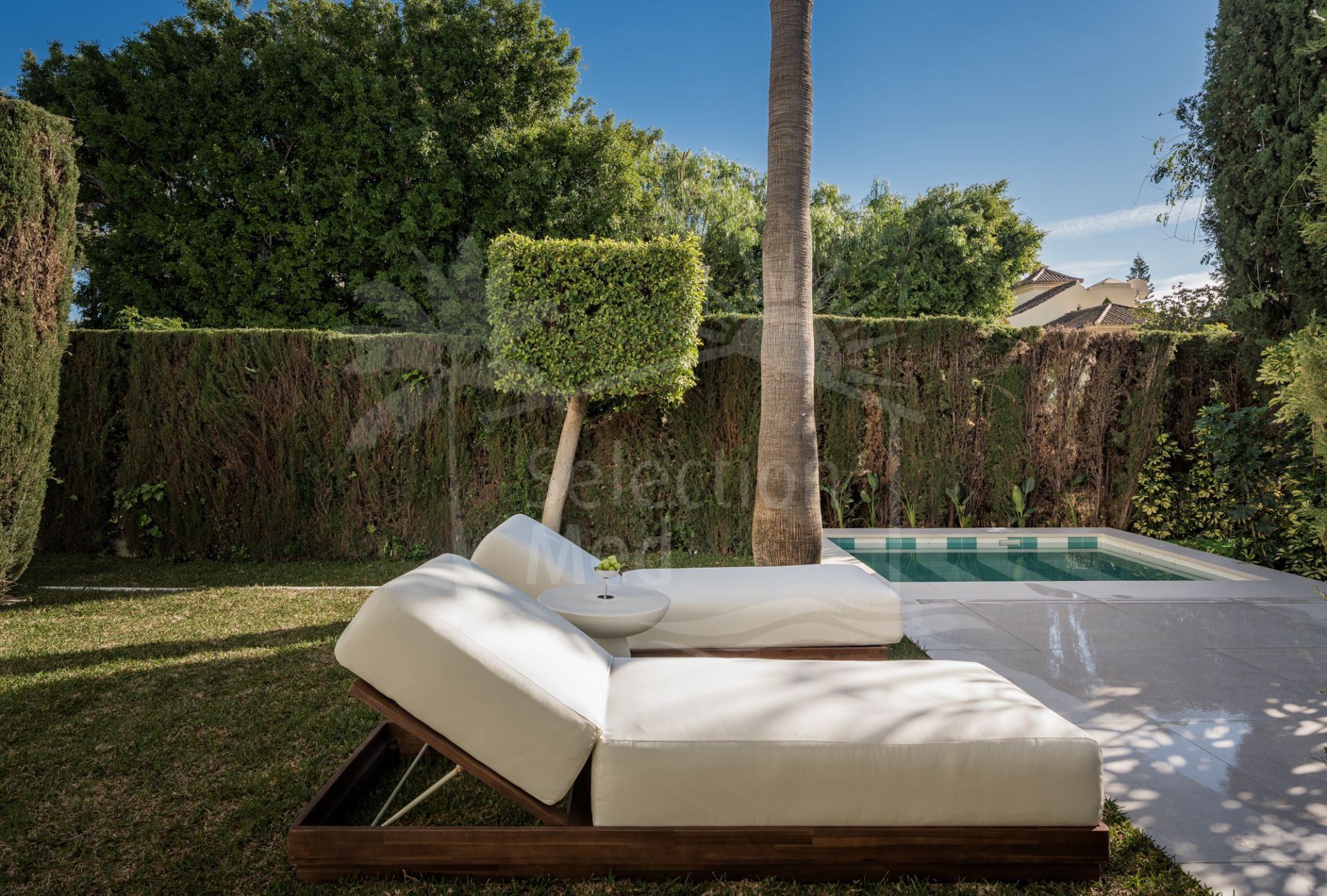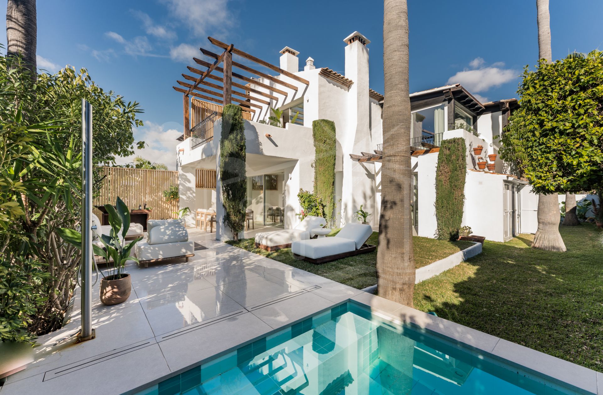 Set on a prime corner plot, the property is surrounded by mature palm trees and vibrant Mediterranean landscaping and a private plunge pool.