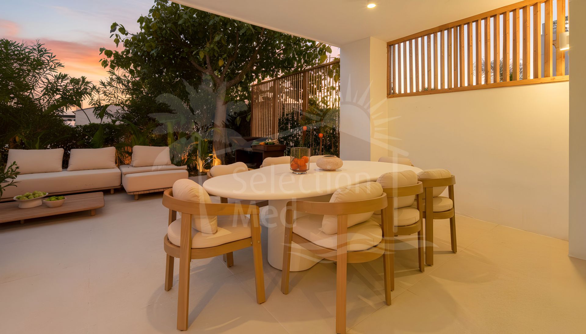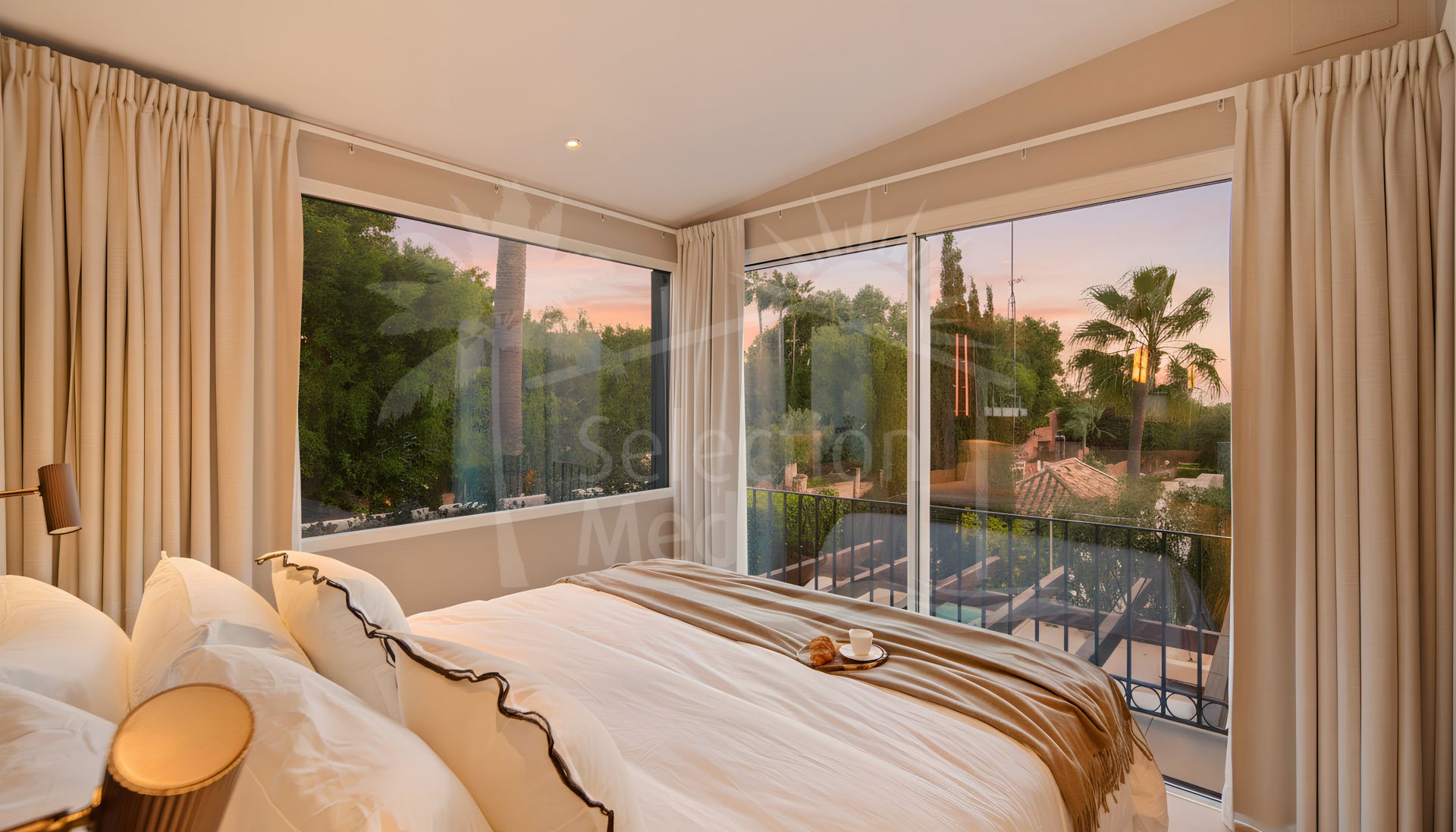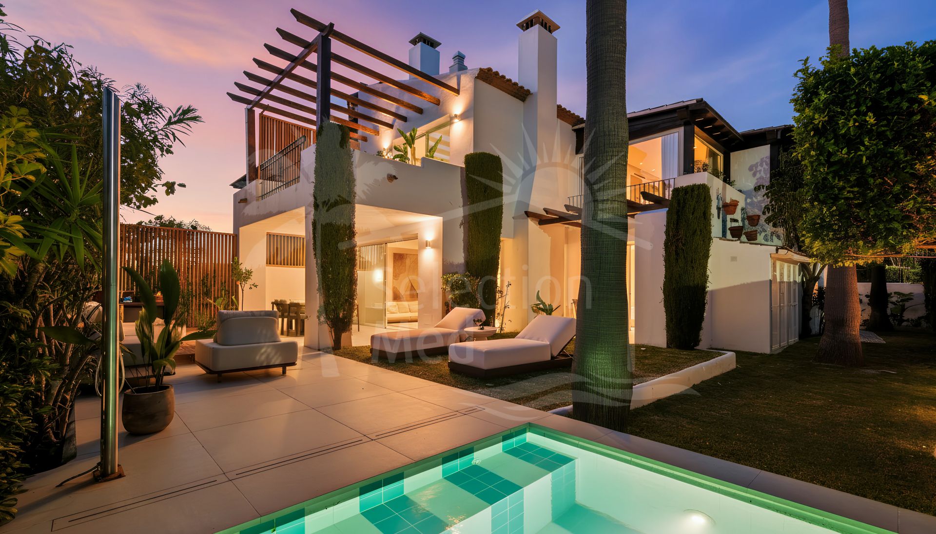 Set on a prime corner plot, the property is surrounded by mature palm trees and vibrant Mediterranean landscaping and a private plunge pool.