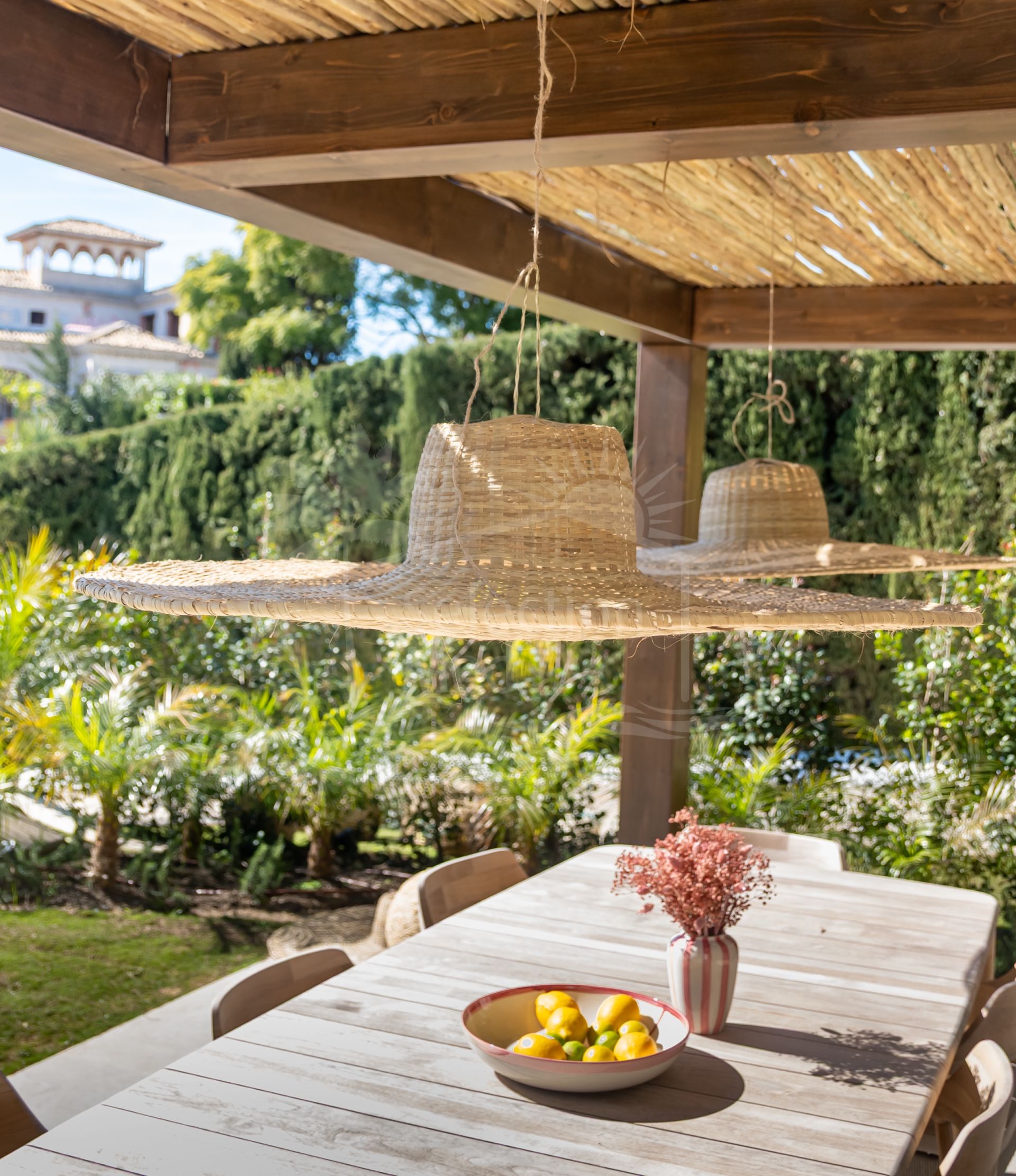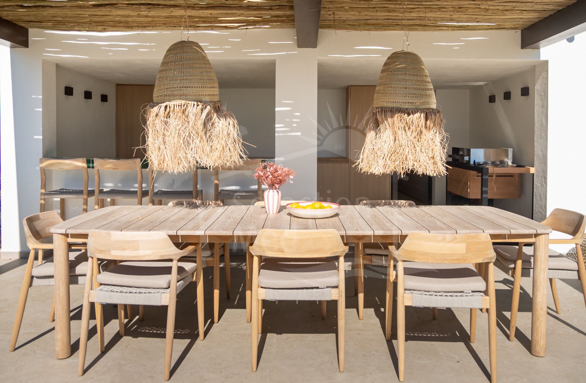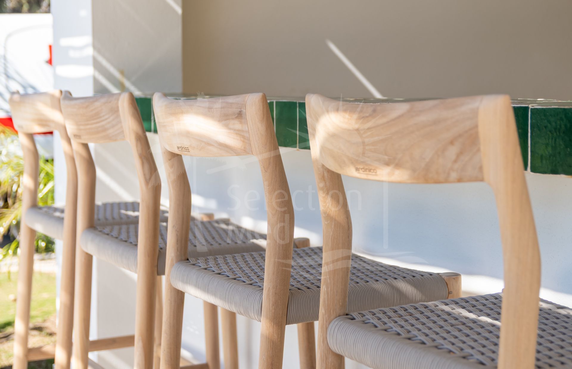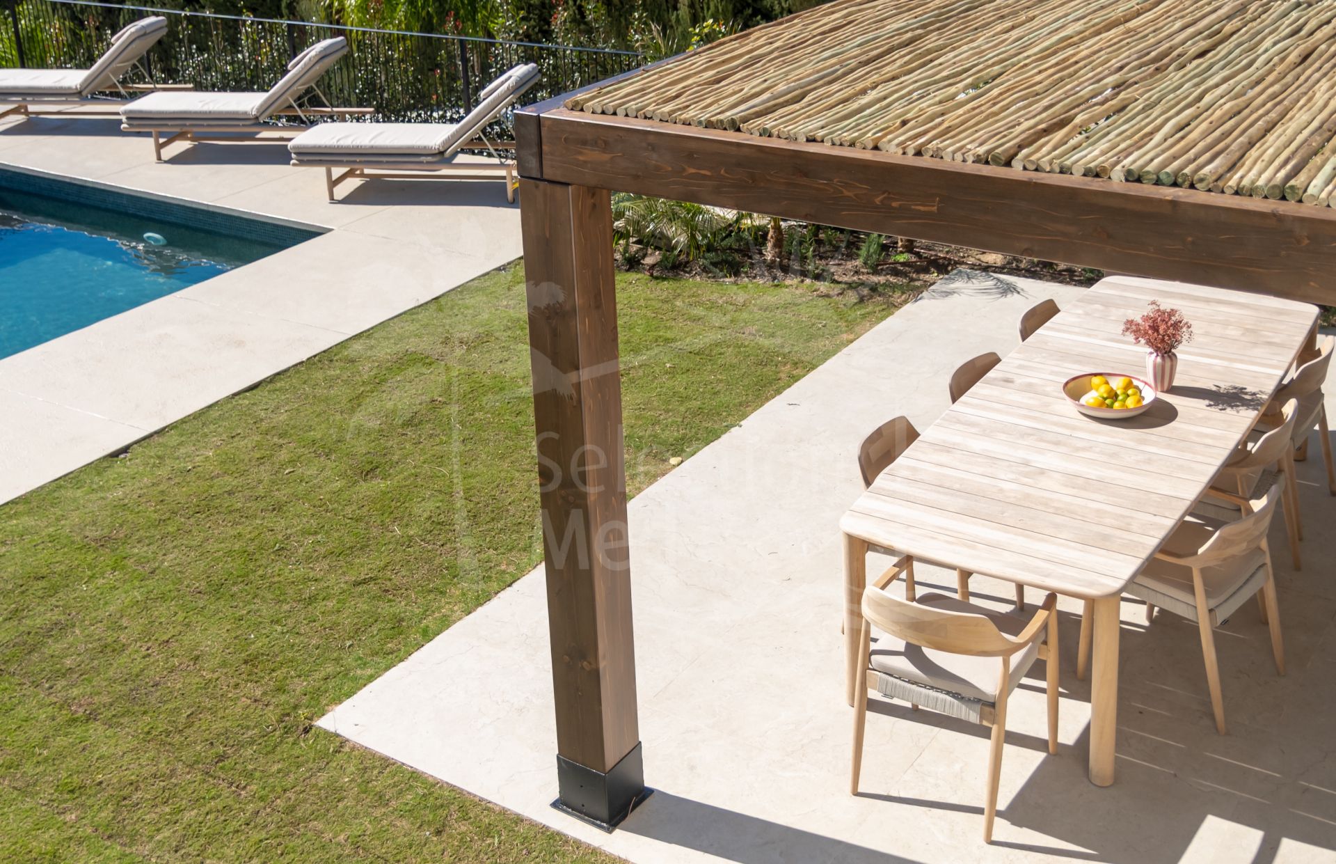 Outside, the villa presents a true Mediterranean lifestyle. The beautifully landscaped garden surrounds an elegant swimming pool and multiple outdoor living areas designed for relaxation and entertaining. A covered outdoor bar, pergola dining area for up to ten guests, and lounge spaces create the perfect setting for long summer evenings with family and friends.