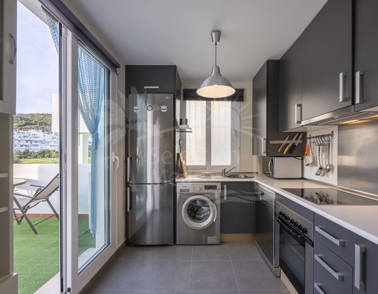 This bright and stylish two-bedroom apartment features a spacious master bedroom with an ensuite bathroom, a modern fully equipped kitchen, and a comfortable open-plan living area that leads onto a southwest-facing terrace with fantastic views over the Valle Romano Golf...