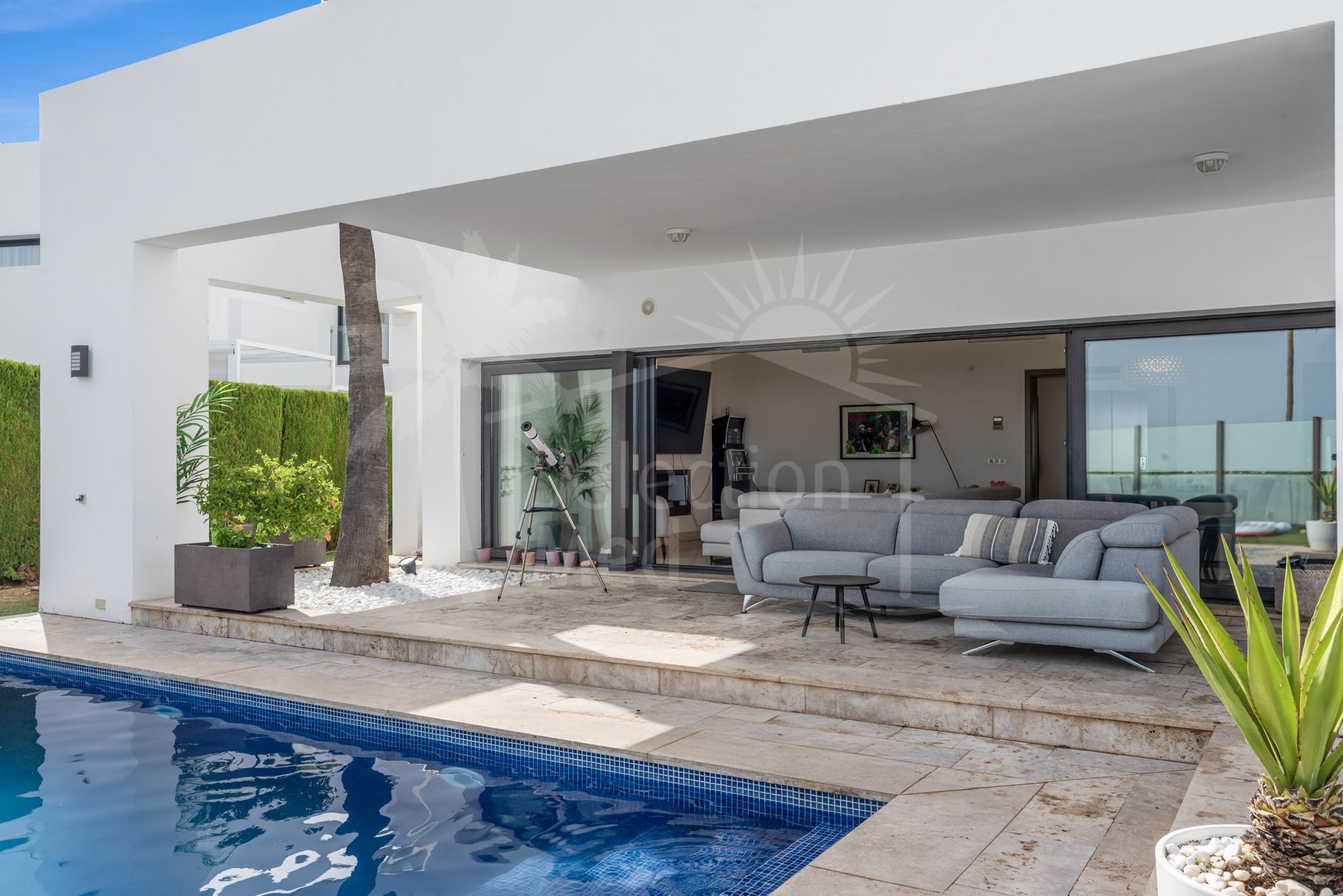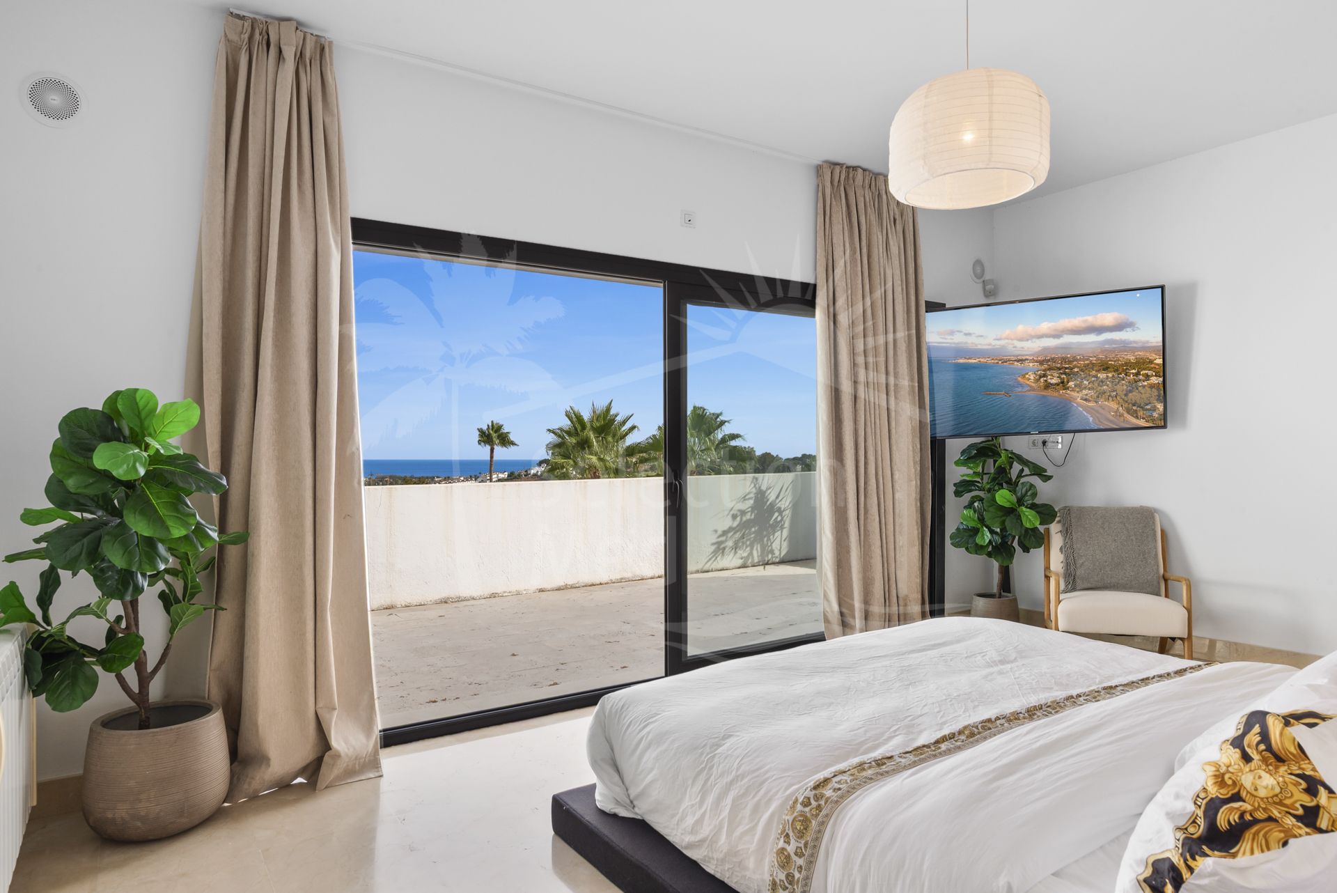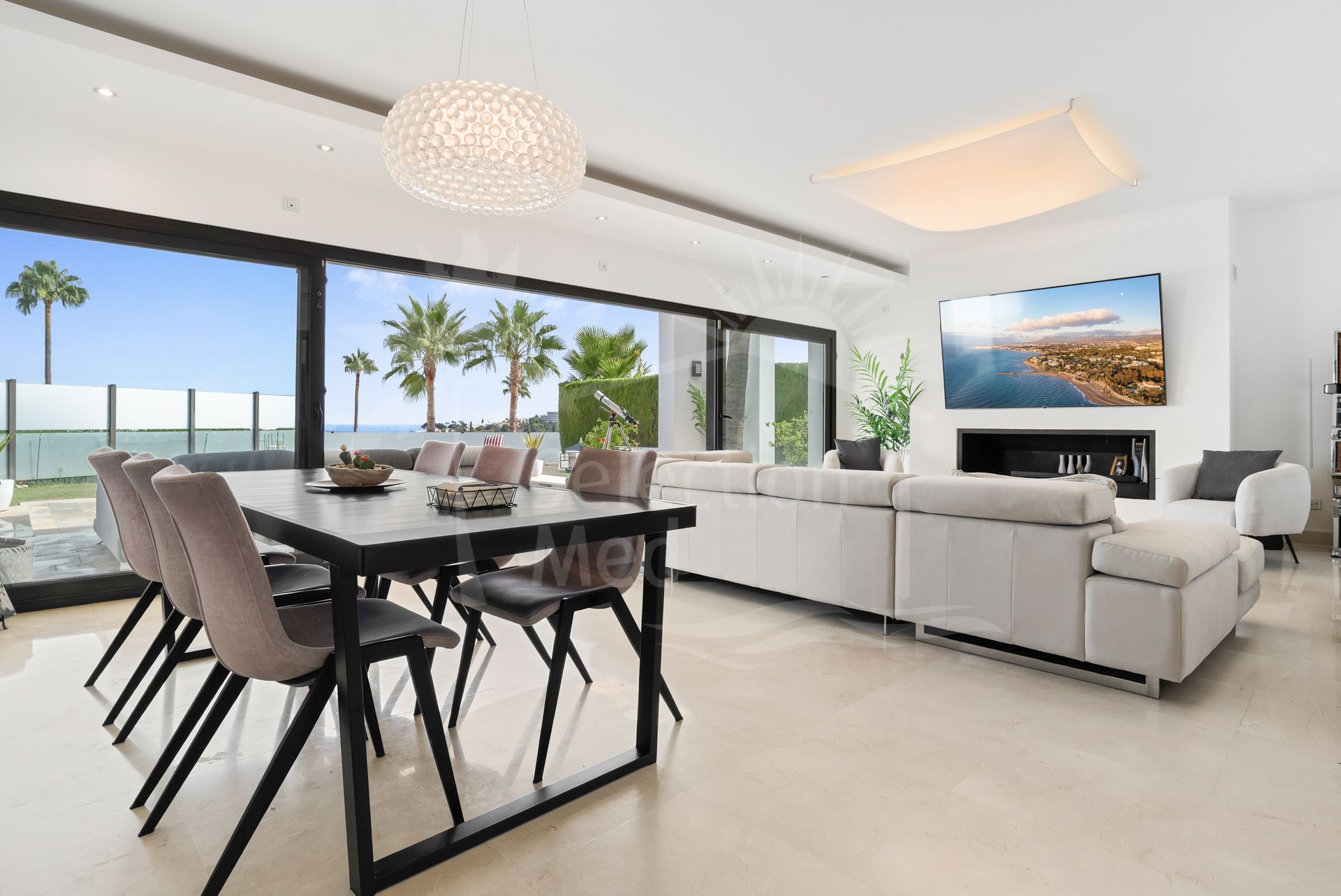 The interior comes fully furnished, showcasing a sleek, fully fitted kitchen, a bright dining room, and an inviting living area. Floor-to-ceiling glass doors flood the home with natural light while framing panoramic vistas of the sea, mountains, golf course, and surrounding greenery. Enjoy unobstructed views stretching across the coastline, a spectacular setting for entertaining or sunset cocktails.