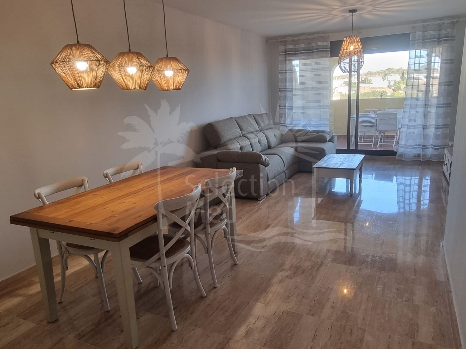 Spacious living-dining room with direct access to the terrace, half glazed and half open, perfect for year-round use.