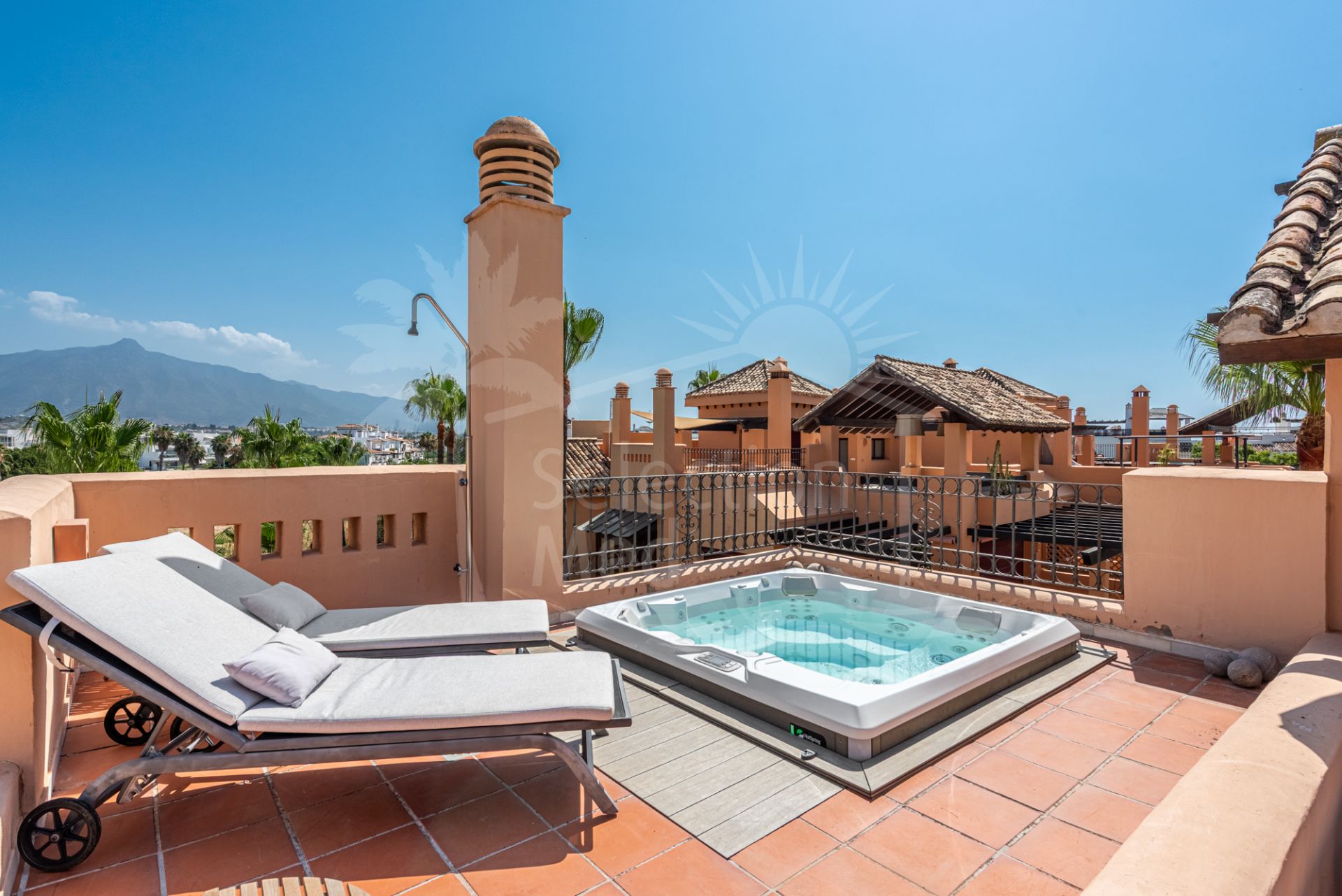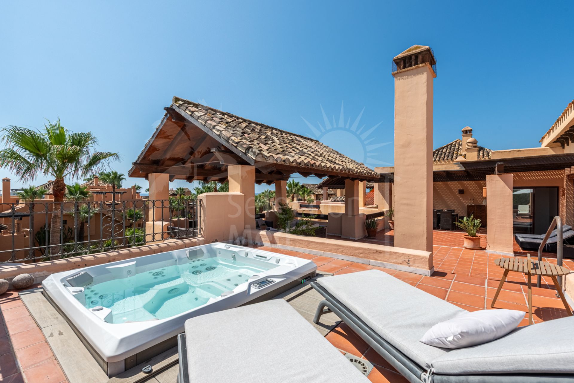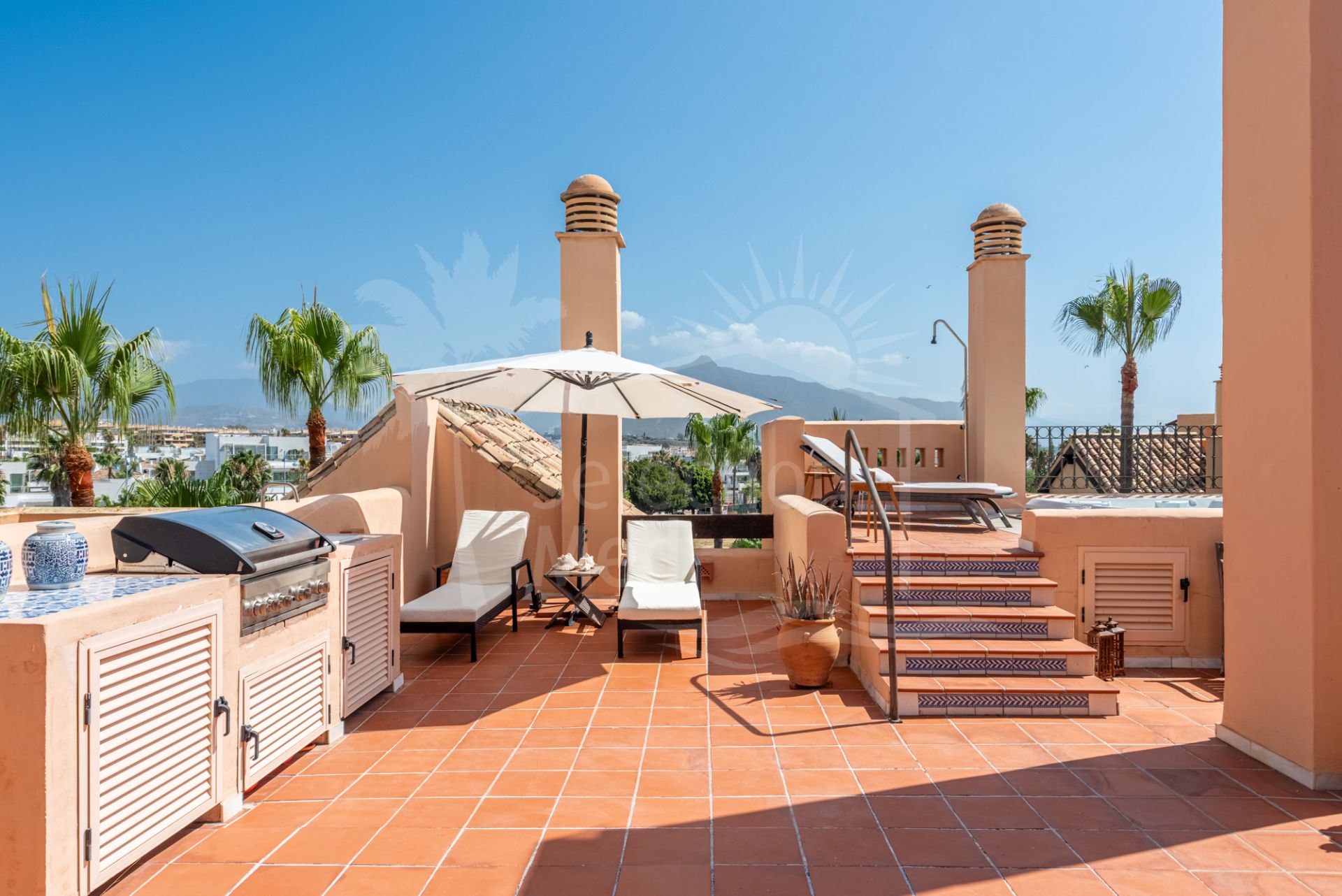 Step into a true outdoor paradise with this exceptional beachside penthouse in the sought-after Bahía Alcántara urbanisation. The standout feature of this remarkable property is its immense solarium terrace of more than 150 m² — an outdoor haven that feels like a second apartment in the sky. Here you will enjoy sea and mountain views, a stylish covered gazebo lounge area, a jacuzzi, outdoor kitchen/BBQ, covered dining area, and ample space for sunbathing and entertaining under the Mediterranean sun.