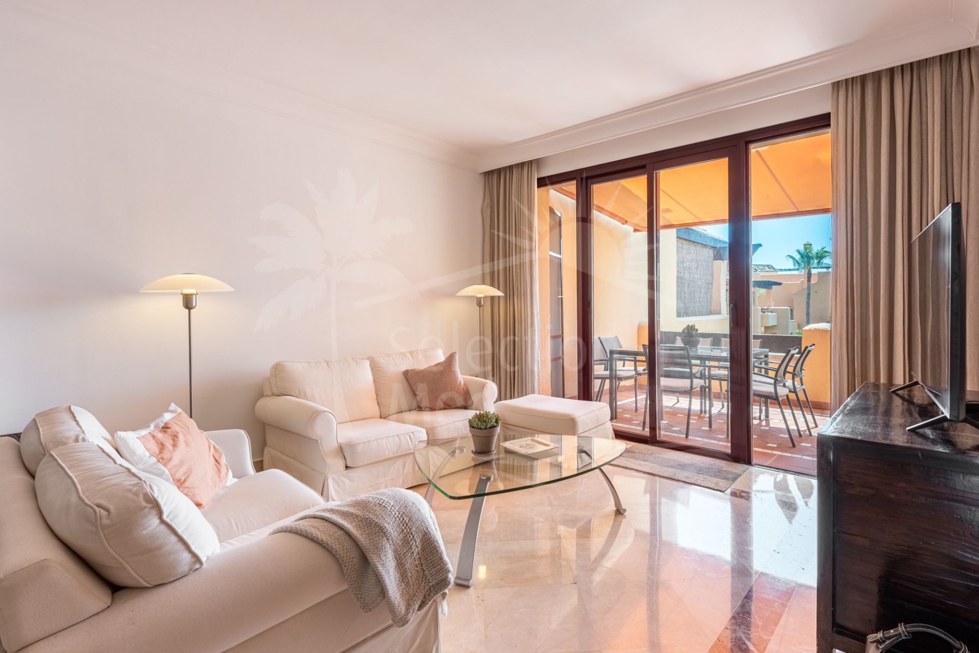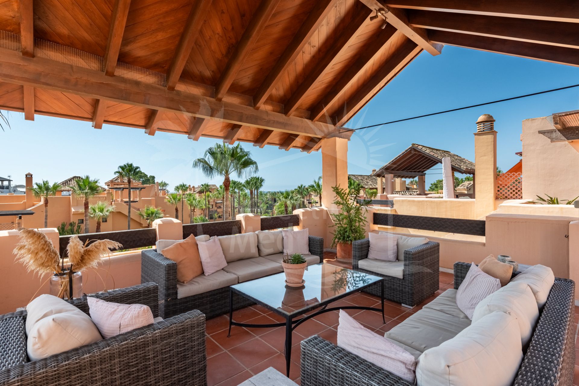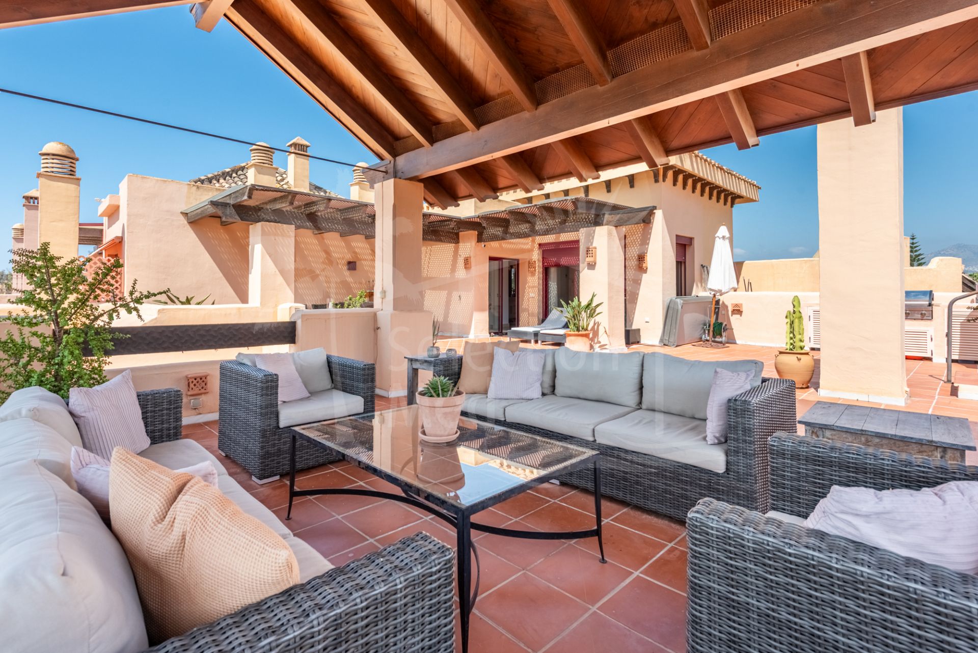 Step into a true outdoor paradise with this exceptional beachside penthouse in the sought-after Bahía Alcántara urbanisation. The standout feature of this remarkable property is its immense solarium terrace of more than 150 m² — an outdoor haven that feels like a second apartment in the sky. Here you will enjoy sea and mountain views, a stylish covered gazebo lounge area, a jacuzzi, outdoor kitchen/BBQ, covered dining area, and ample space for sunbathing and entertaining under the Mediterranean sun.