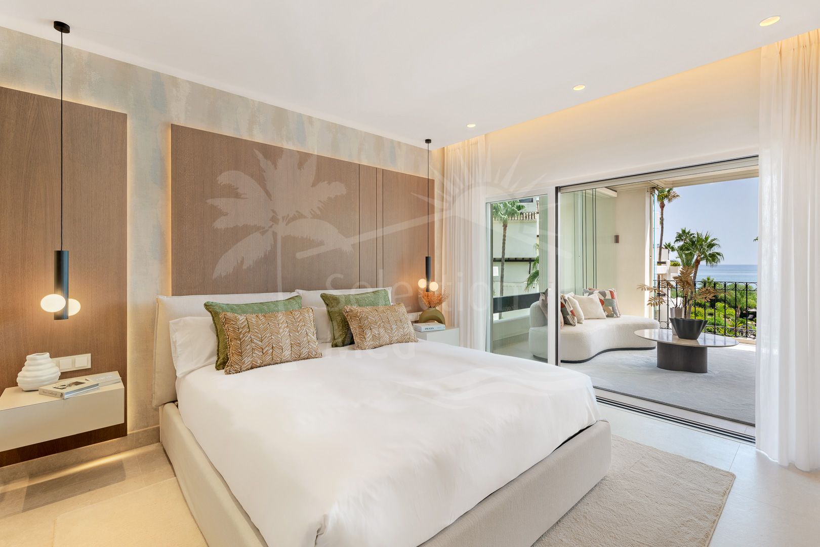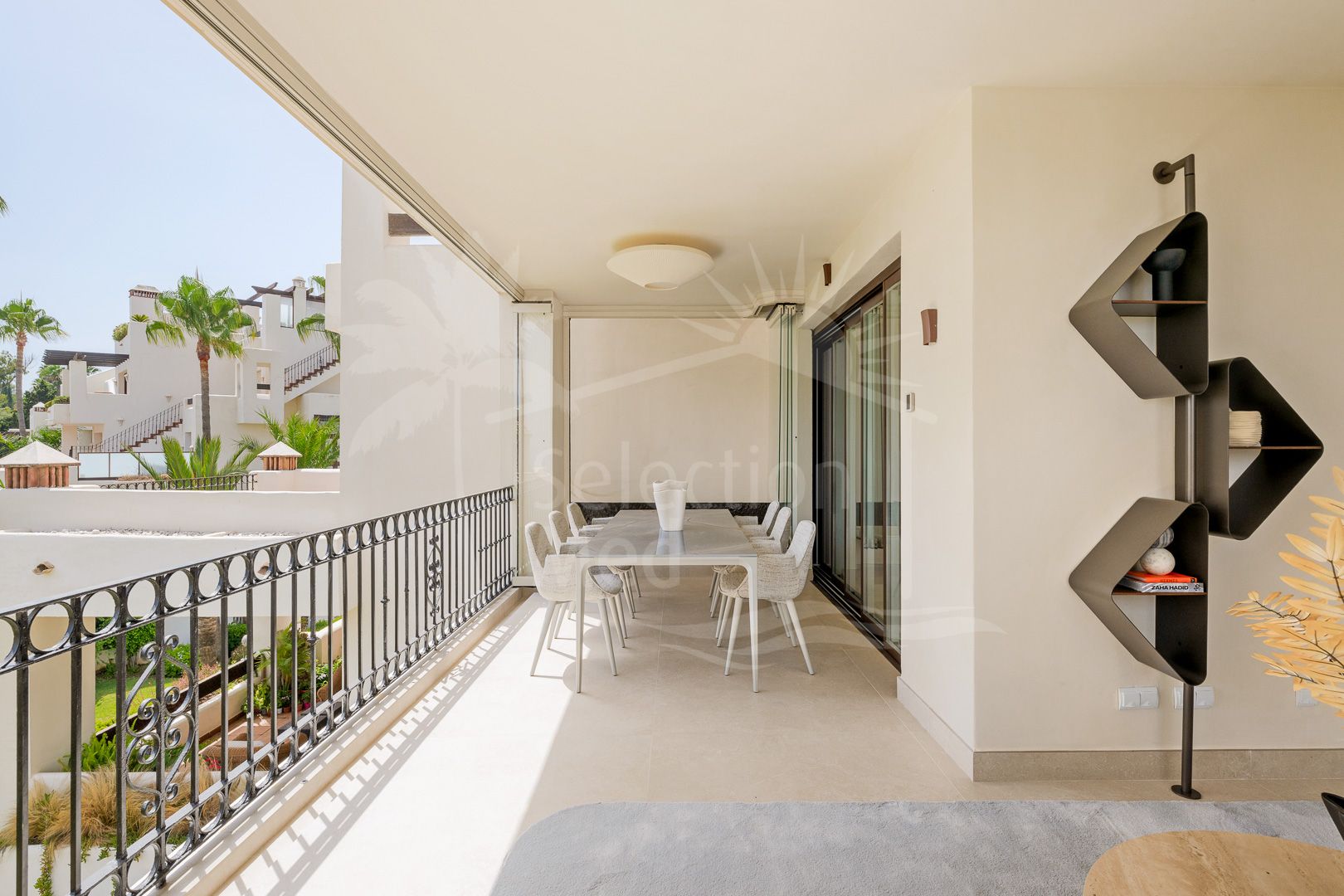 This fully renovated apartment offers beautiful views of the surrounding landscape and sea. With underfloor heating and a glass curtain, the balcony extends the lounge area offering more living comfort. The modern design and high-end finishes ensure a stylish and functional living experience in every detail.