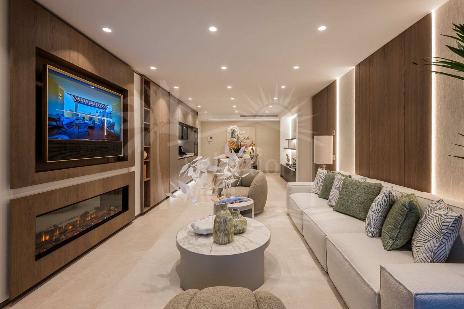 The apartment is filled with luxurious touches, including an open-plan designer kitchen with premium German appliances, high-quality flooring, sleek contemporary furniture, an electric fireplace, a Bang & Olufsen sound system, and custom-made wardrobes.