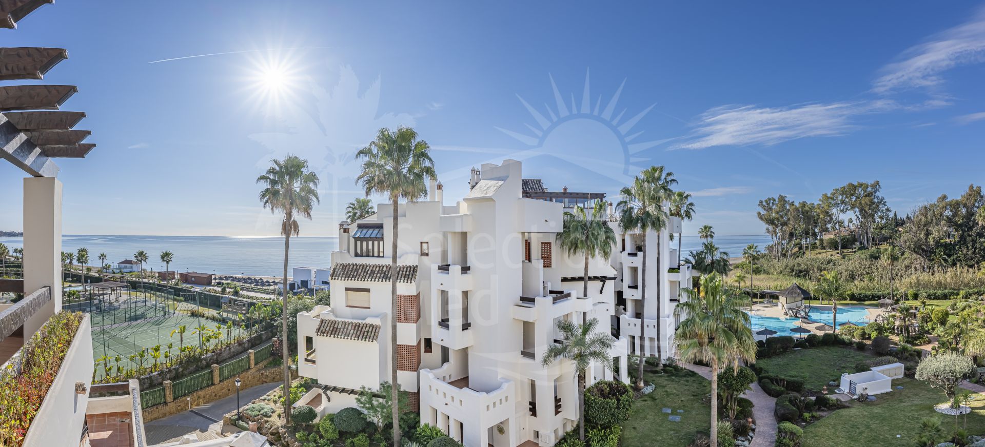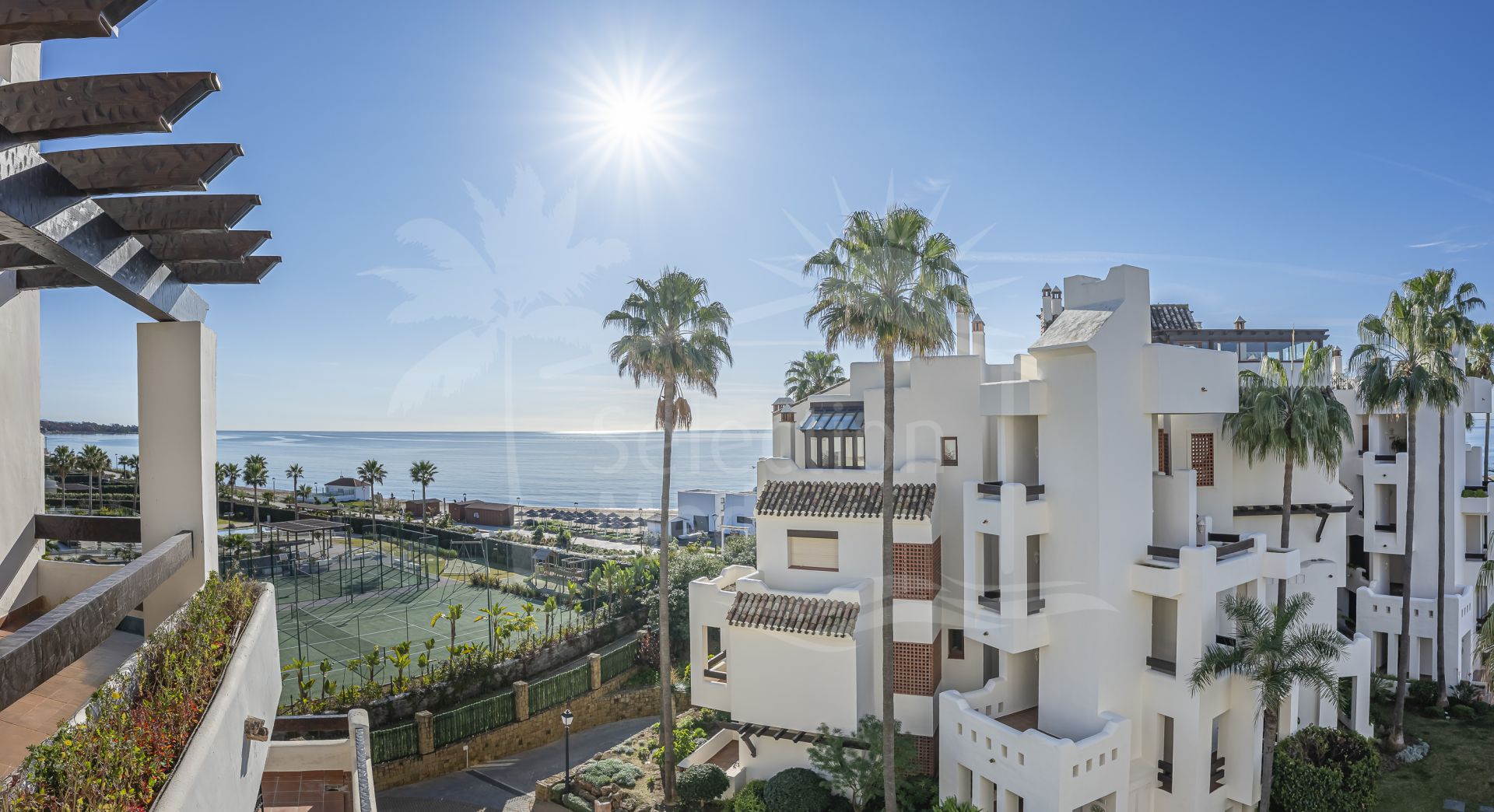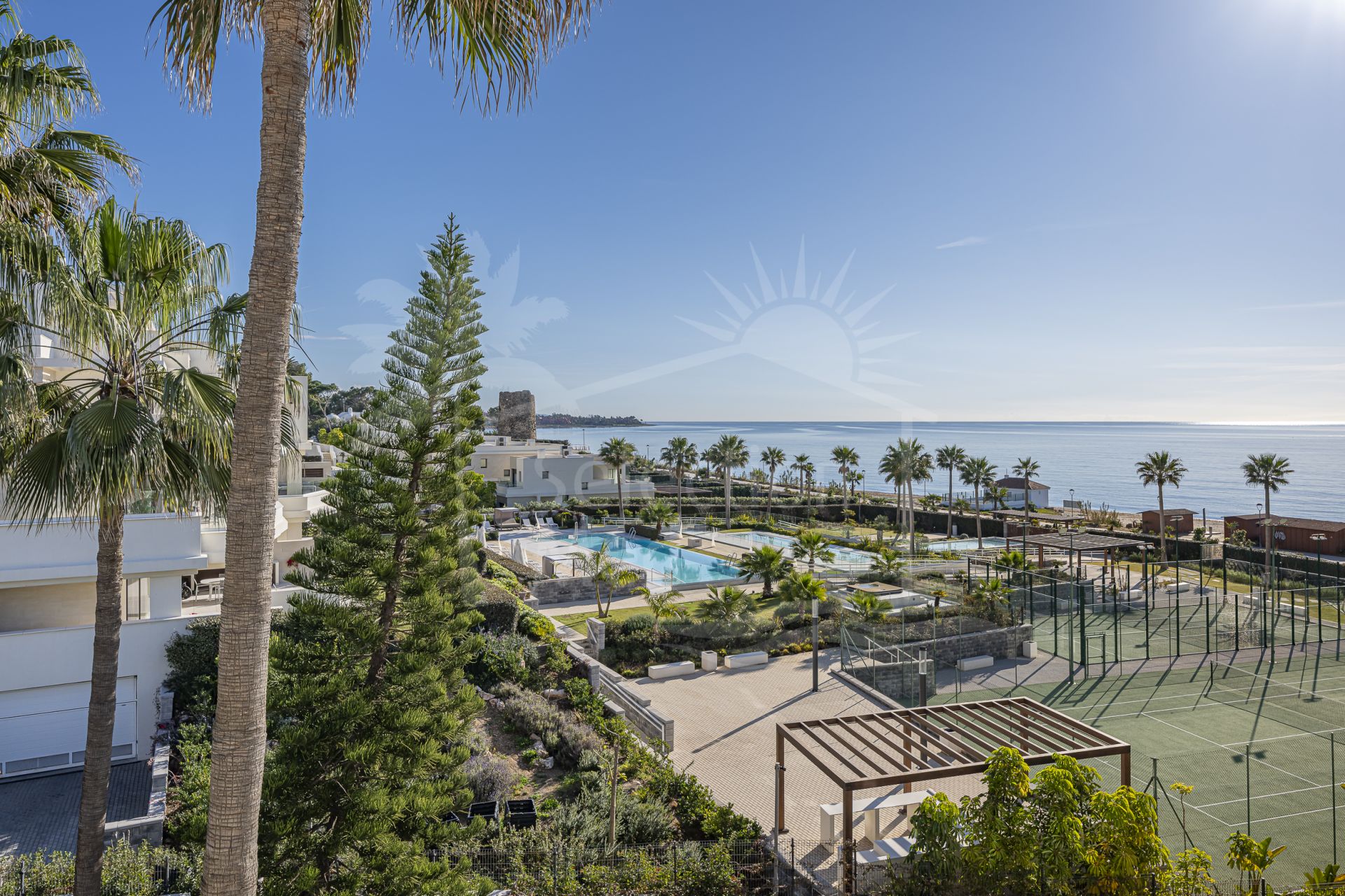 Located in the prestigious Bahía del Velerín development, perfectly positioned between Marbella and Estepona, this property offers a privileged lifestyle on the Costa del Sol. The gated community boasts beautifully landscaped tropical gardens, an impressive swimming pool with a poolside snack bar, and 24-hour security, ensuring privacy and peace of mind. Residents also enjoy direct access to one of the finest beaches in the area. The apartment is sold with a private underground parking space and a practical storage room.