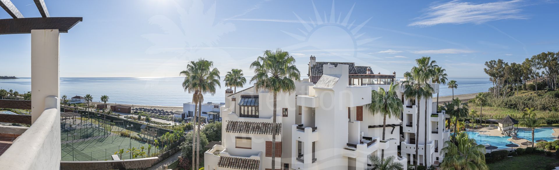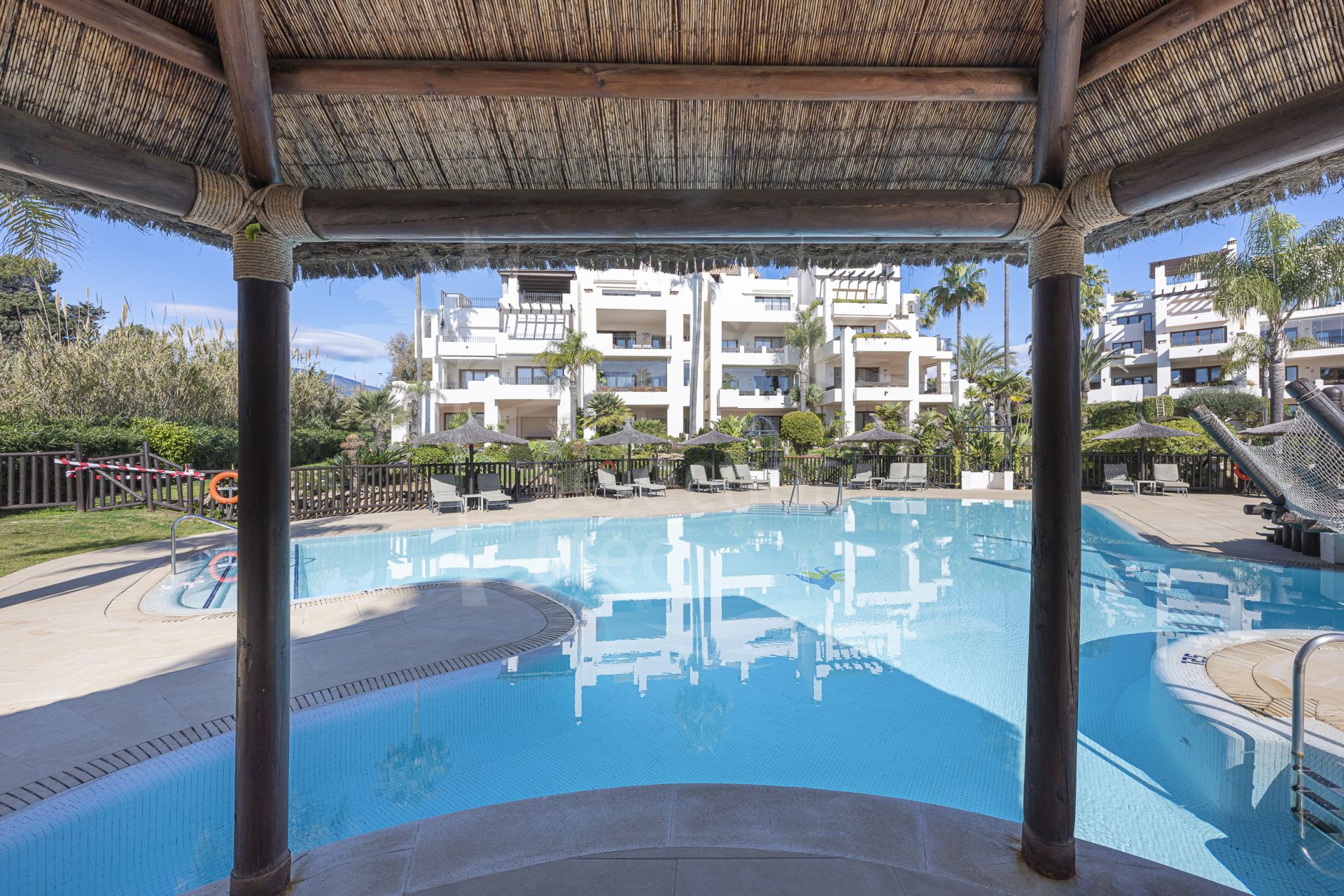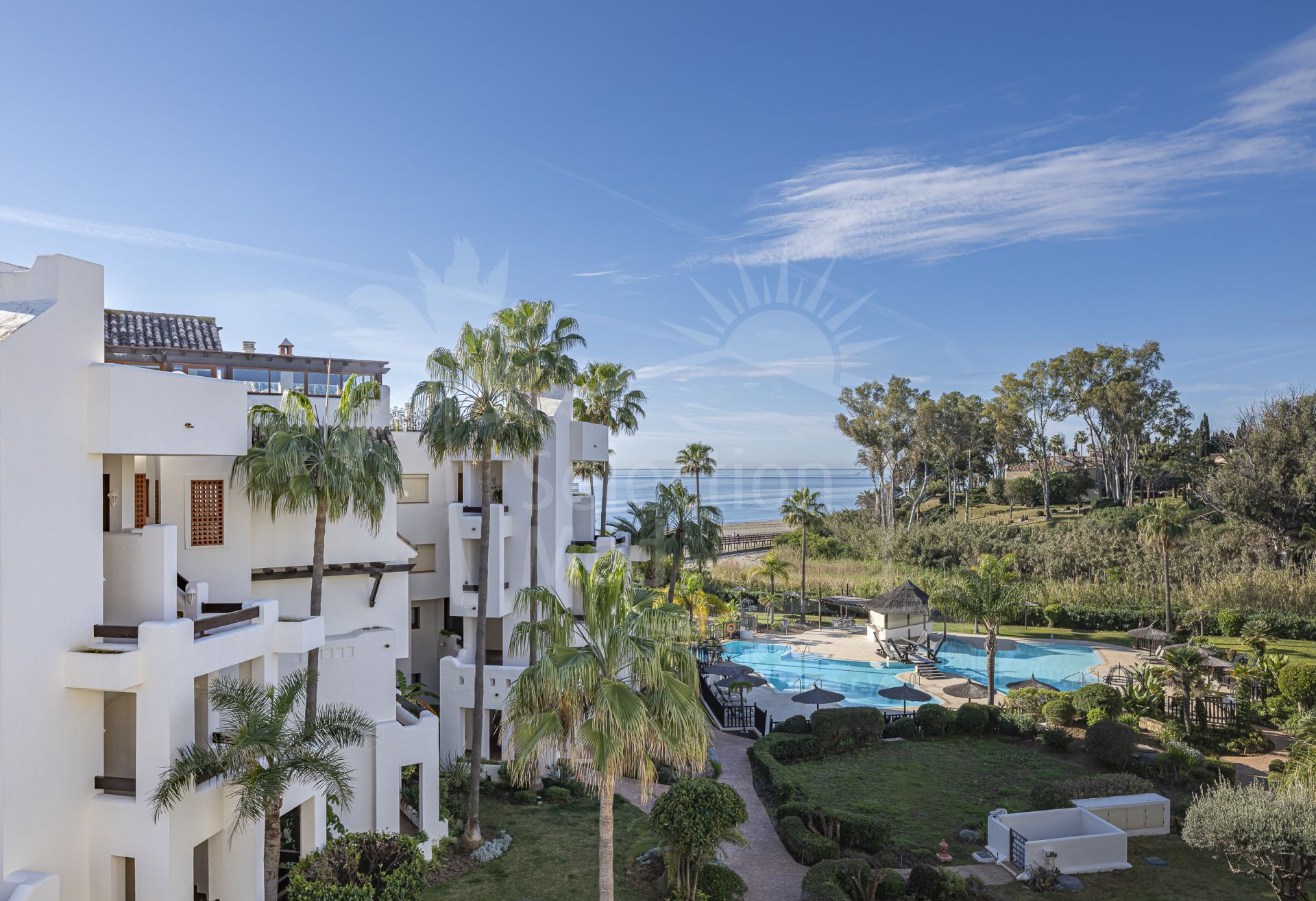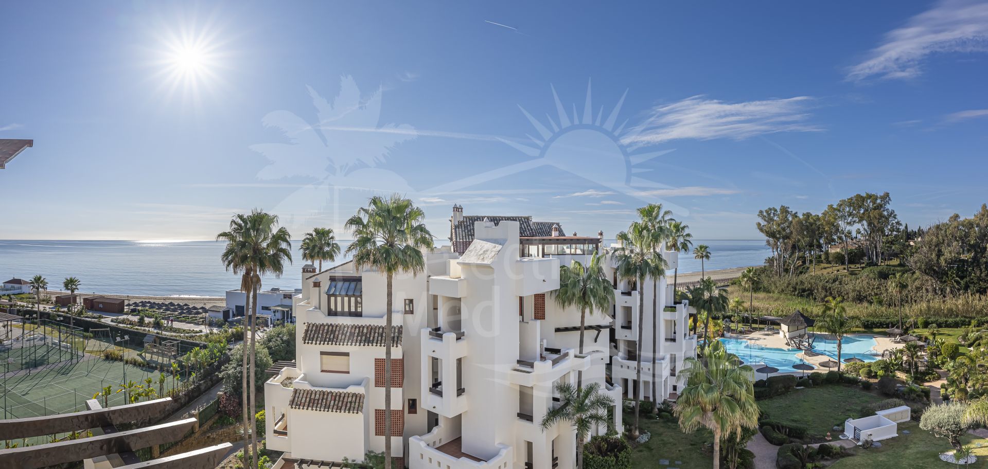 Located in the prestigious Bahía del Velerín development, perfectly positioned between Marbella and Estepona, this property offers a privileged lifestyle on the Costa del Sol. The gated community boasts beautifully landscaped tropical gardens, an impressive swimming pool with a poolside snack bar, and 24-hour security, ensuring privacy and peace of mind. Residents also enjoy direct access to one of the finest beaches in the area. The apartment is sold with a private underground parking space and a practical storage room.