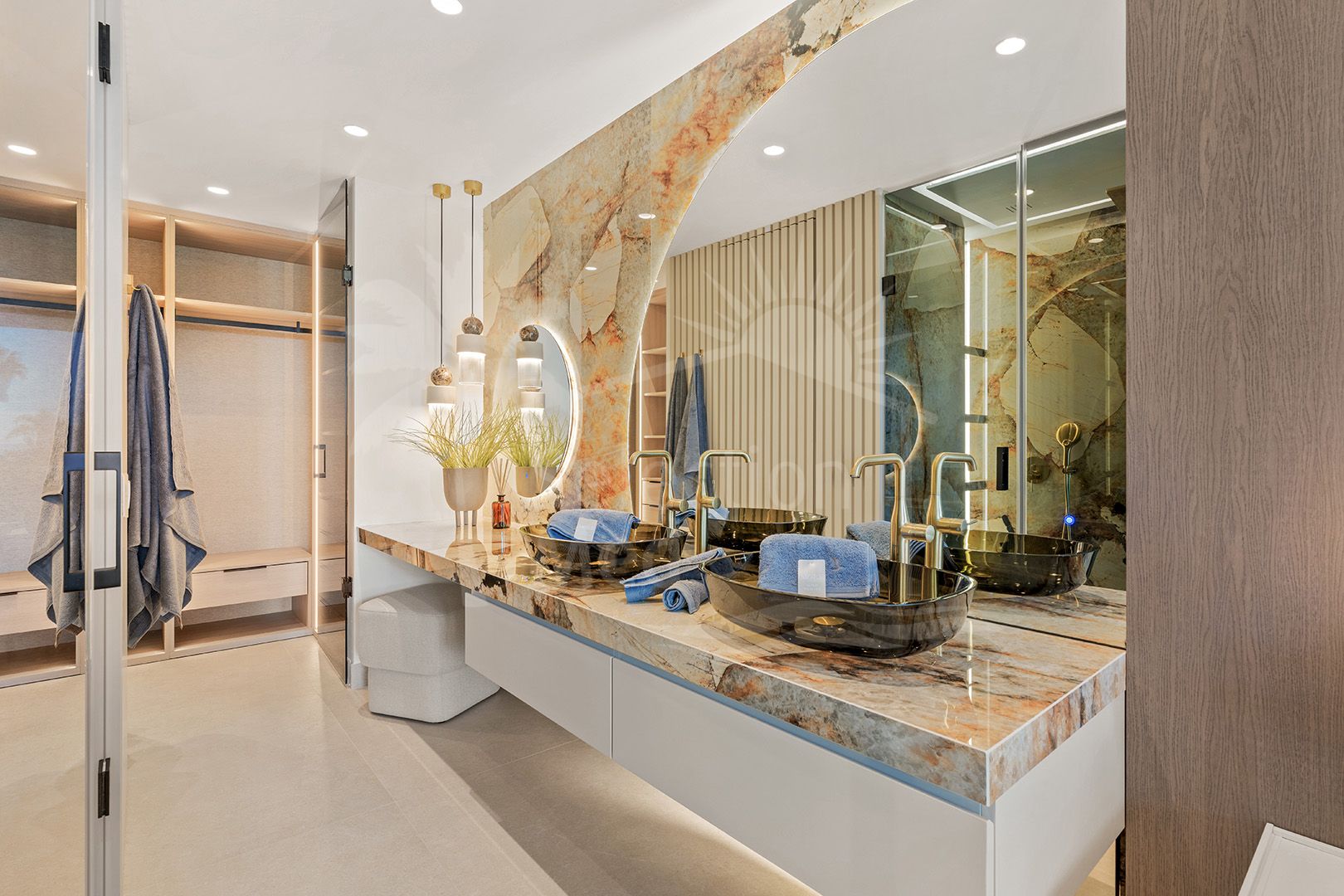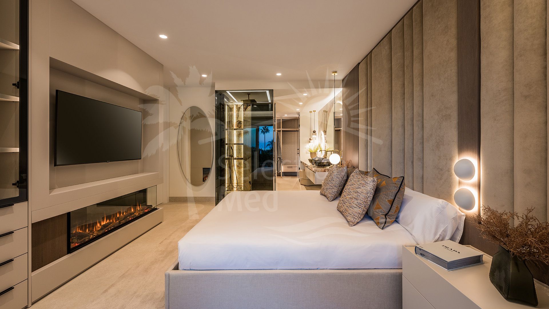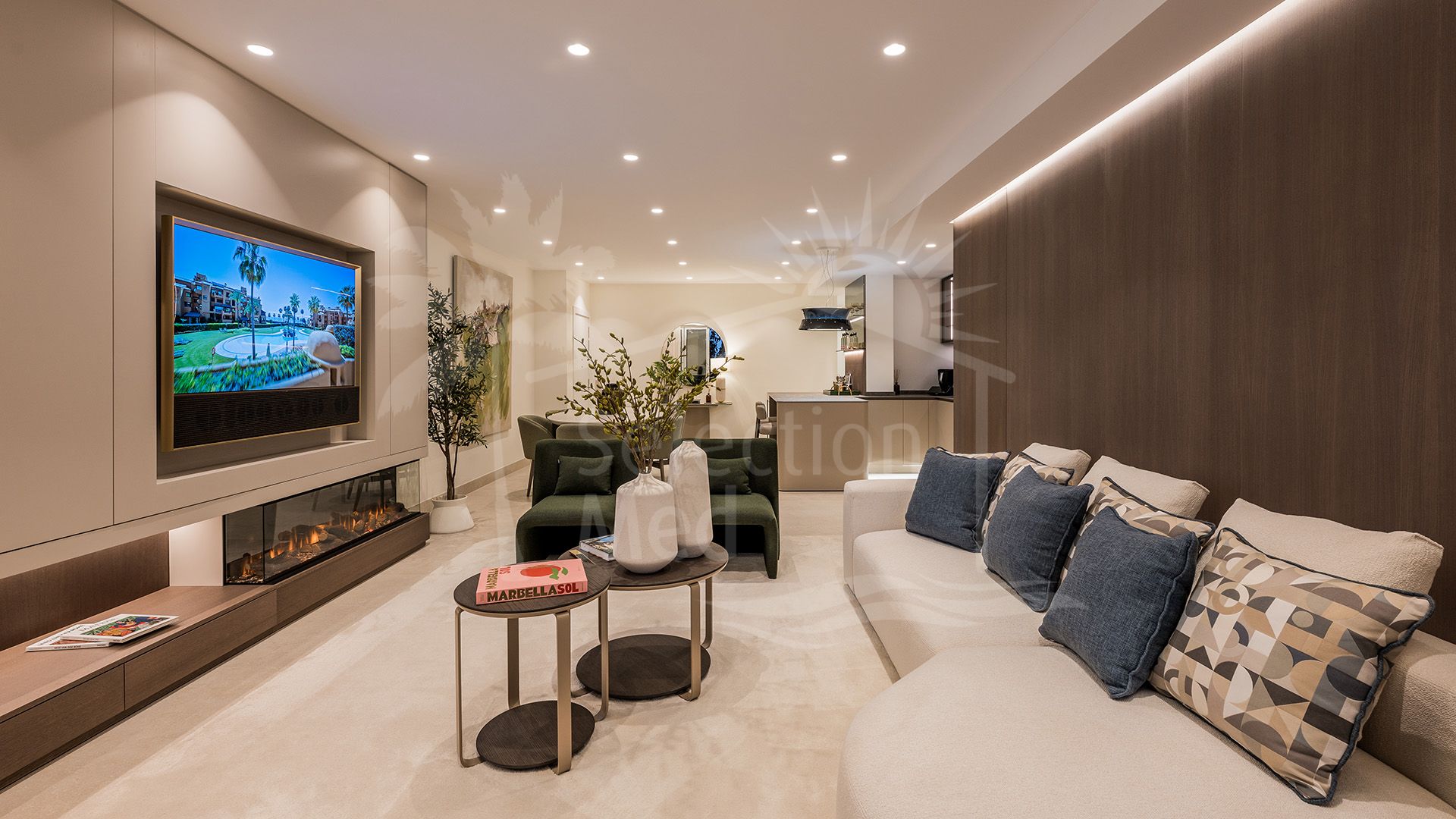 Inside, the property offers a bright open-concept living area finished to a high standard. The interior includes bespoke built-in wardrobes, stylish flooring, a modern electric fireplace, and a premium Bang & Olufsen sound system. The contemporary designer kitchen comes fully fitted with quality appliances and connects effortlessly with the living space. Large doors lead out to the terrace, where you can enjoy beautiful sea views. The apartment is sold fully furnished and is ready for immediate occupancy.