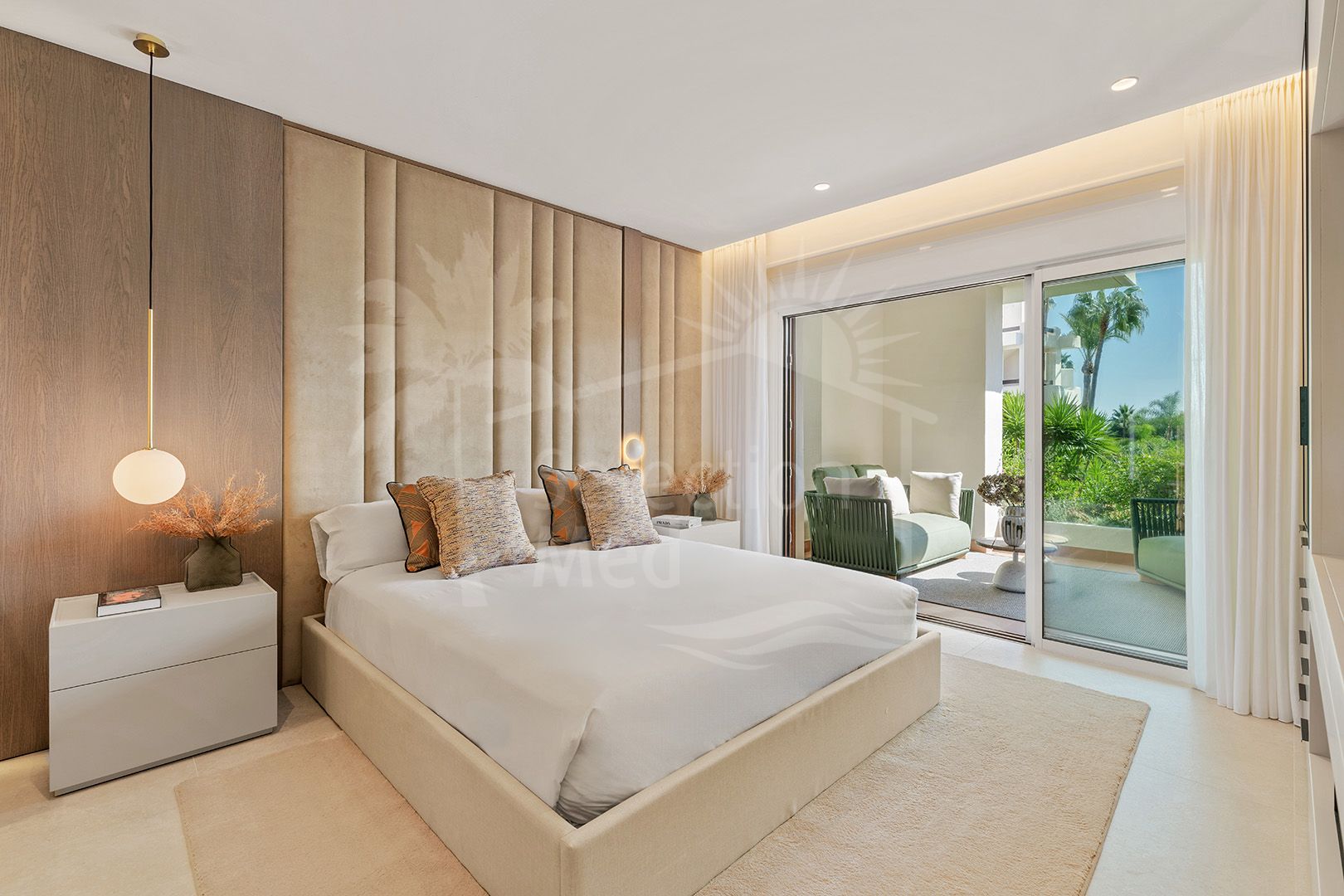 The open-plan living space combines a designer kitchen with integrated appliances and an elegant sitting area centred on an electric feature fireplace and Bang-Olufsen audio system. Full-height doors slide back to a private, south-facing terrace where you can dine or relax while enjoying filtered sea views and direct access to the gardens.