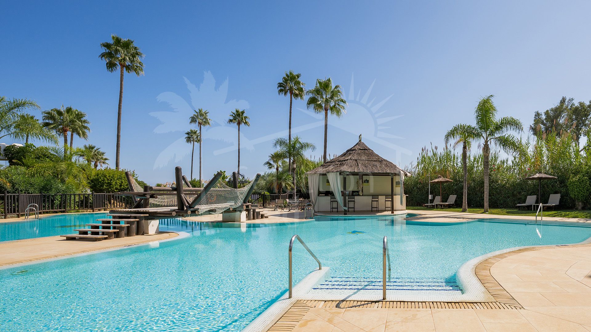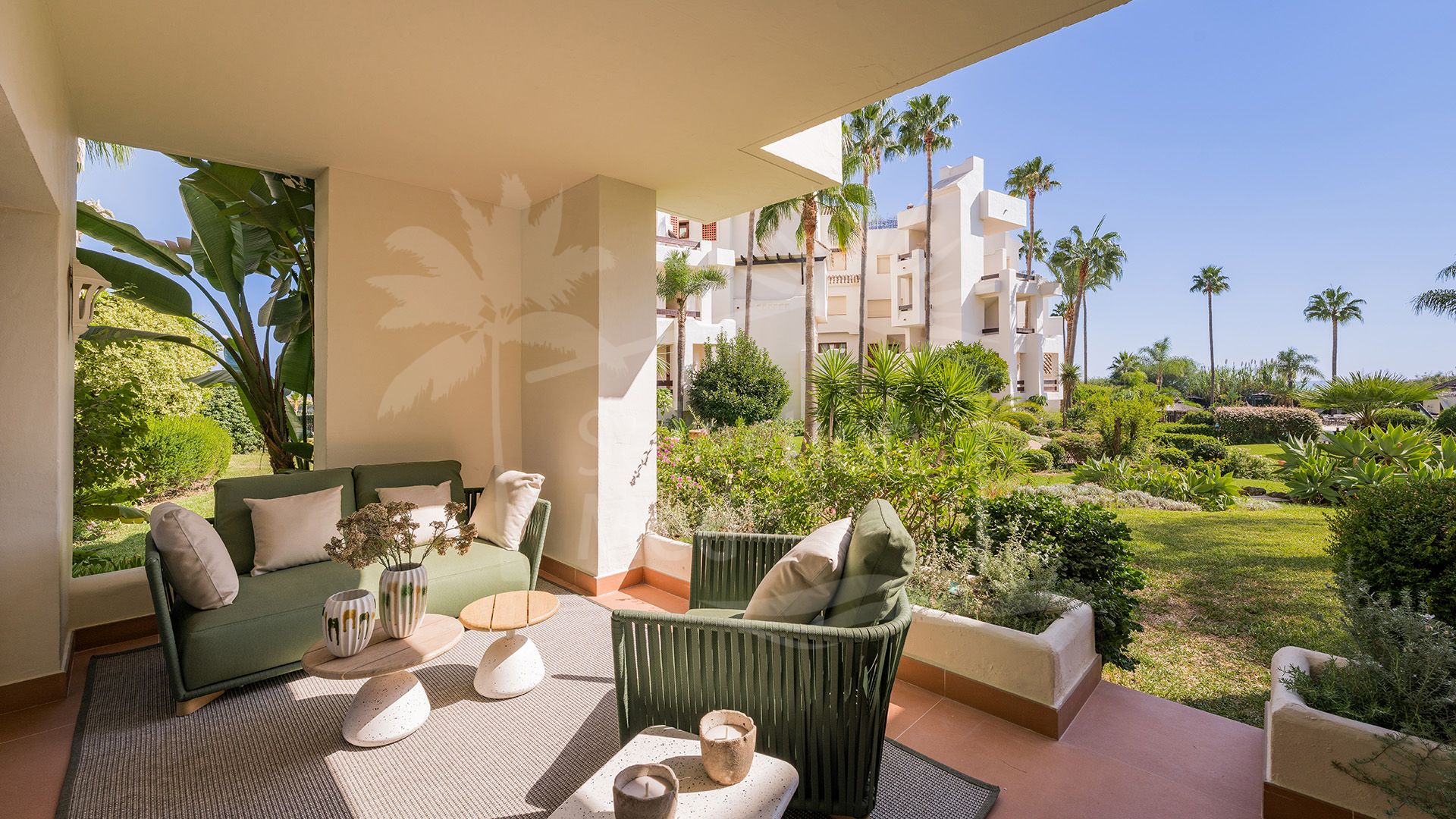 Set between Marbella and Estepona on the sought-after New Golden Mile, this three-bedroom, two-bathroom apartment sits in Bahía del Velerín—a gated, beachfront community known for twenty-four-hour security, lush tropical gardens and a residents’ pool with snack bar. An underground parking bay and separate storage room are included.