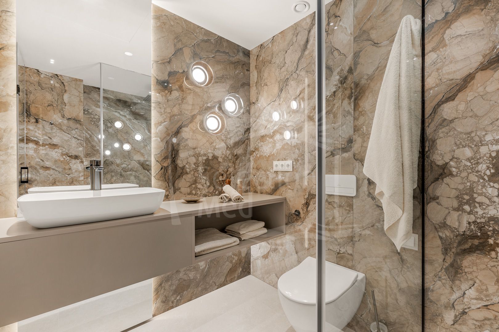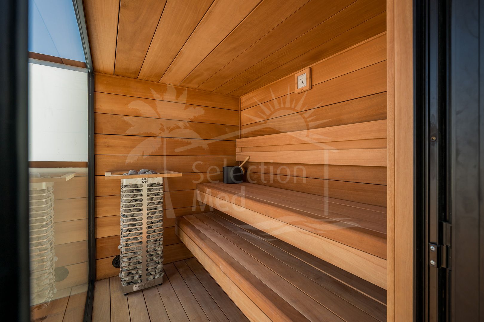 The rooftop terrace is the centrepiece, offering panoramic views across the Mediterranean and the Estepona coastline. This private space is designed for relaxation and entertaining, with several seating and dining areas, a jacuzzi, sauna, and a second kitchen fitted with premium appliances such as a wine cooler, double dishwasher, and dumbwaiter.
