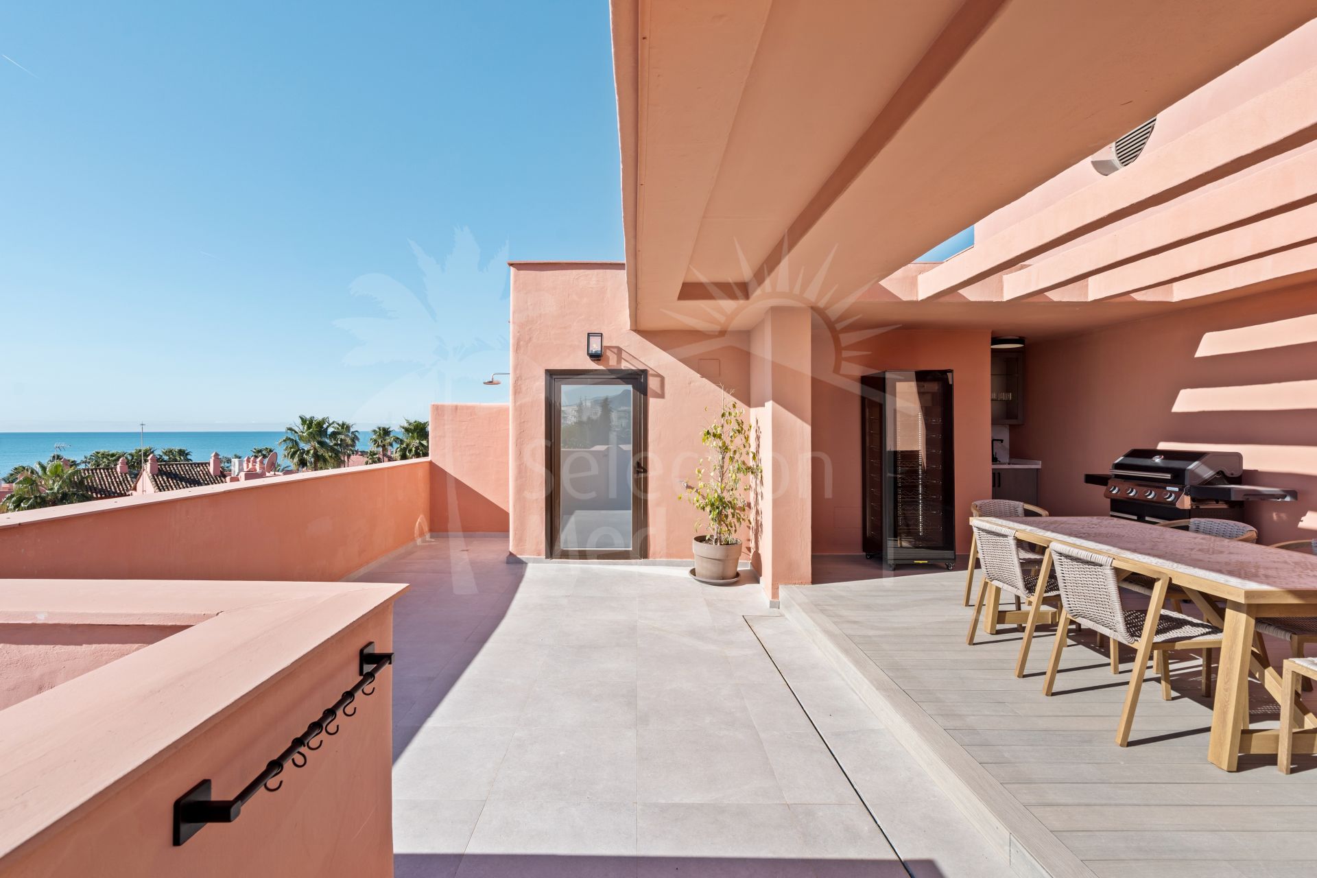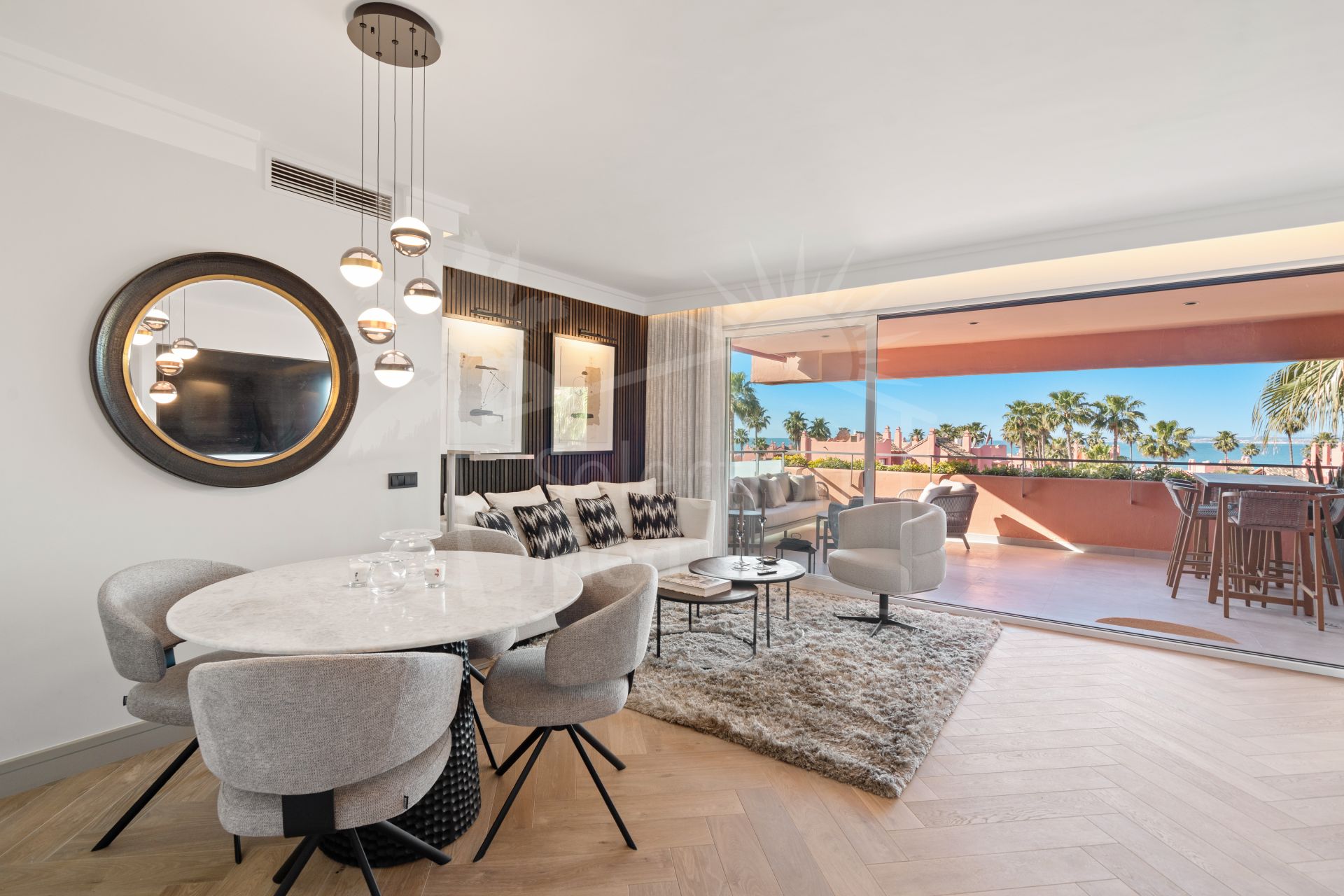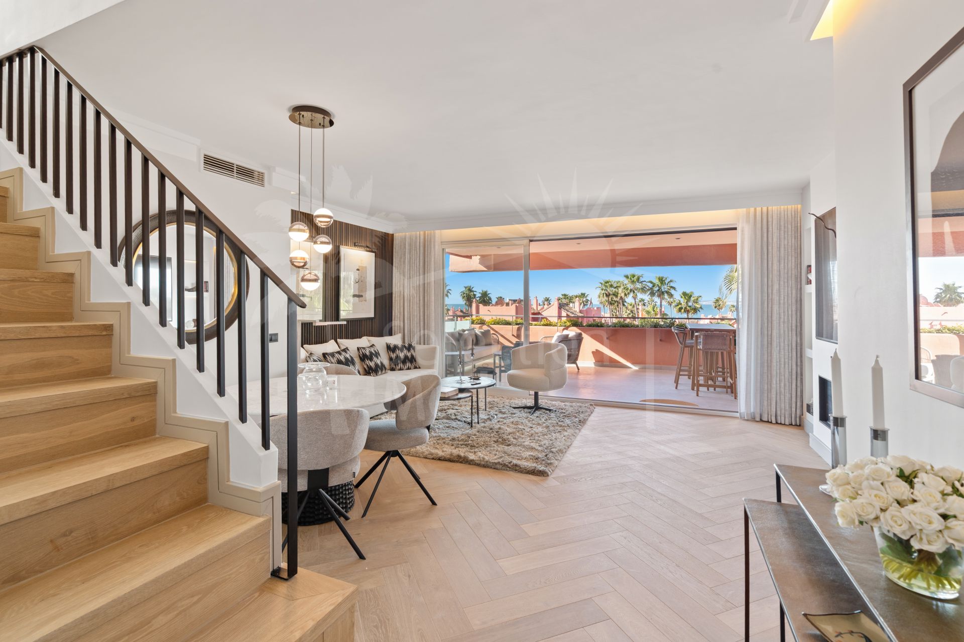 Luxury redefined by the sea. Set within the secure gates of Las Salinas, this exquisite newly renovated beachside duplex penthouse with panoramic sea views spans 156 m² of bright interiors complemented by 65 m² of private terraces. The inviting living area opens toward a south‑facing terrace where glass doors frame panoramic sea views and the rhythm of the waves set the tone for the day, forming an effortless connection to the coast. Upstairs, the expansive rooftop terrace becomes your private retreat in the sky — the perfect place to share meals with friends, unwind beneath the stars, or simply take in the views.