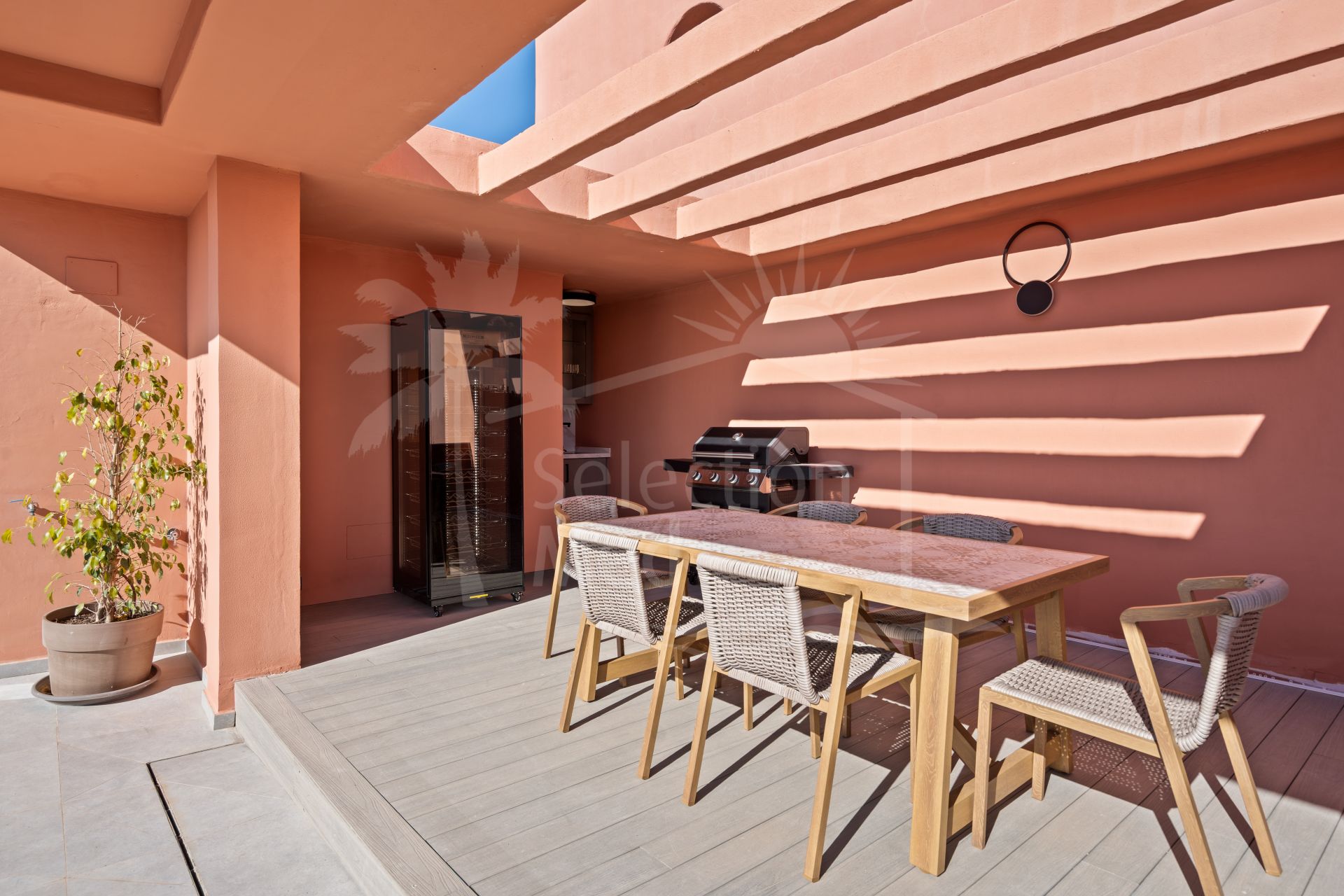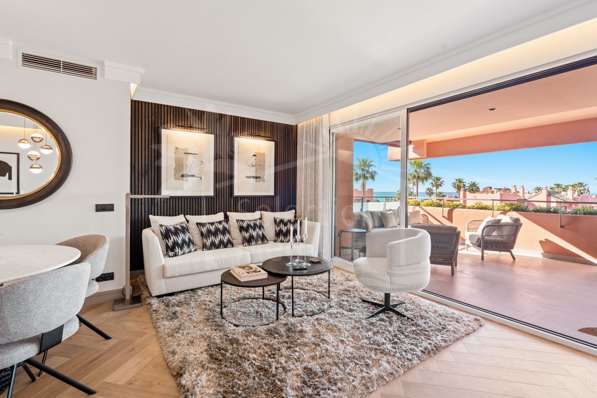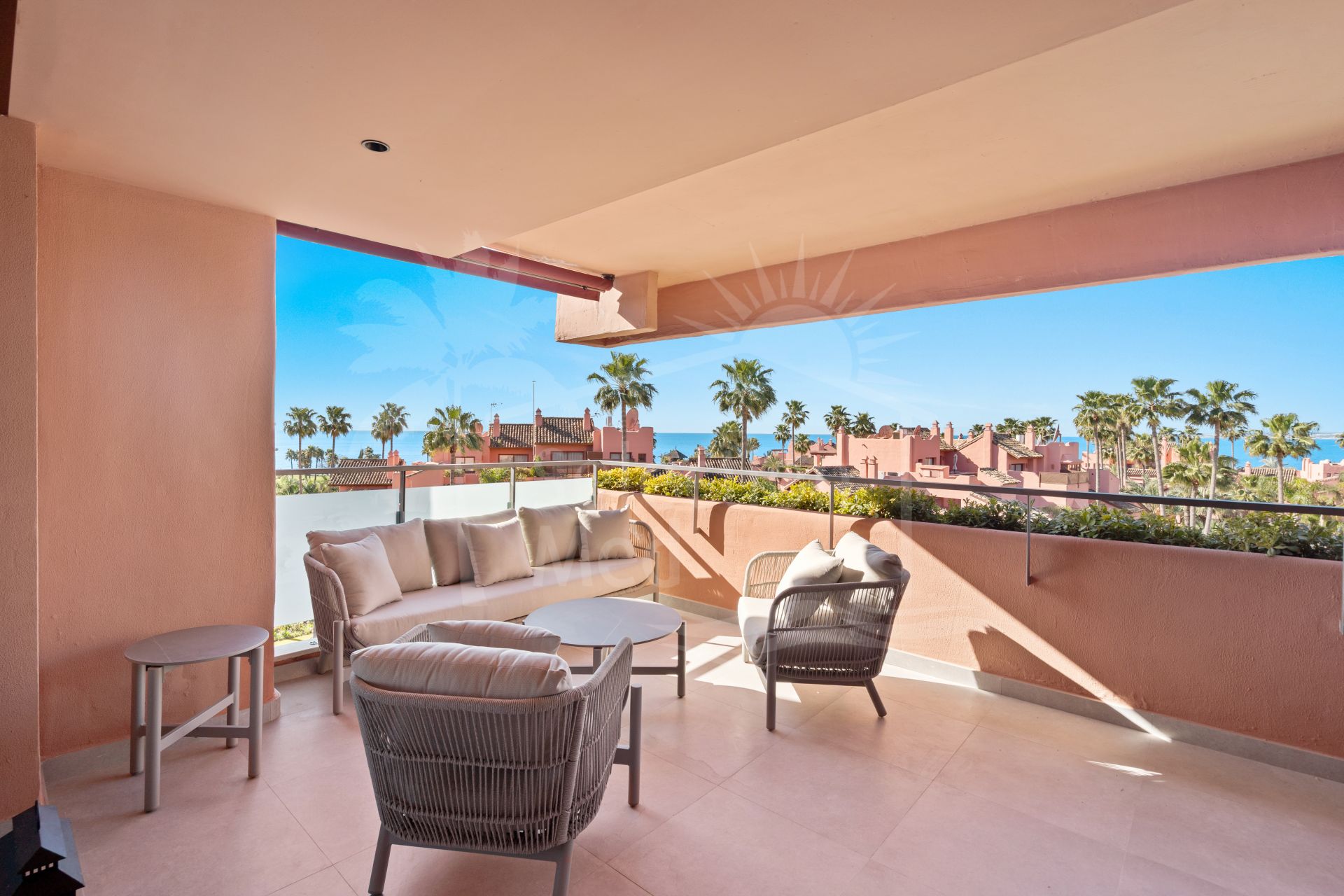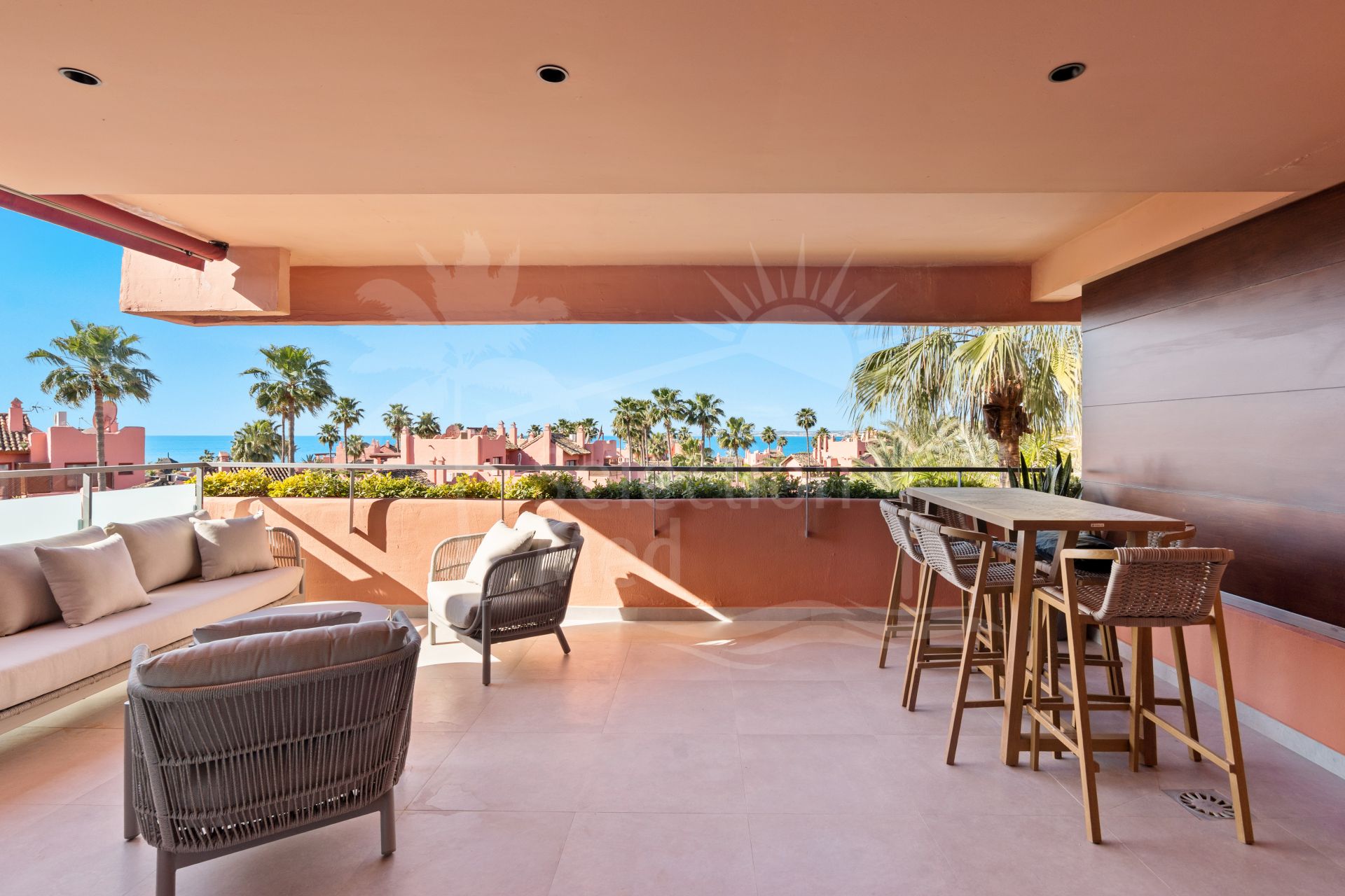 Luxury redefined by the sea. Set within the secure gates of Las Salinas, this exquisite newly renovated beachside duplex penthouse with panoramic sea views spans 156 m² of bright interiors complemented by 65 m² of private terraces. The inviting living area opens toward a south‑facing terrace where glass doors frame panoramic sea views and the rhythm of the waves set the tone for the day, forming an effortless connection to the coast. Upstairs, the expansive rooftop terrace becomes your private retreat in the sky — the perfect place to share meals with friends, unwind beneath the stars, or simply take in the views.