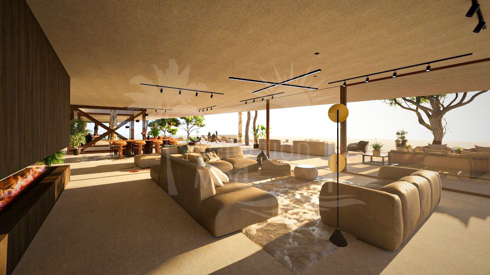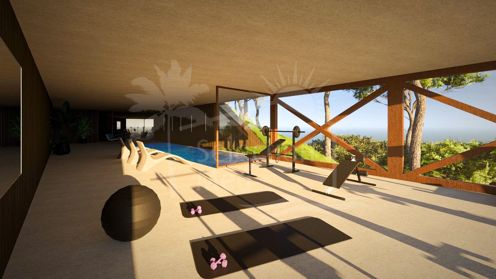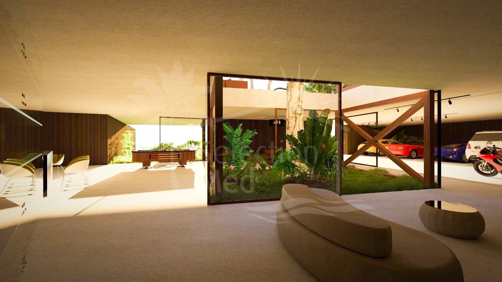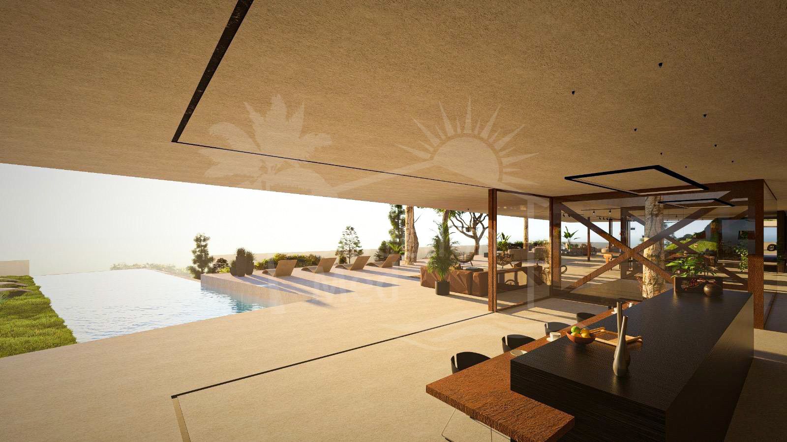 The upper floor is dedicated to the primary suite and additional guest bedrooms, each capturing panoramic views of the hills, golf course, and coastline. The rooftop solarium provides an intimate space for sunbathing, sunset views, or creating a private chill-out zone.