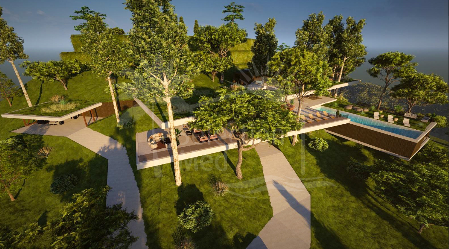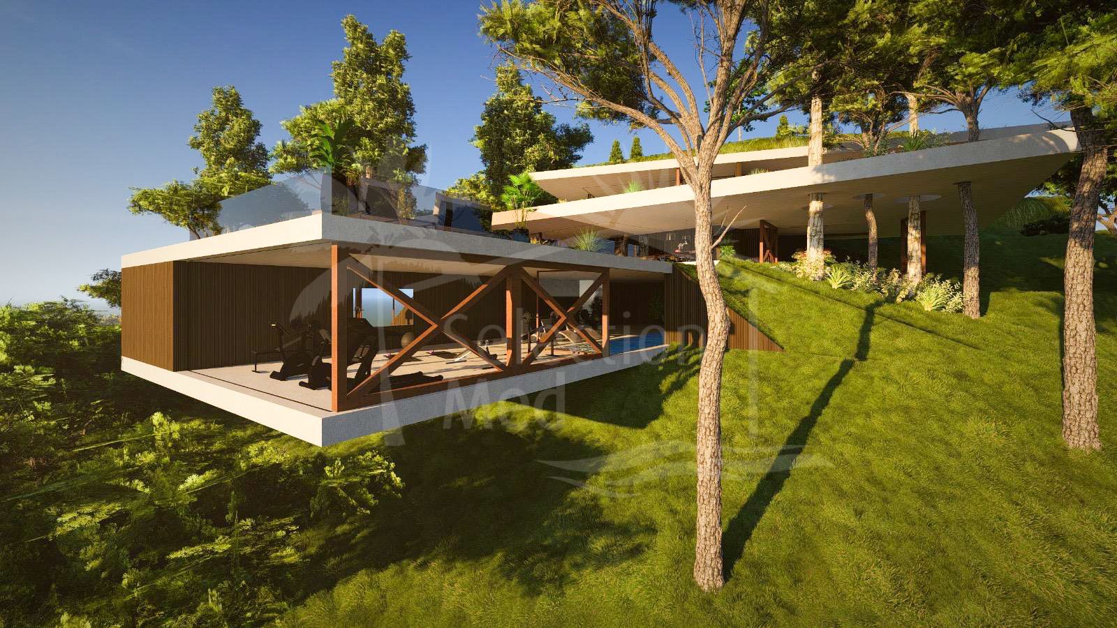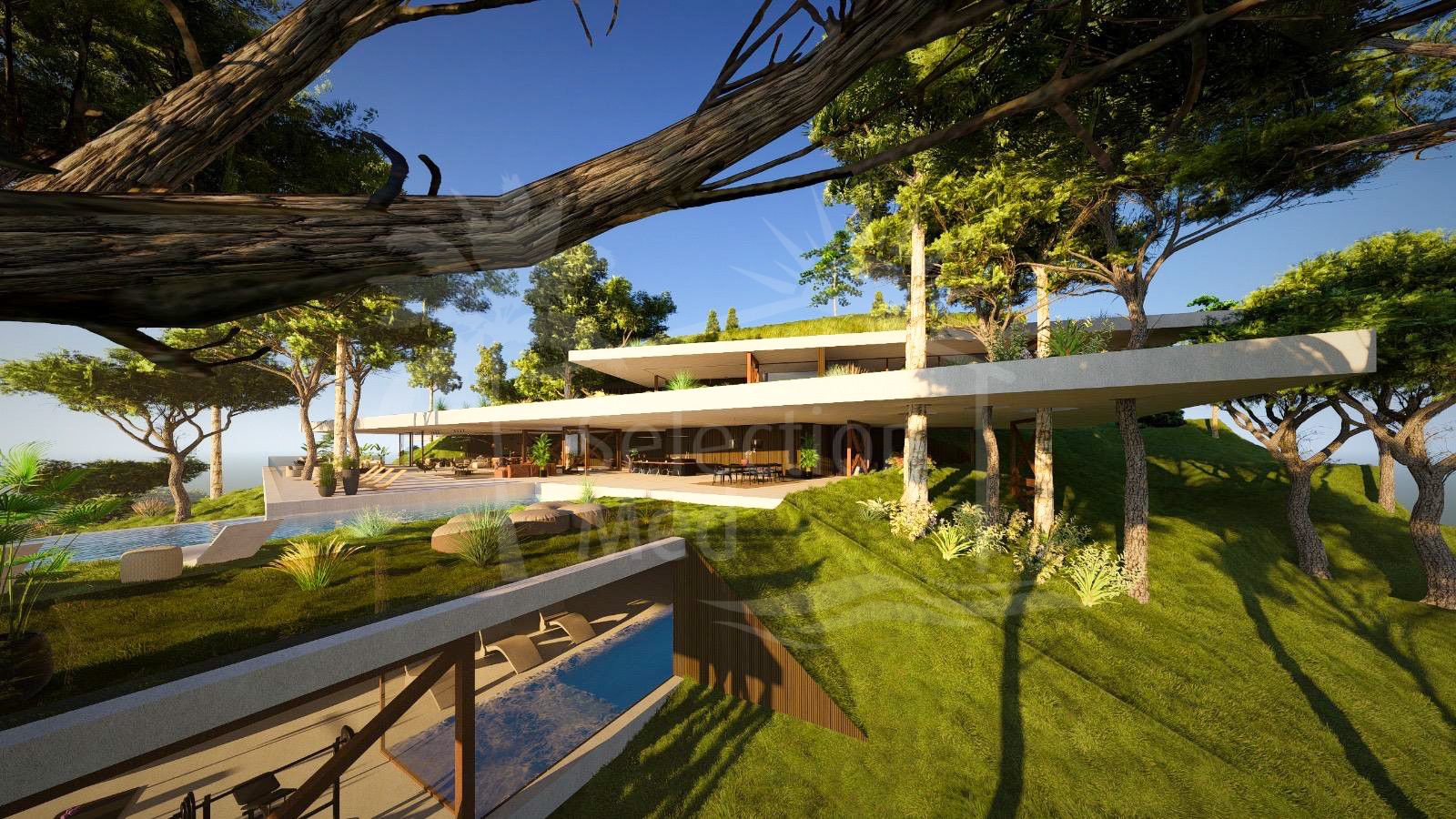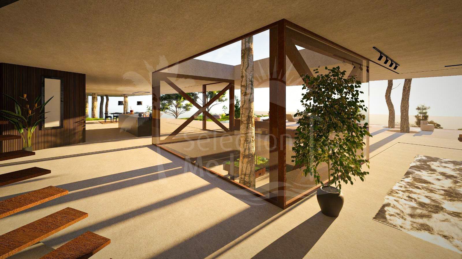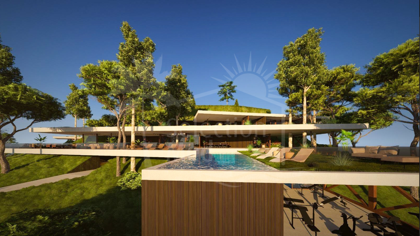 The upper floor is dedicated to the primary suite and additional guest bedrooms, each capturing panoramic views of the hills, golf course, and coastline. The rooftop solarium provides an intimate space for sunbathing, sunset views, or creating a private chill-out zone.