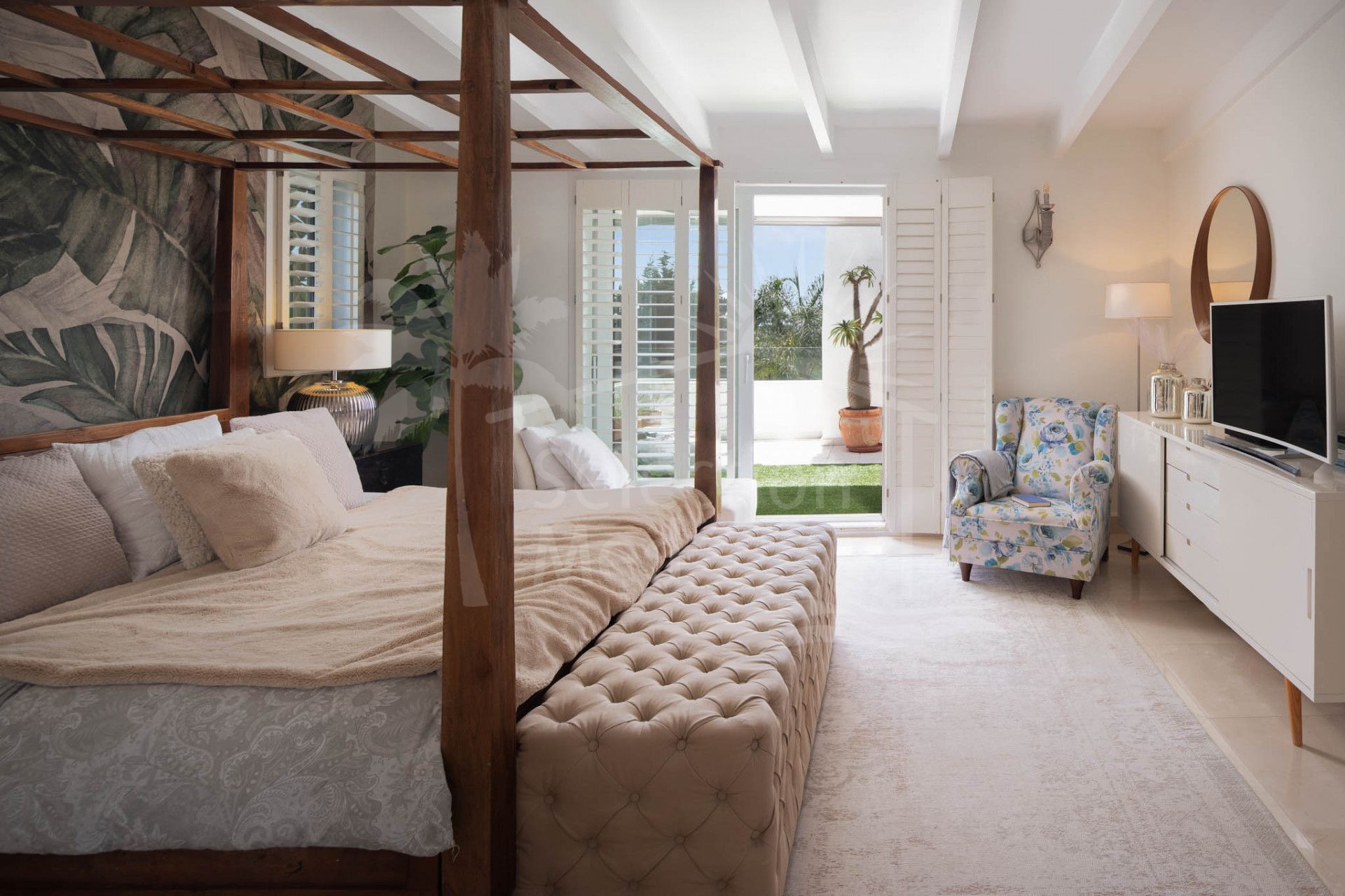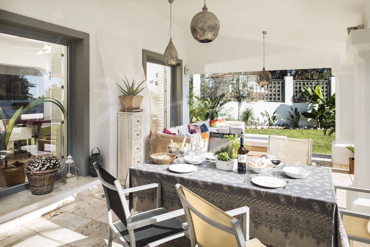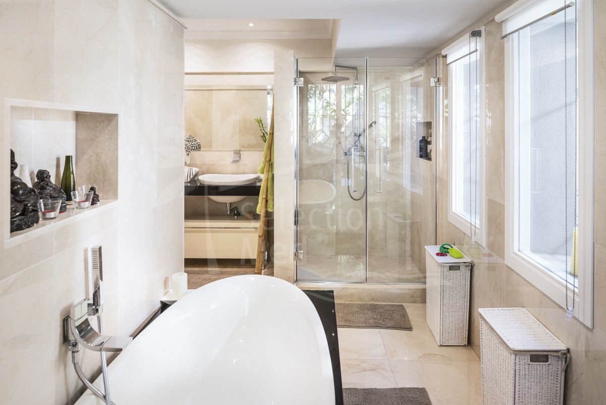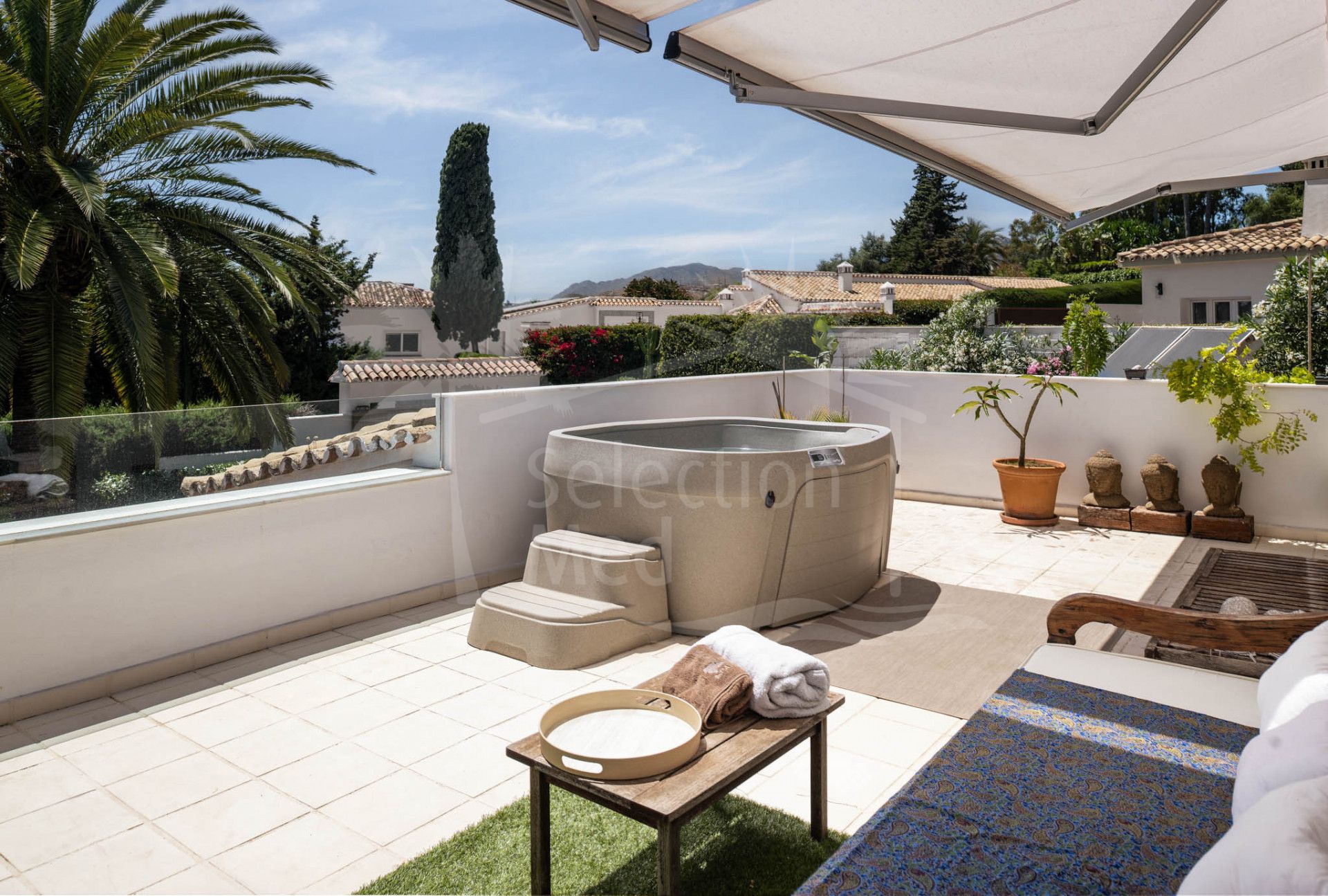 The outdoor spaces are made for relaxation: a private swimming pool, a private garden, and multiple areas ideal for lounging, dining, and enjoying the sunny climate of the Costa del Sol.