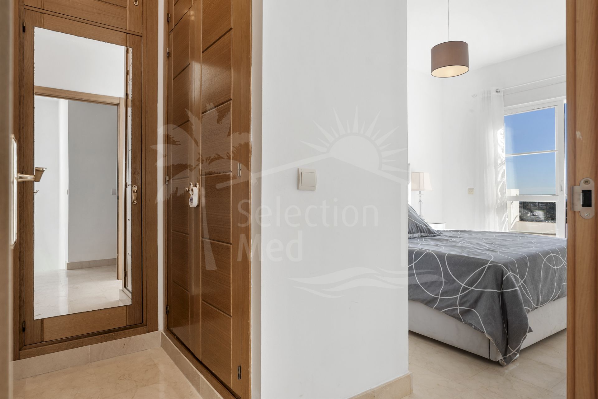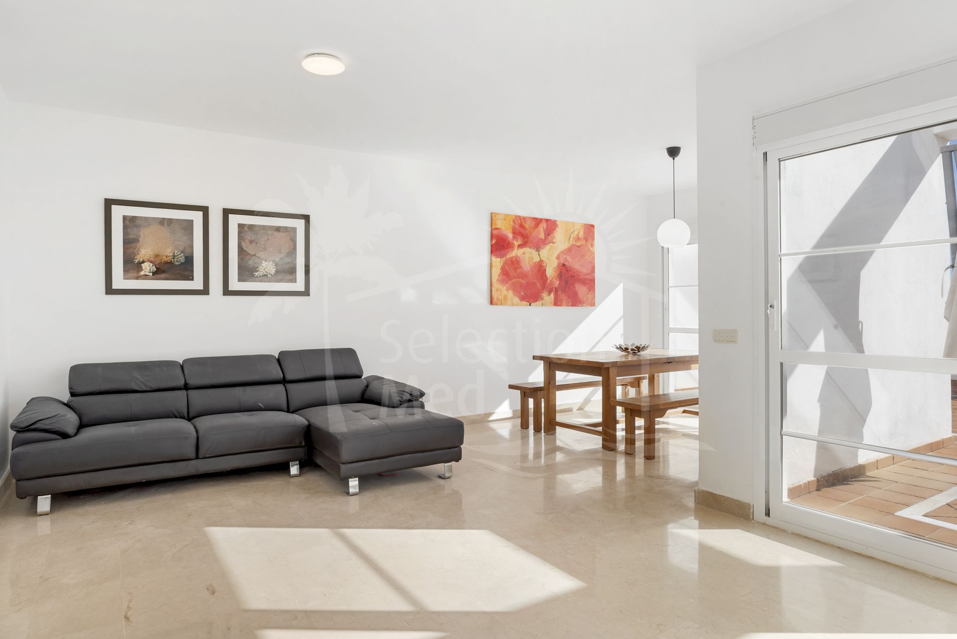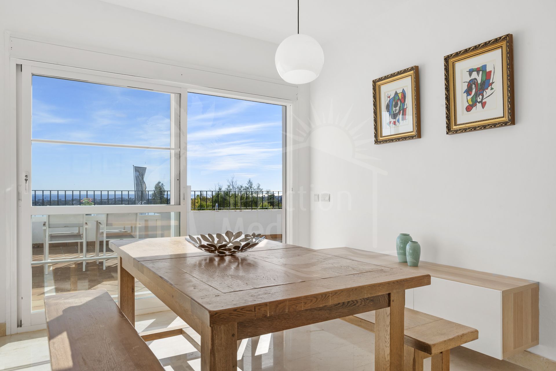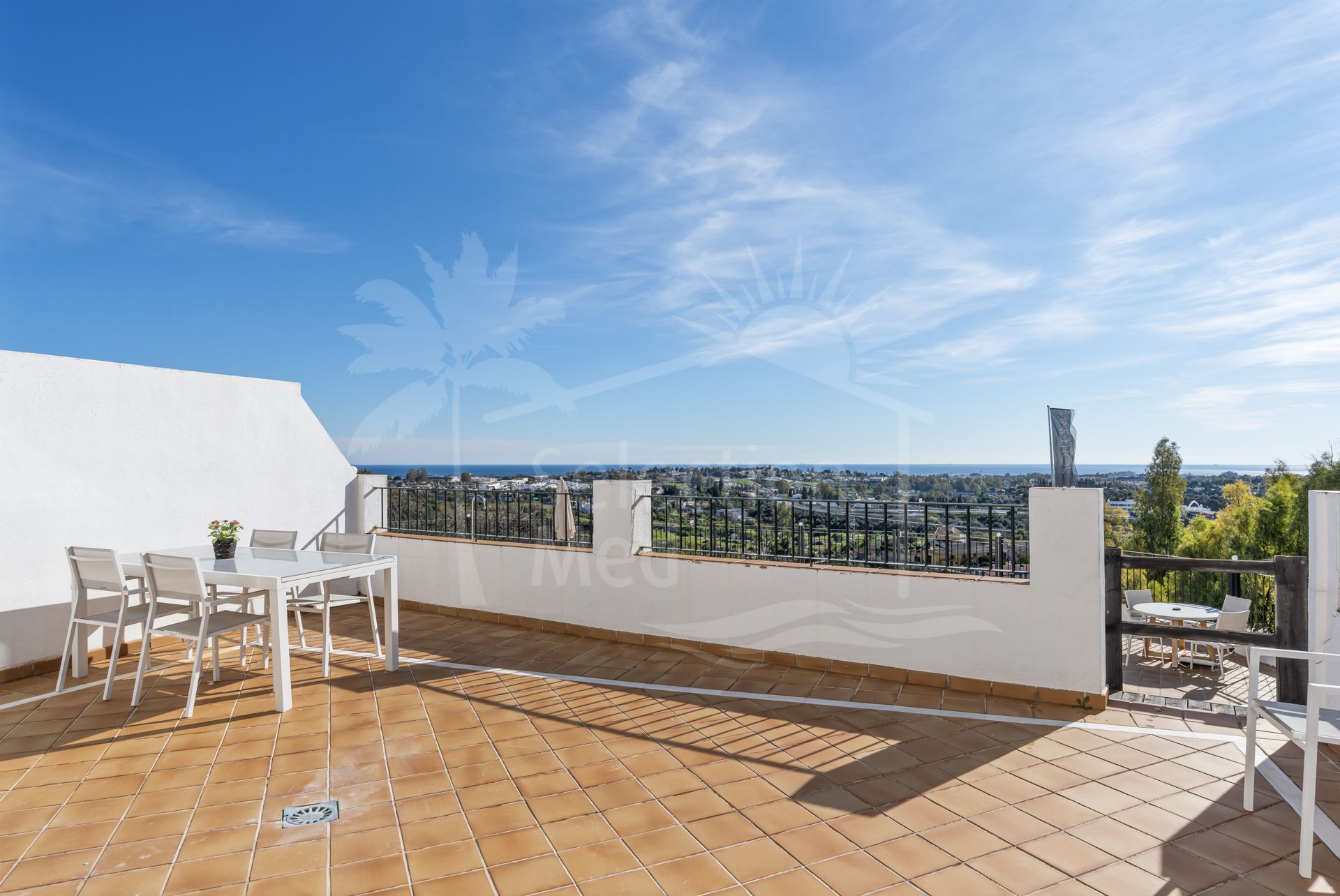 This stunning 3-bedroom semi-detached townhouse is located in a quiet gated community in Puerto de Los Almendros, Benahavís, offering breathtaking panoramic views of the Mediterranean Sea and surrounding mountains.