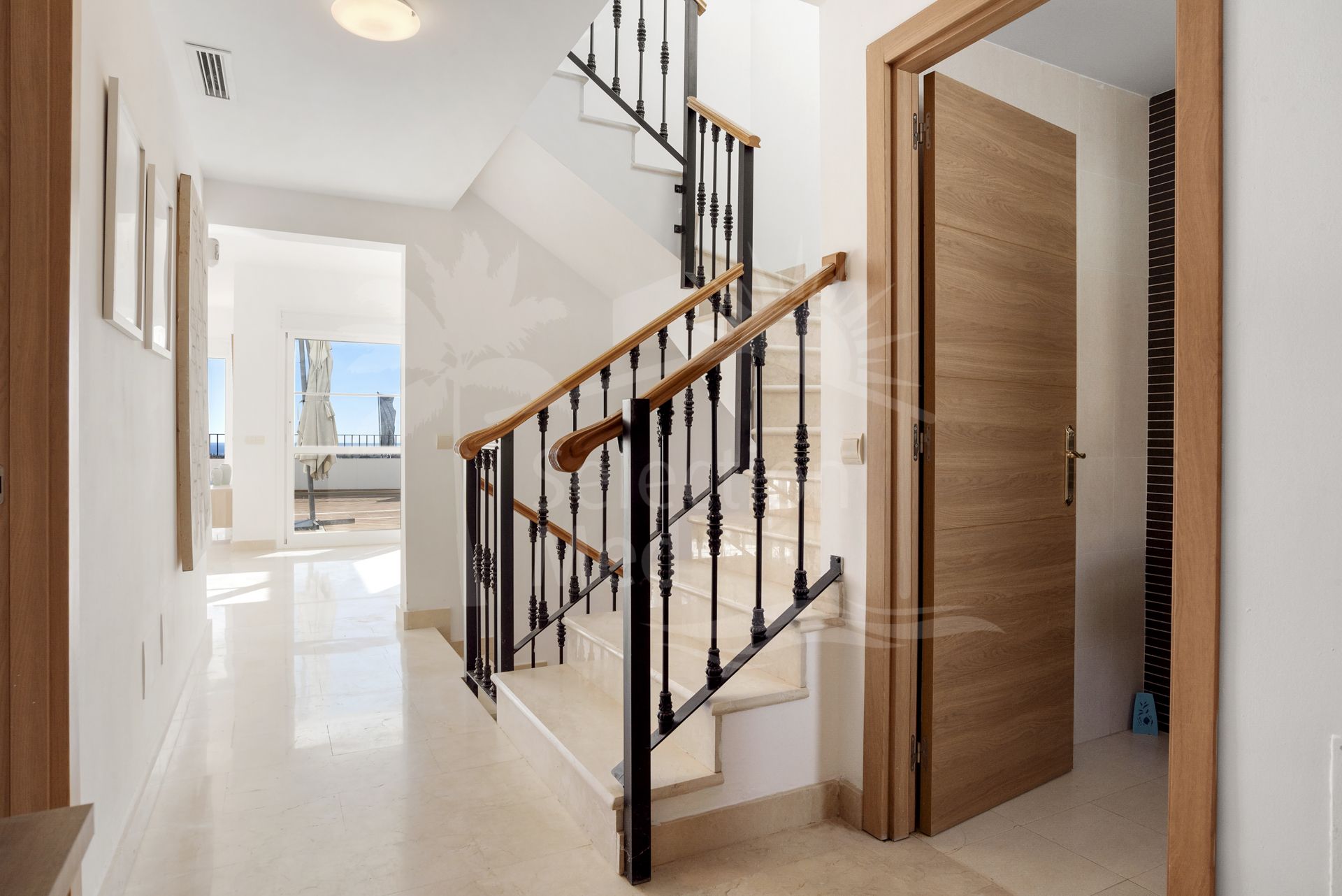 The townhouse features a welcoming entrance hall, guest cloakroom, and a fully fitted kitchen, leading into a spacious and bright living and dining area. Large sliding doors open onto a south-facing terrace, perfect for enjoying the open sea and mountain views throughout the day. The property offers generous interior and exterior living spaces, ideal as a permanent residence, holiday home, or investment property.