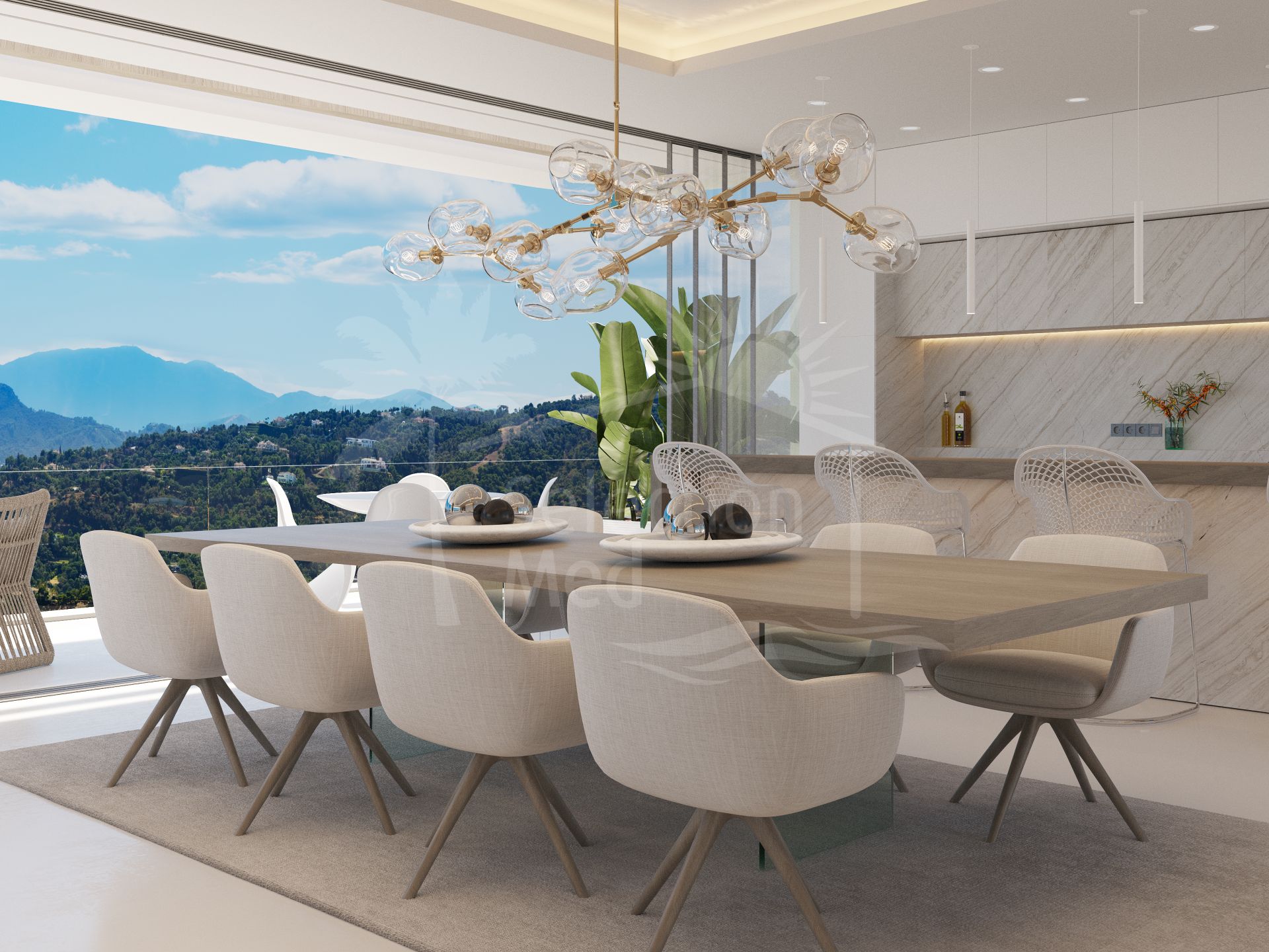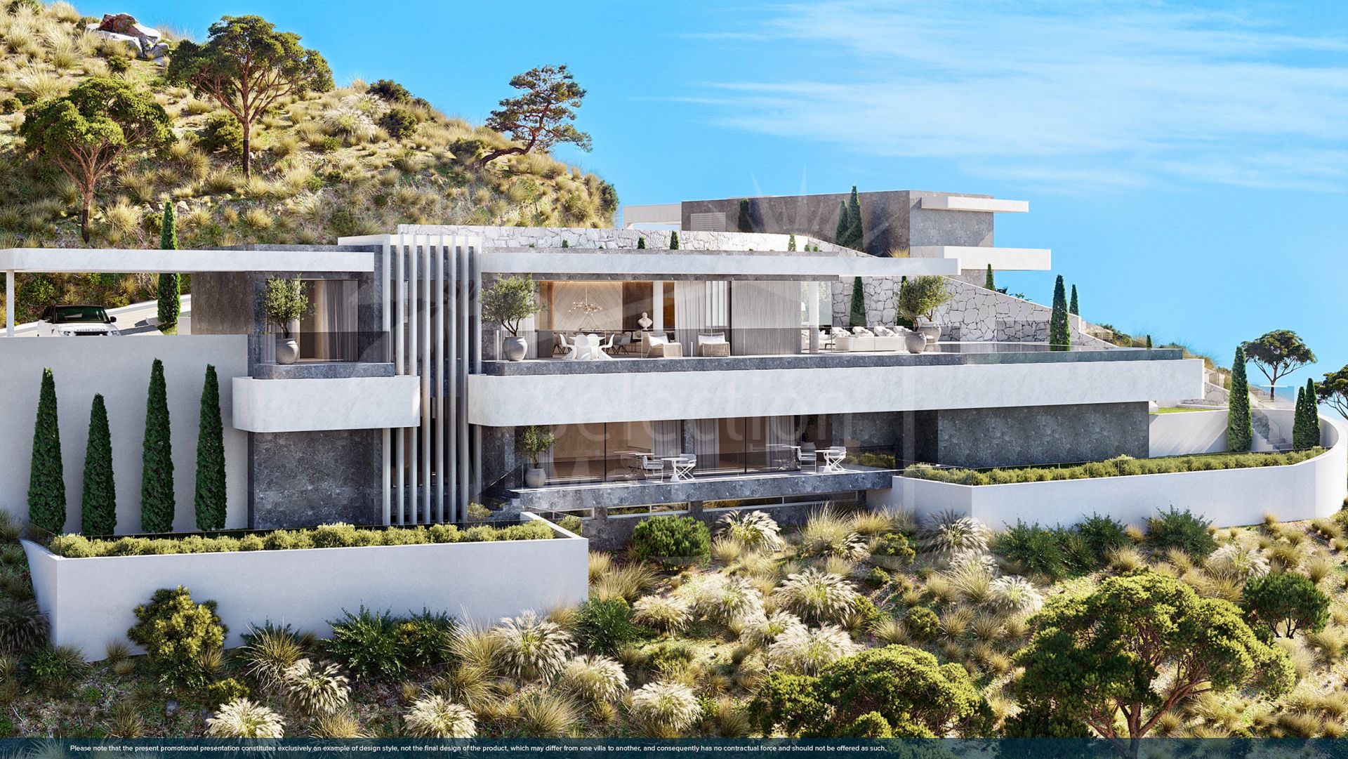 Set on a south–southwest facing plot, this exceptional villa enjoys magnificent panoramic views across the Mediterranean Sea to the African coastline. Designed to embrace year-round outdoor living, expansive terraces wrap around the main living areas, while disappearing glass walls frame uninterrupted vistas and blur the line between inside and out. The landscaped garden offers ample space for leisure—or even an organic vegetable garden.
