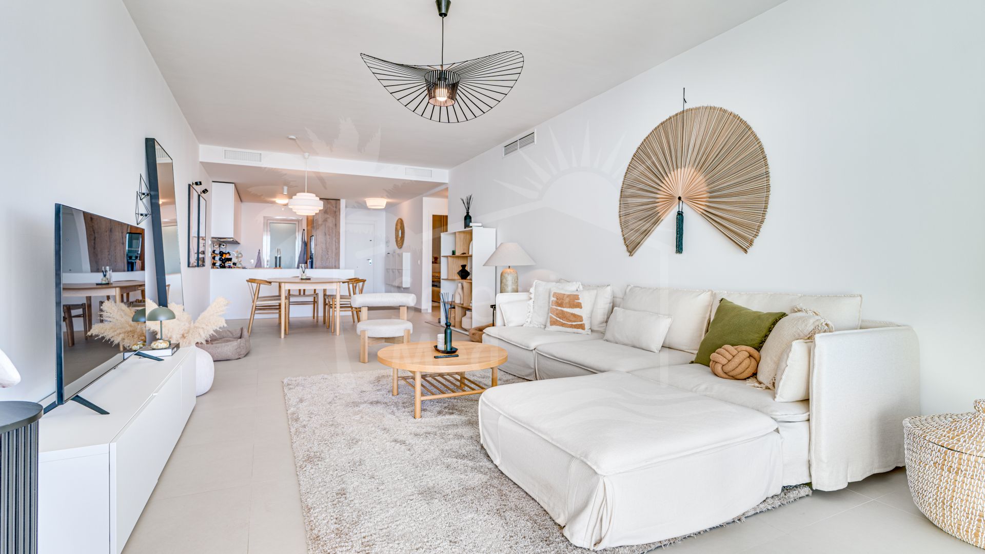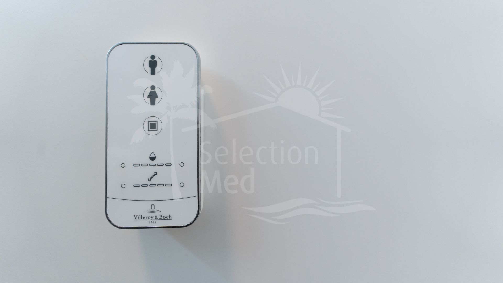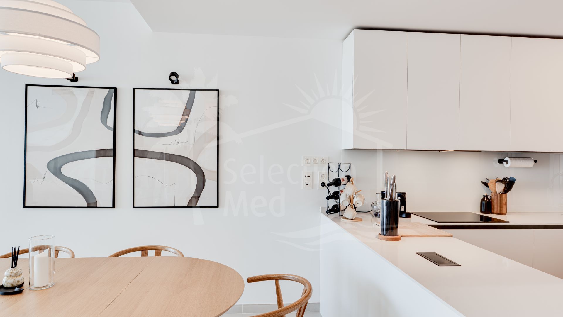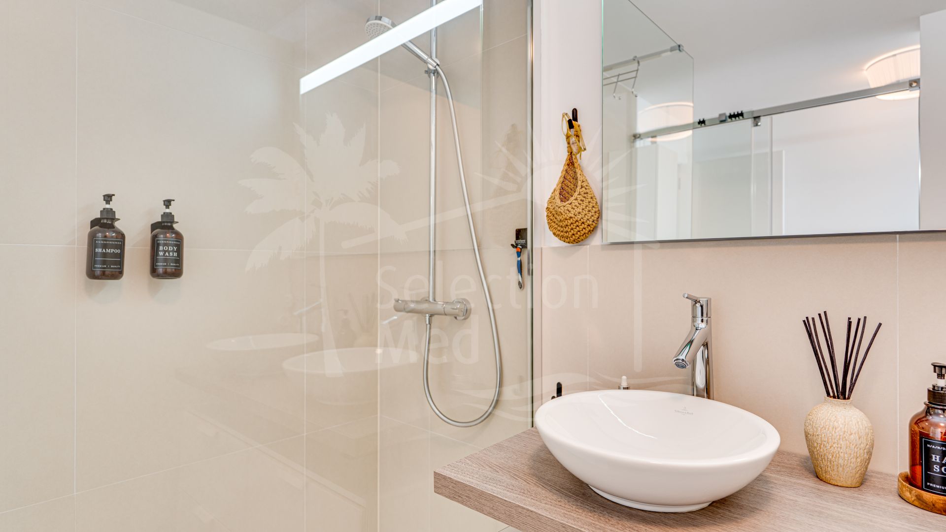 Bright and contemporary in design, this apartment offers a large terrace of 31m² and open views of the sea. The open-plan living area combines kitchen, dining, and lounge in a functional and welcoming way, with large sliding glass doors that let in plenty of natural light. The kitchen blends in well with the overall layout, while the bedrooms are clearly arranged and complemented by two modern bathrooms, one of which includes a toilet with bidet function.