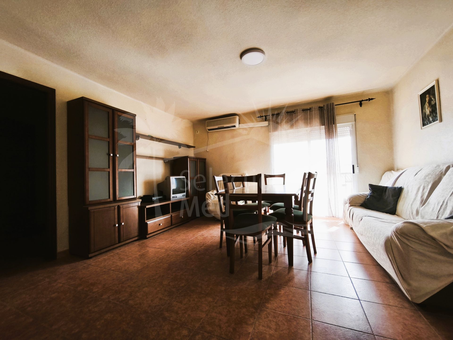 Bright living-dining room with air conditioning, with direct access to the main terrace, perfect for enjoying the outdoors.