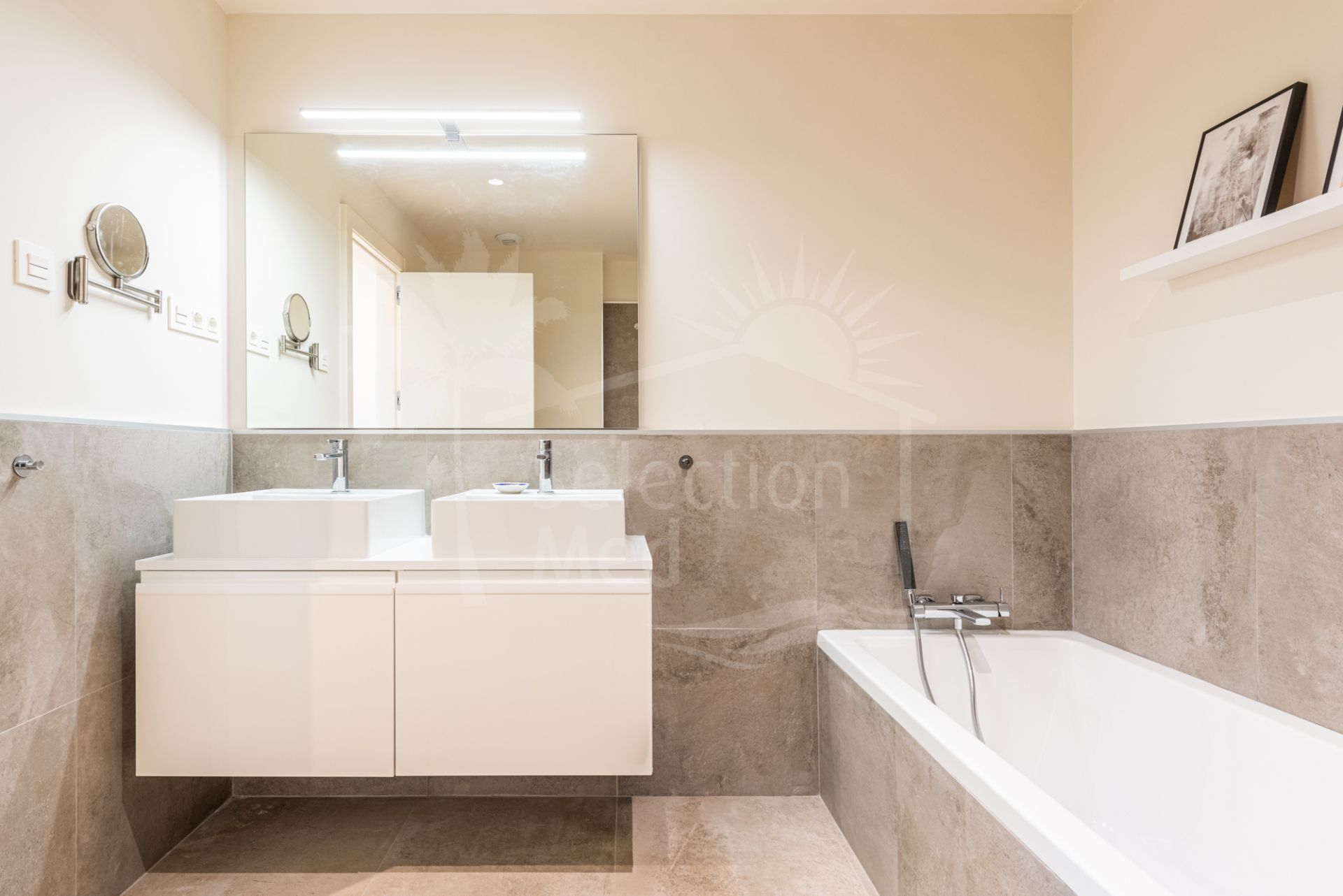 The apartment comprises four beautifully appointed bedrooms. Two feature en-suite bathrooms, while the remaining two share a stylishly designed bathroom. A separate guest WC includes a discreetly integrated laundry area. Soft tones, elegant finishes, and abundant natural light define each bedroom, with two offering direct access to the terrace.