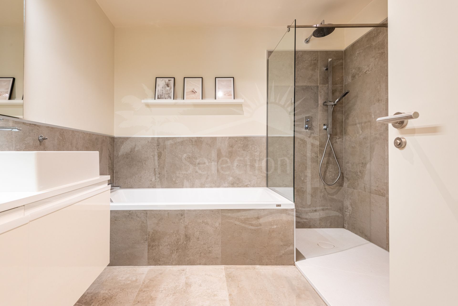 At the heart of the home lies a sophisticated open-plan living area, seamlessly integrating the kitchen, dining, and lounge spaces. The fully fitted kitchen is equipped with high-end appliances and designed for both functionality and social interaction. Floor-to-ceiling sliding glass doors disappear seamlessly into the structure, creating a fluid transition between indoor and outdoor living—perfectly suited to the region’s exceptional climate. The indoor climate is regulated by integrated air-condition (areothermia) and under floor heating through out the whole apartment.