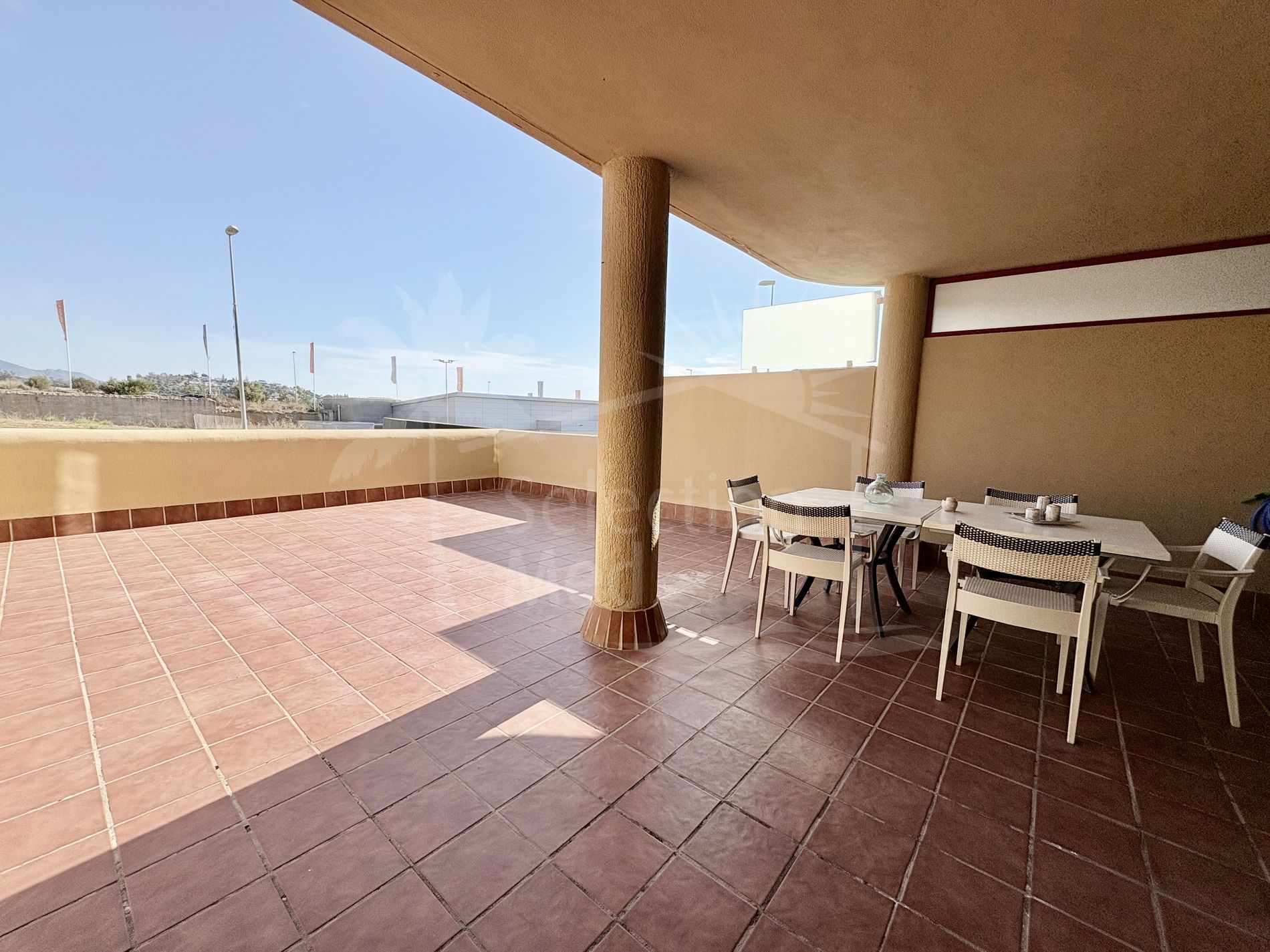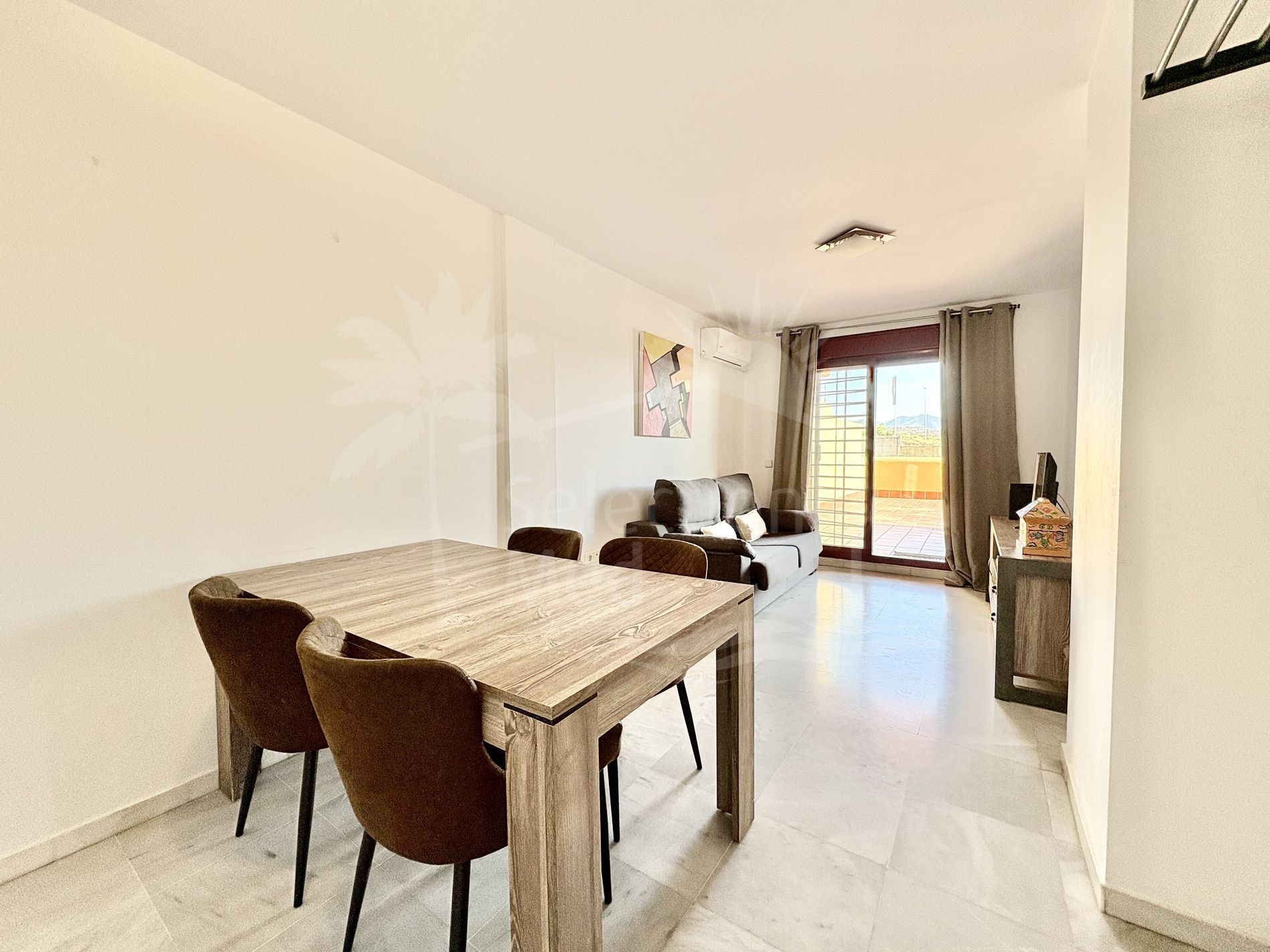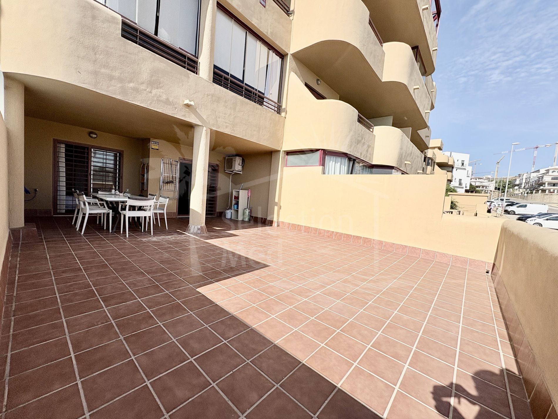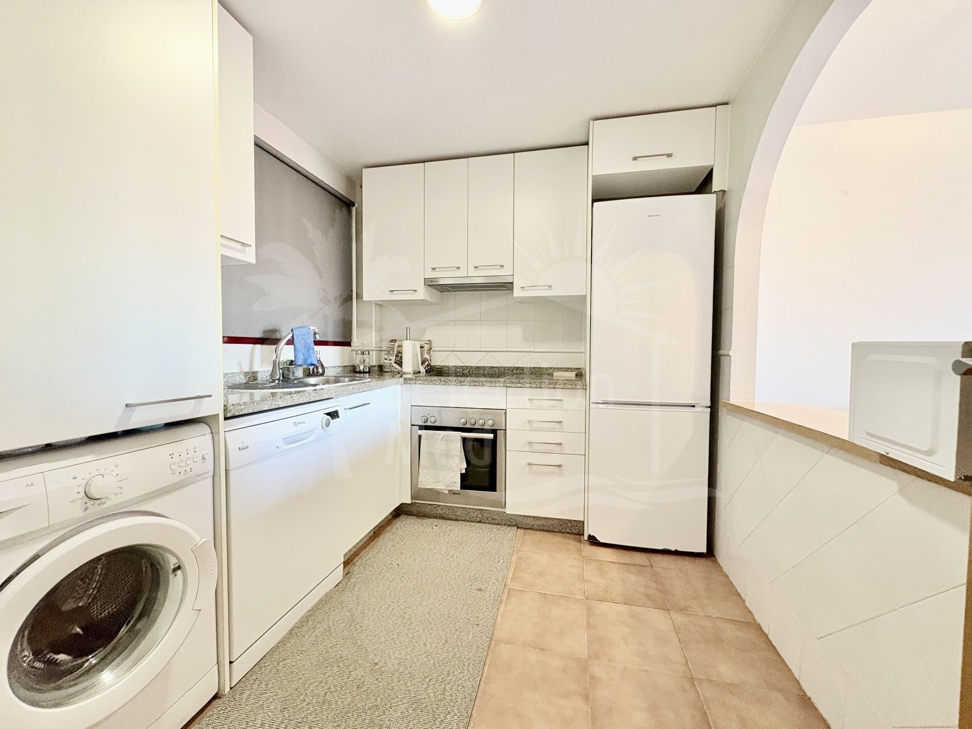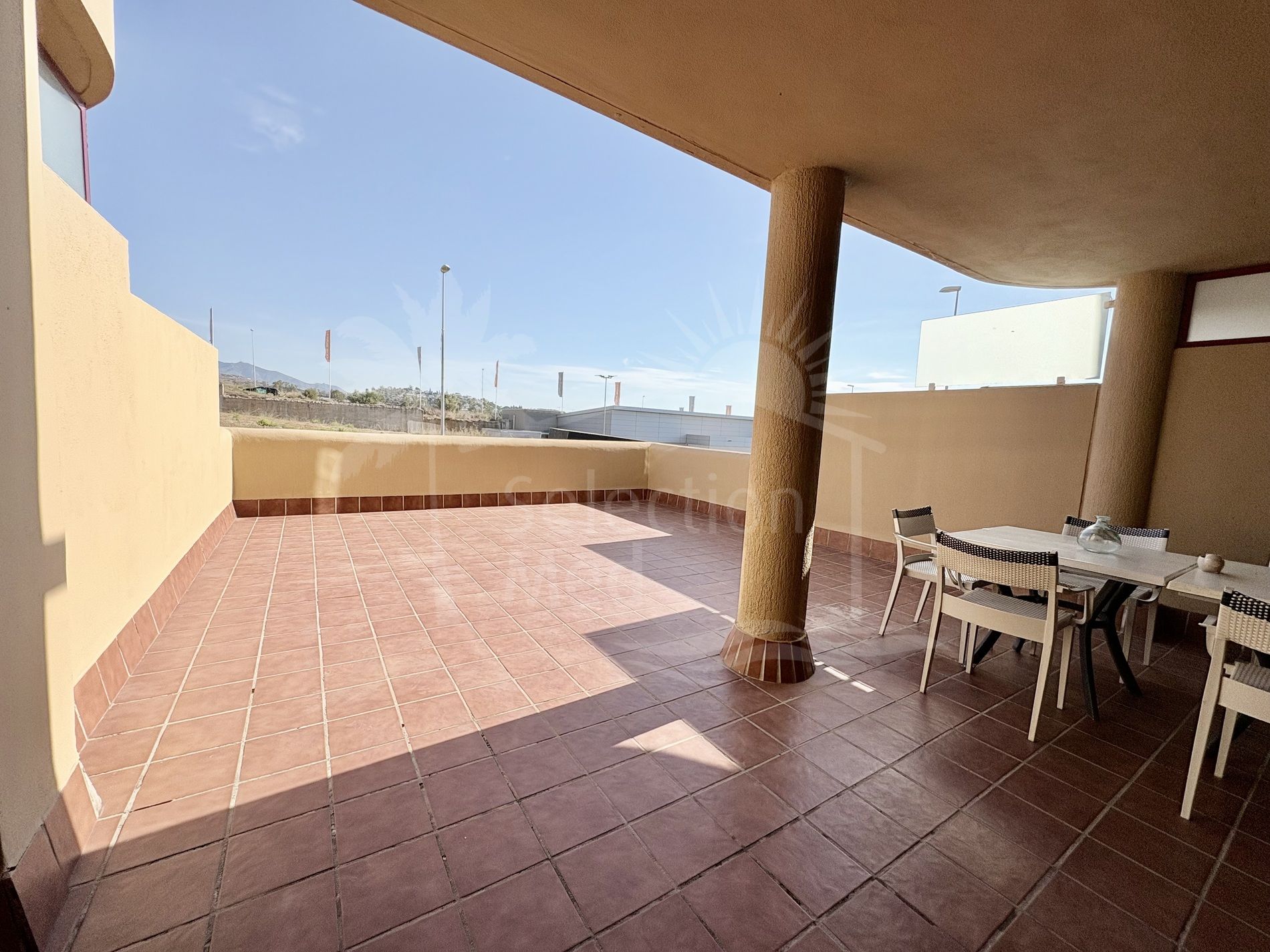 Inside, the apartment features a comfortable living room connected to a fully equipped kitchen, opening onto a remarkably large terrace — partially covered, with an enclosed section that can be used to extend the living area.