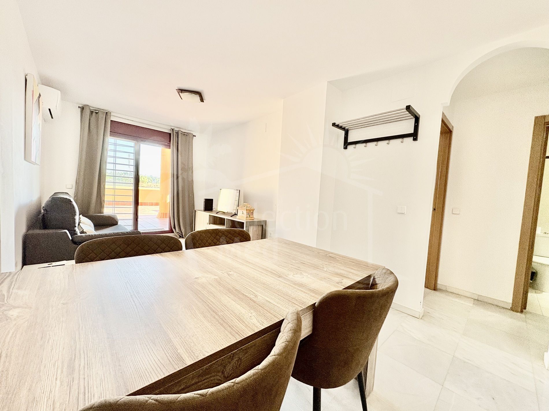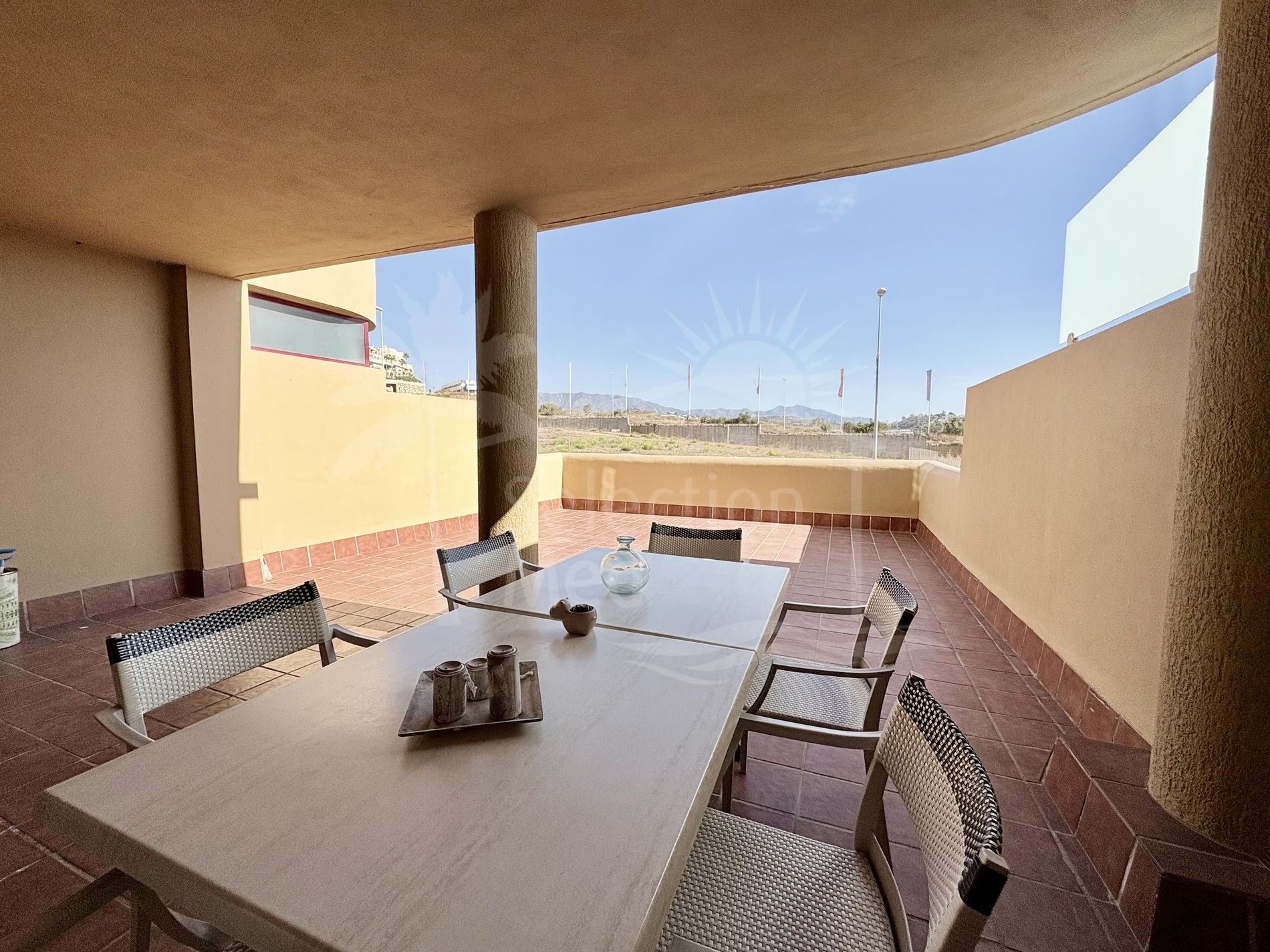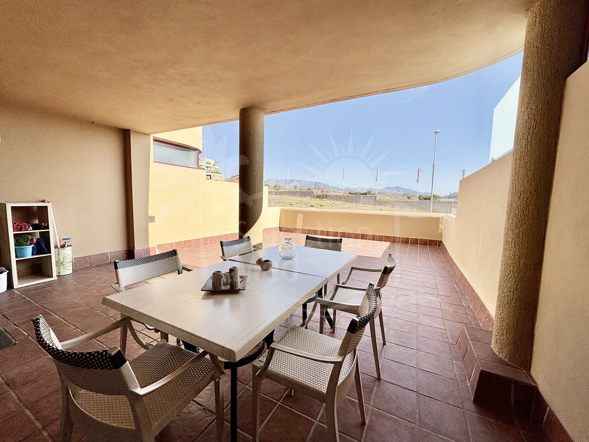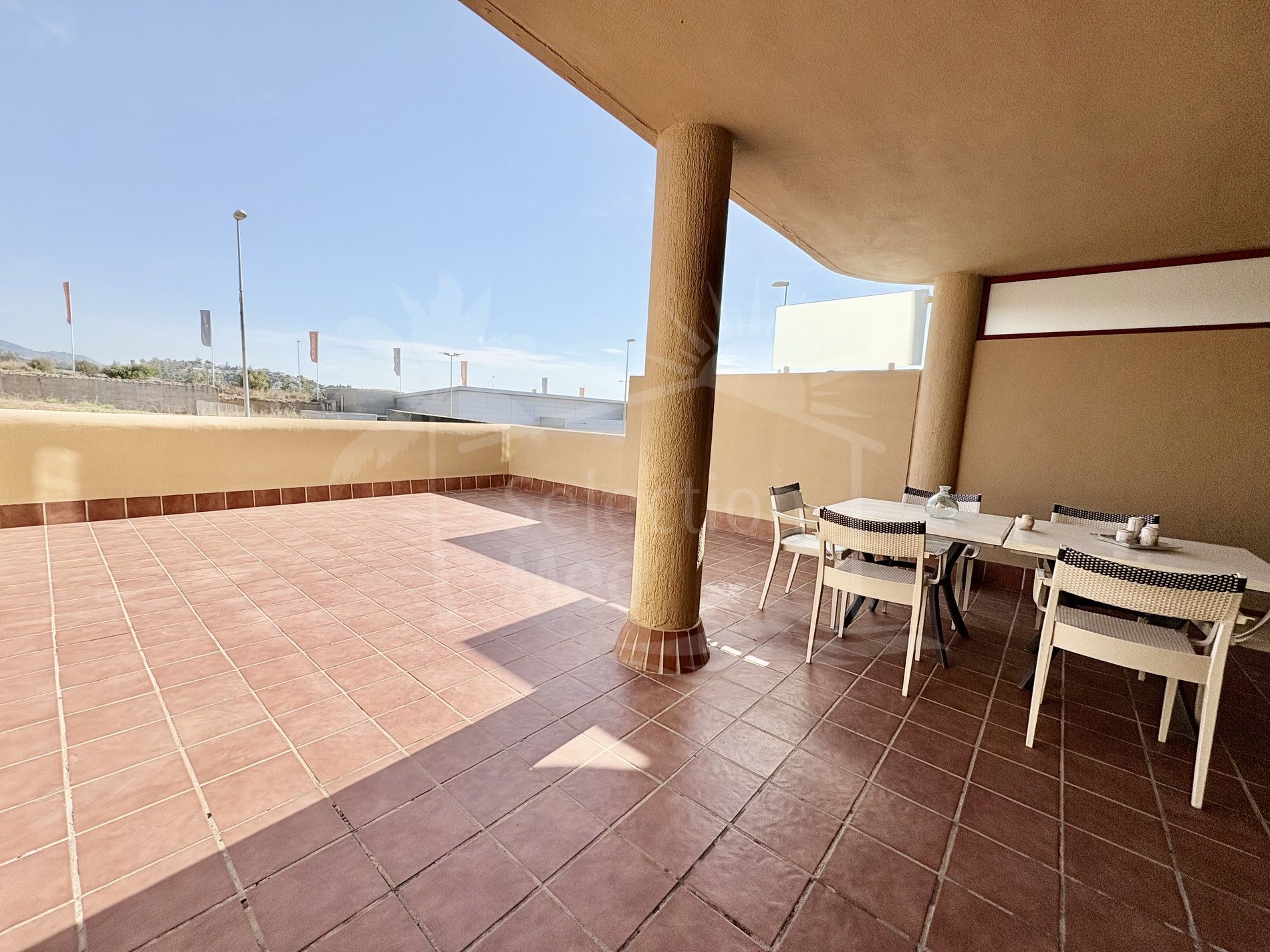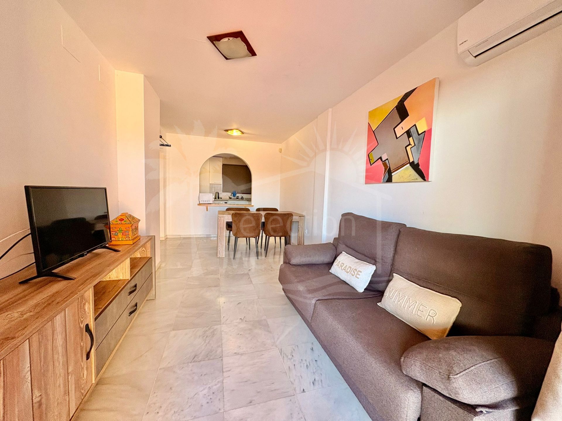Inside, the apartment features a comfortable living room connected to a fully equipped kitchen, opening onto a remarkably large terrace — partially covered, with an enclosed section that can be used to extend the living area.