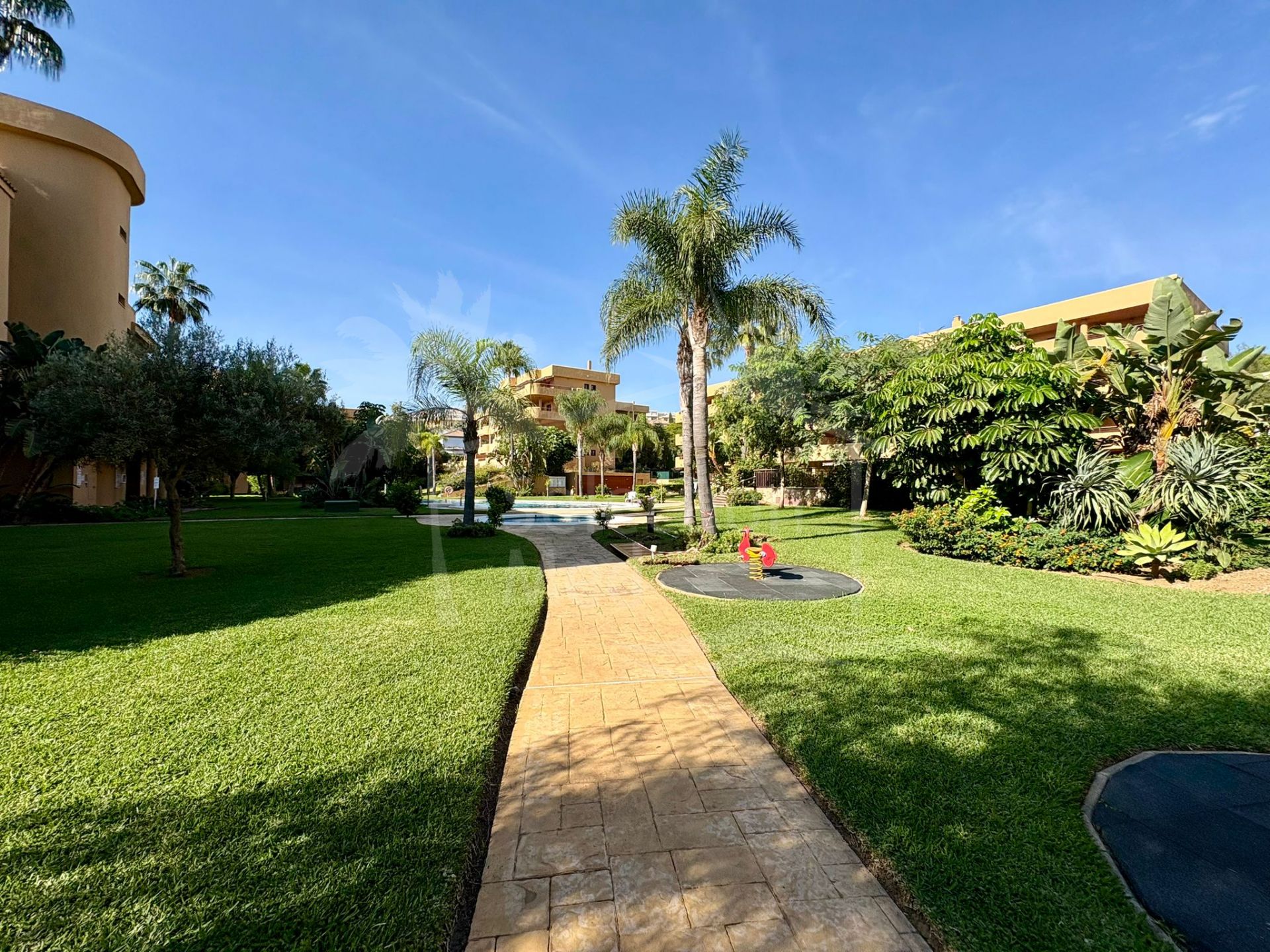 The community is beautifully maintained, offering two swimming pools, a children’s playground, and lush tropical gardens.