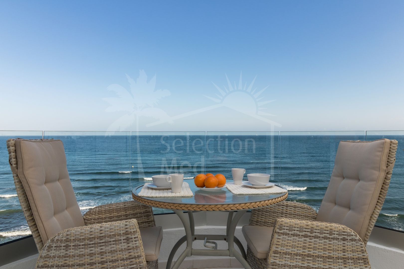 Imagine waking up to the golden glow of sunrise over the Mediterranean, stepping onto your south-facing terrace, and breathing in the salty breeze—just steps from the sand. This exclusive 4th-floor apartment is a true coastal sanctuary, offering uninterrupted sea views and direct access to pristine beaches and lush communal gardens.