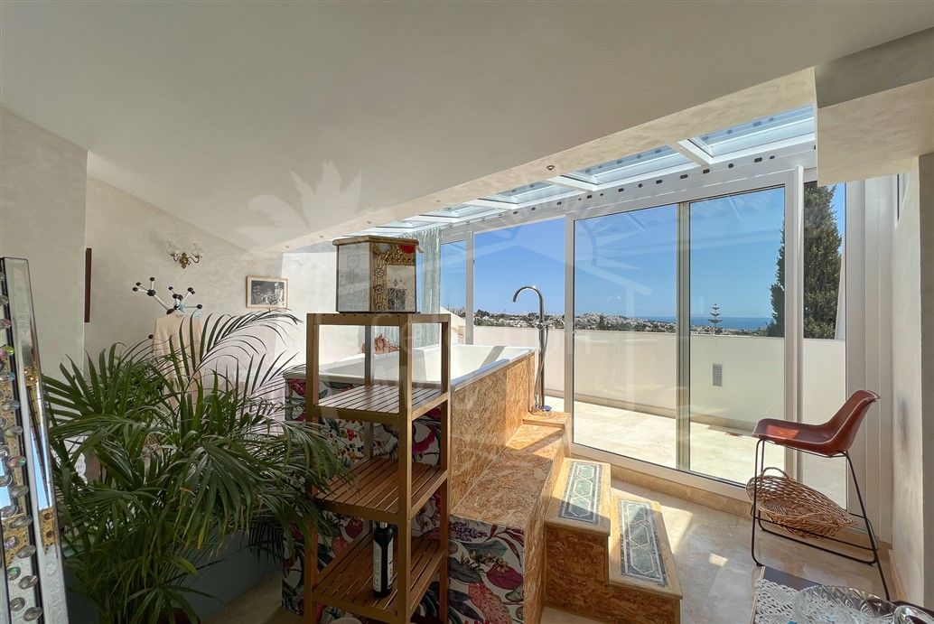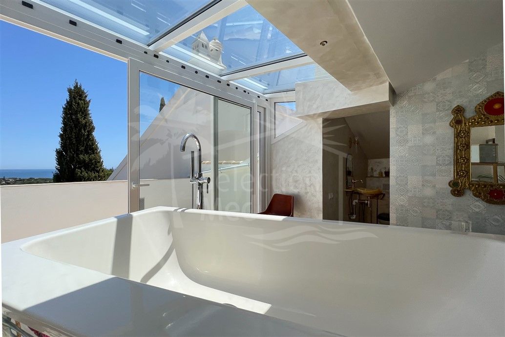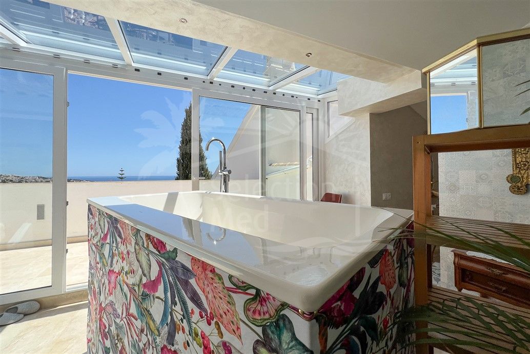 On the upper floor, a unique and versatile space awaits, featuring a large room with a partially glazed roof, ideal for use as a private spa or relaxation area. This level is equipped with a luxurious German Kaldewei Duo bathtub for two, offering breathtaking panoramic views of the sea and mountains from its private terrace—an intimate retreat designed for total comfort and privacy.