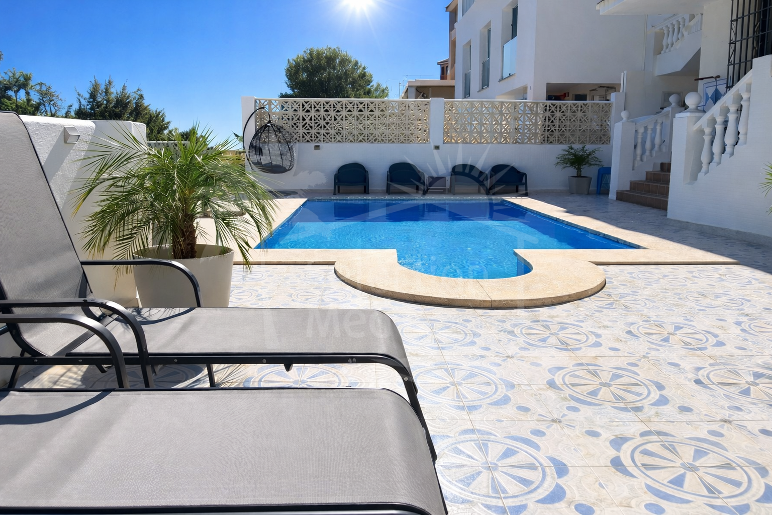 The property features 702 m² of built area distributed over 3 floors, 9 bedrooms, 4 bathrooms, a private plot of 409 m², swimming pool, terraces, and included garage. Well maintained.