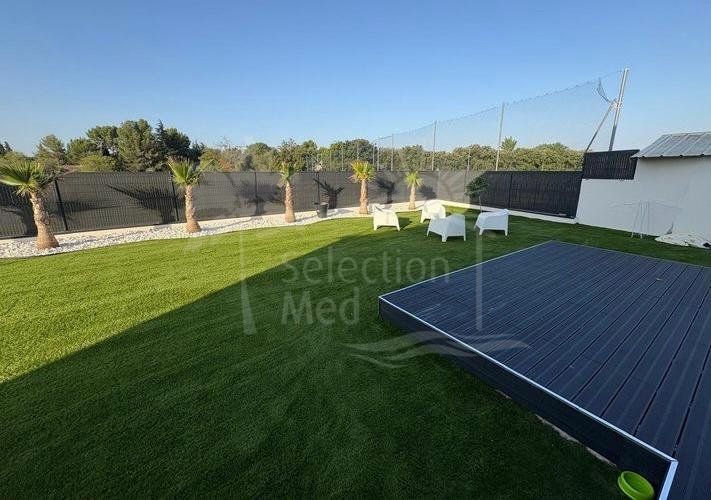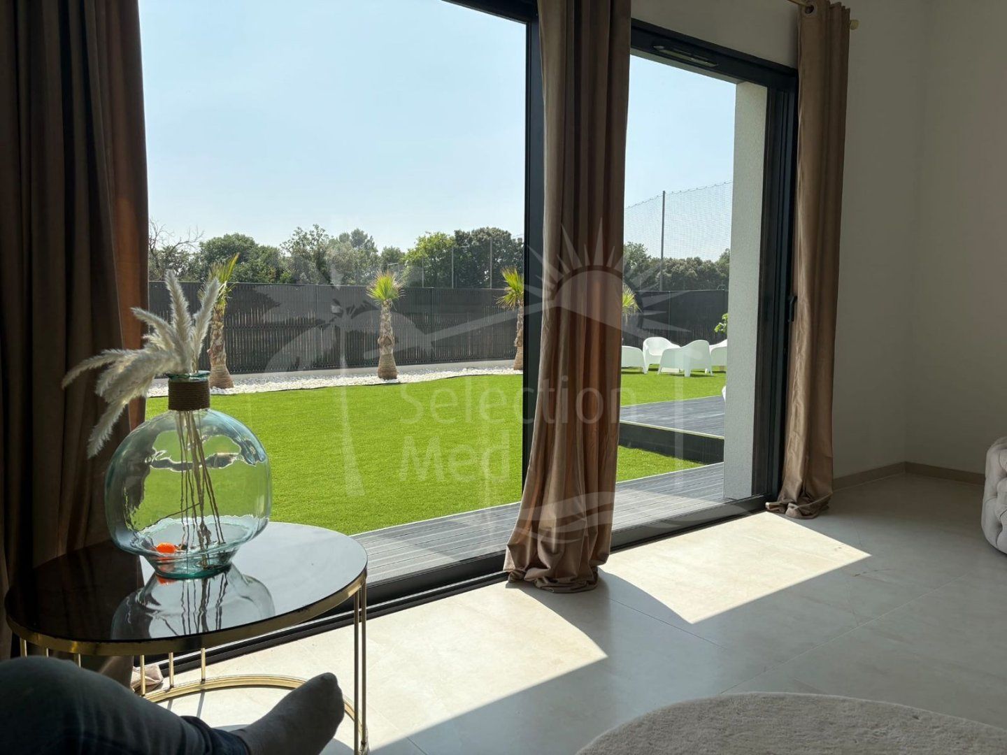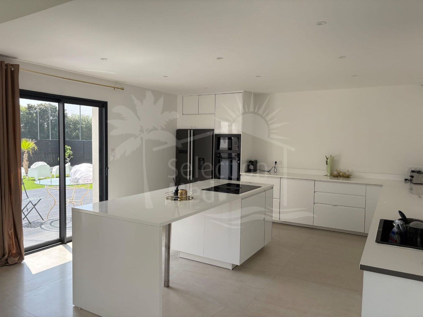 Villa built in 2024 with high-end materials, surrounded by a landscaped garden of 500m² with swimming pool, large garage and four outdoor parking spaces Located in a quiet residential environment, but close to schools, train station, main roads and all the amenities for an active family. This property is composed of three bedrooms with a master suite on the ground floor with shower room and separate toilet, utility room, large living/dinning kitchen with a totally equipped kitchen with two french doors opening into a landscaped garden and pool. On the first floor two bedrooms with their private terrace, shower room and separate toilet. Equipment: Heating for reversible air conditioning duct to the ceilings Thermodynamic water heater Reinforced PVC liner swimming pool You only need to carry your suitcases!