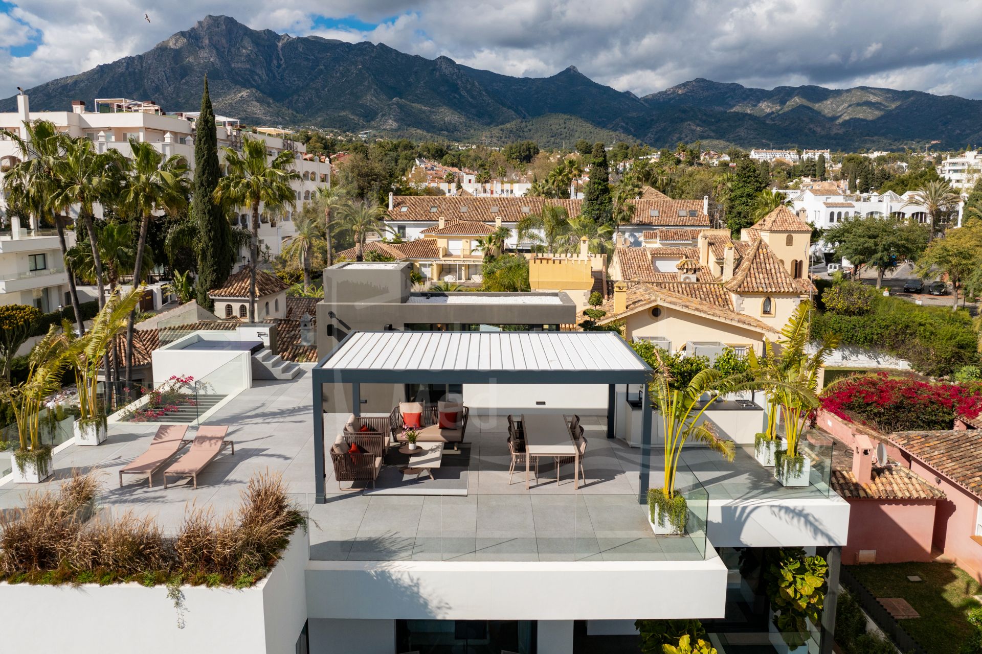 The outdoor areas have been designed for year-round enjoyment. A 17-meter heated pool with anti-algae solar cover is complemented by a fully equipped outdoor kitchen, perfect for entertaining. The rooftop, featuring a complete kitchen, jacuzzi, and panoramic views of the Mediterranean and La Concha, provides the ultimate setting for al fresco dining.