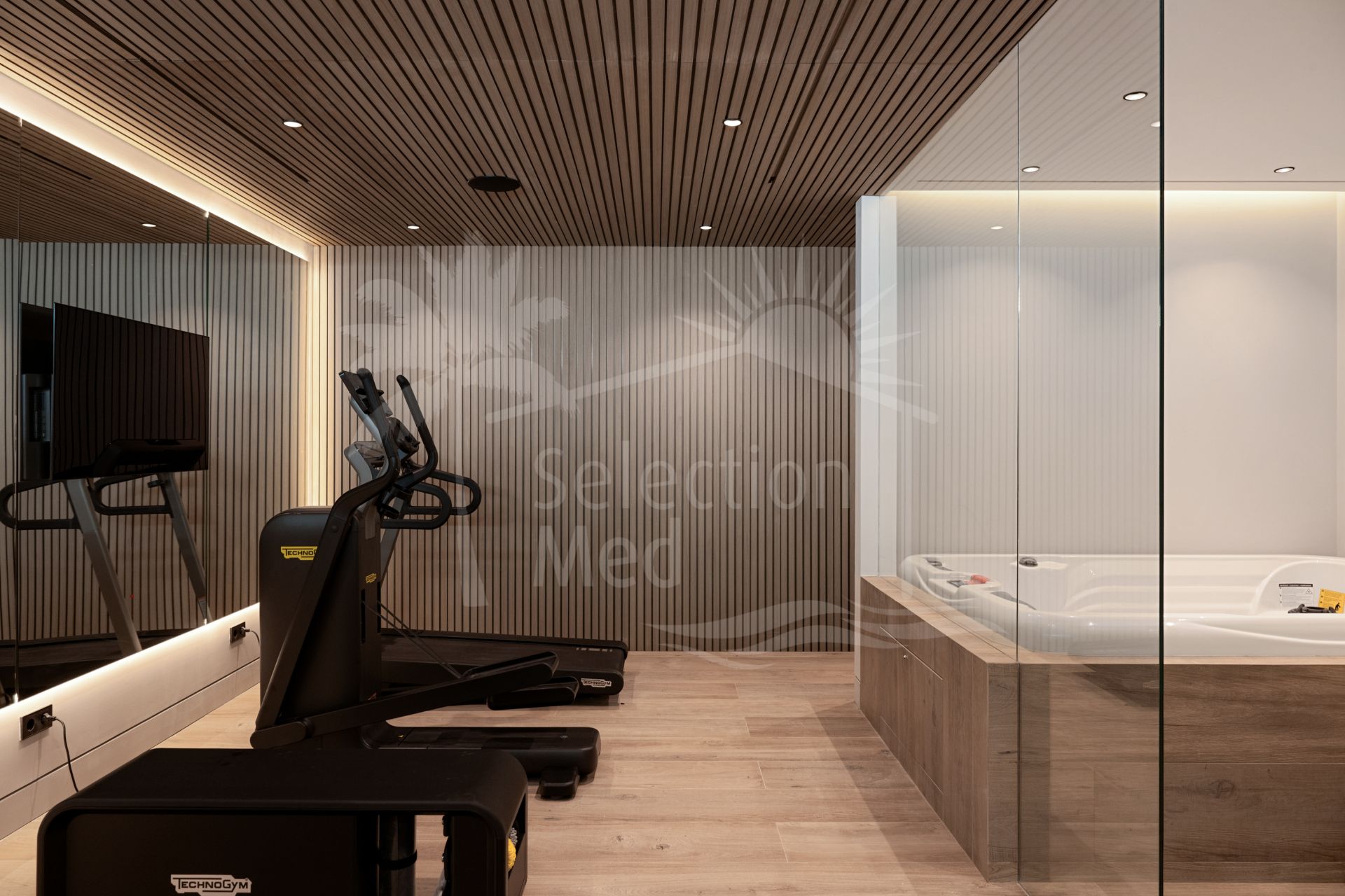 The lower level is dedicated to wellness and leisure: a Technogym-equipped fitness room, steam and Finnish saunas, massage area, hydrotherapy spa, a climate-controlled wine cellar, and a kitchenette. The garage, in addition to its rotating platform, offers charging stations for electric vehicles, ensuring a modern and sustainable lifestyle.