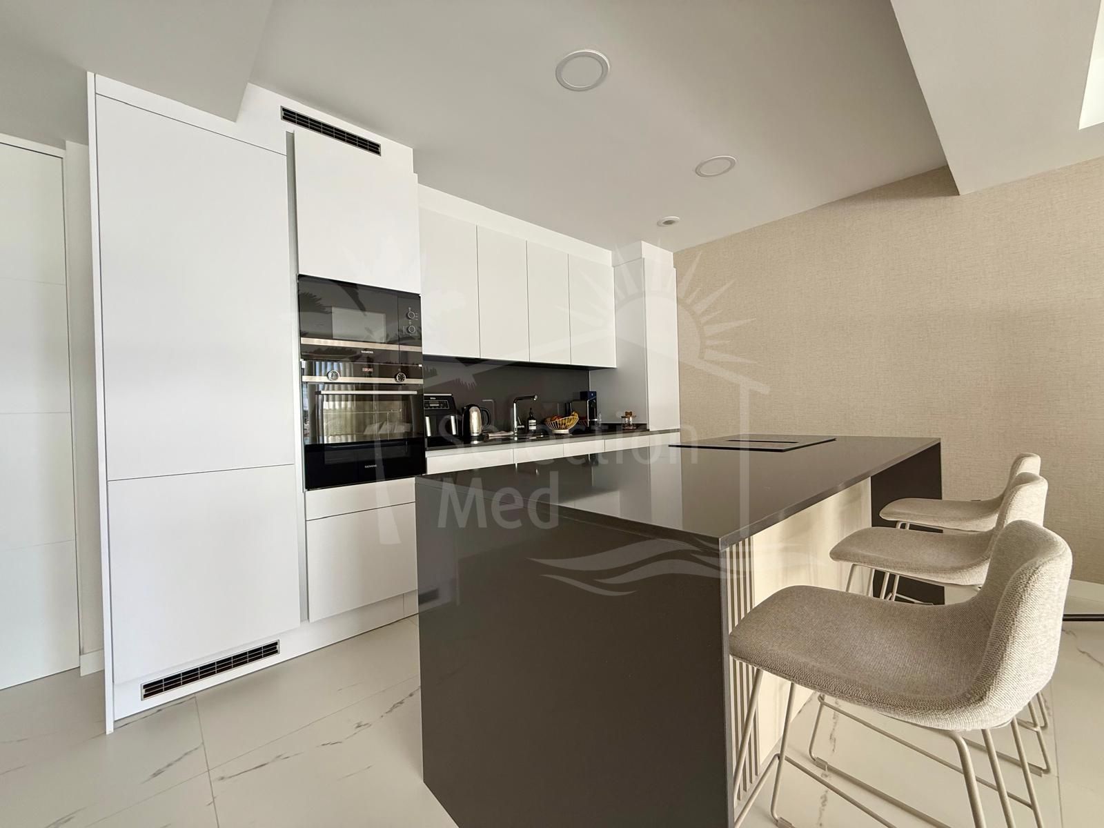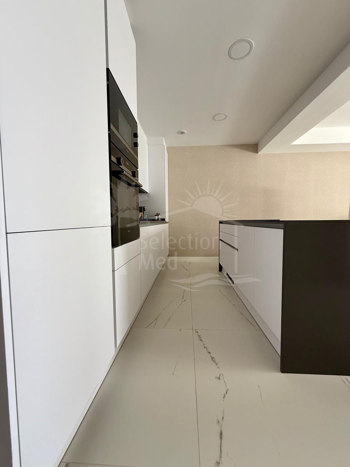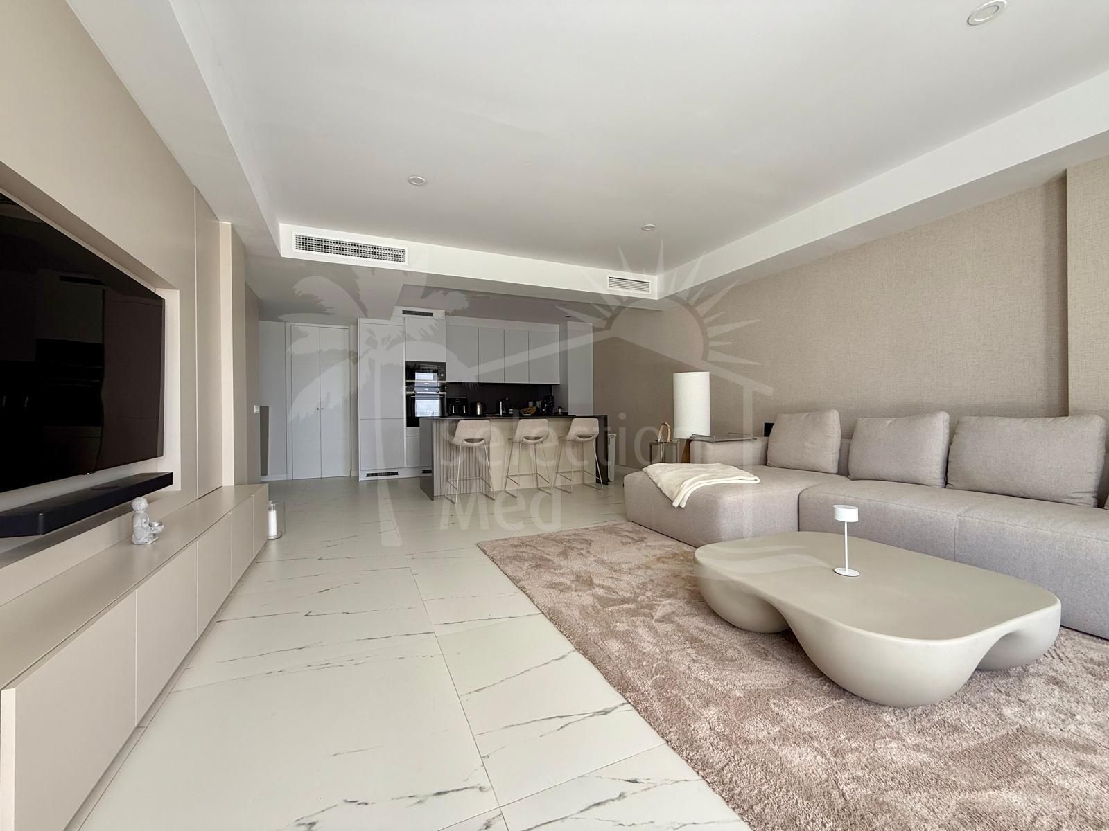 The apartment arrives fully furnished and turn-key ready, allowing new owners to seamlessly transition into their coastal paradise. High-end finishes throughout, from sleek built-in wardrobes to contemporary fixtures, elevate the everyday experience. A standout feature is the expansive terrace and balcony, where residents can bask in stunning panoramic views of the sea and surrounding mountains, transforming simple moments like morning coffee or evening gatherings into unforgettable experiences. Complementing this is a large storage room, thoughtfully designed with ventilation and natural light, providing functional versatility for hobbies, extra storage, or even a home office setup. Parking is abundantly catered to with three dedicated spaces included, plus an already-installed electric car charger to support modern, green transportation needs— with the option to purchase an additional spot for added convenience.
