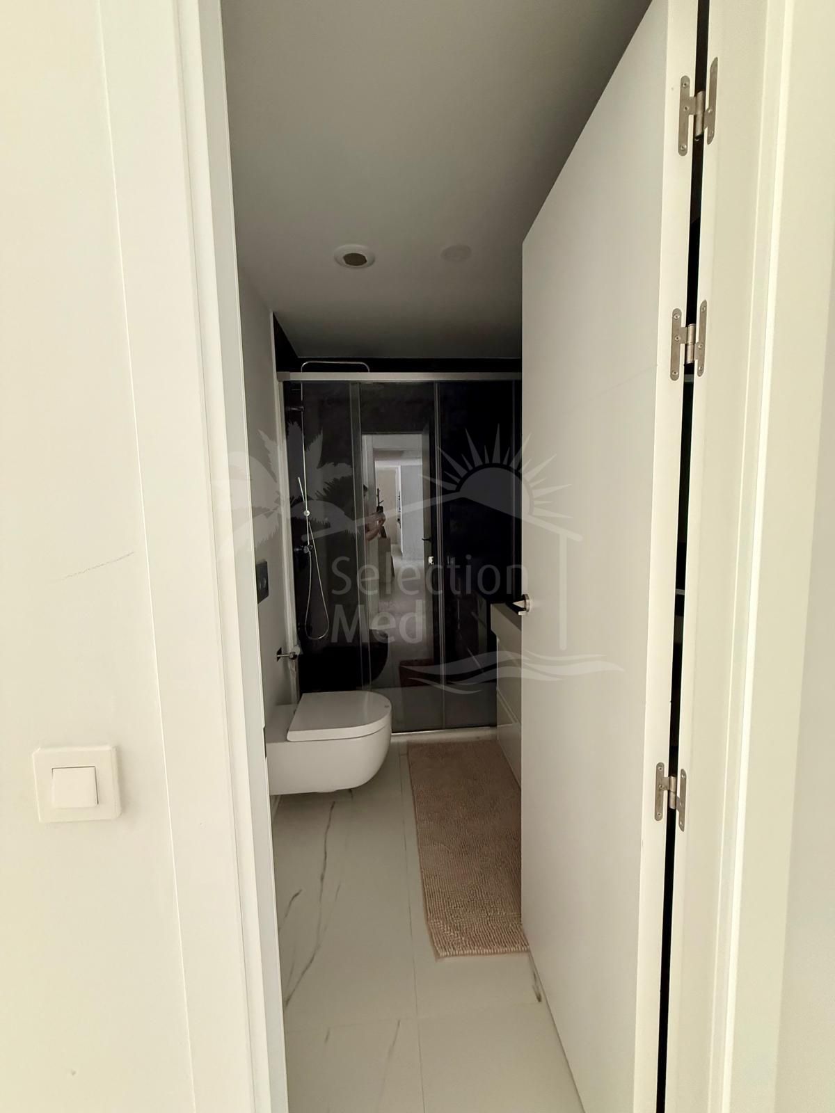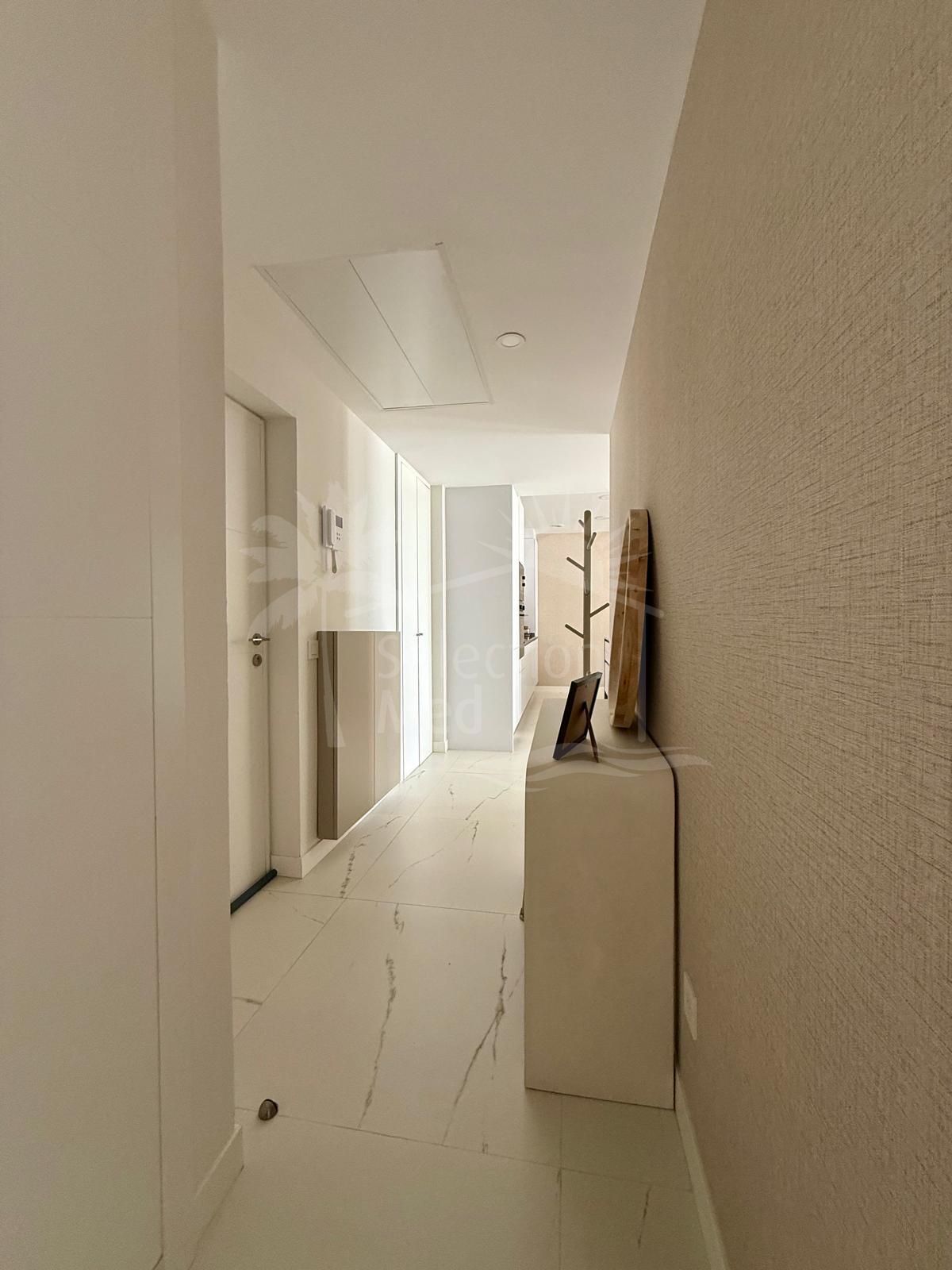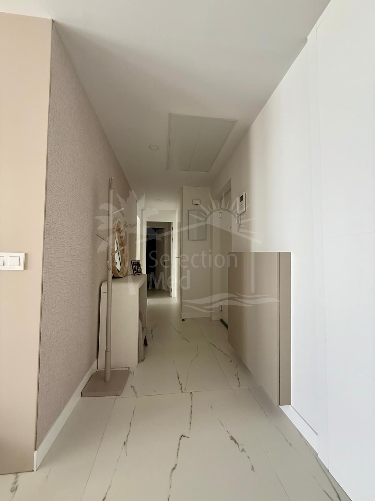 The apartment arrives fully furnished and turn-key ready, allowing new owners to seamlessly transition into their coastal paradise. High-end finishes throughout, from sleek built-in wardrobes to contemporary fixtures, elevate the everyday experience. A standout feature is the expansive terrace and balcony, where residents can bask in stunning panoramic views of the sea and surrounding mountains, transforming simple moments like morning coffee or evening gatherings into unforgettable experiences. Complementing this is a large storage room, thoughtfully designed with ventilation and natural light, providing functional versatility for hobbies, extra storage, or even a home office setup. Parking is abundantly catered to with three dedicated spaces included, plus an already-installed electric car charger to support modern, green transportation needs— with the option to purchase an additional spot for added convenience.