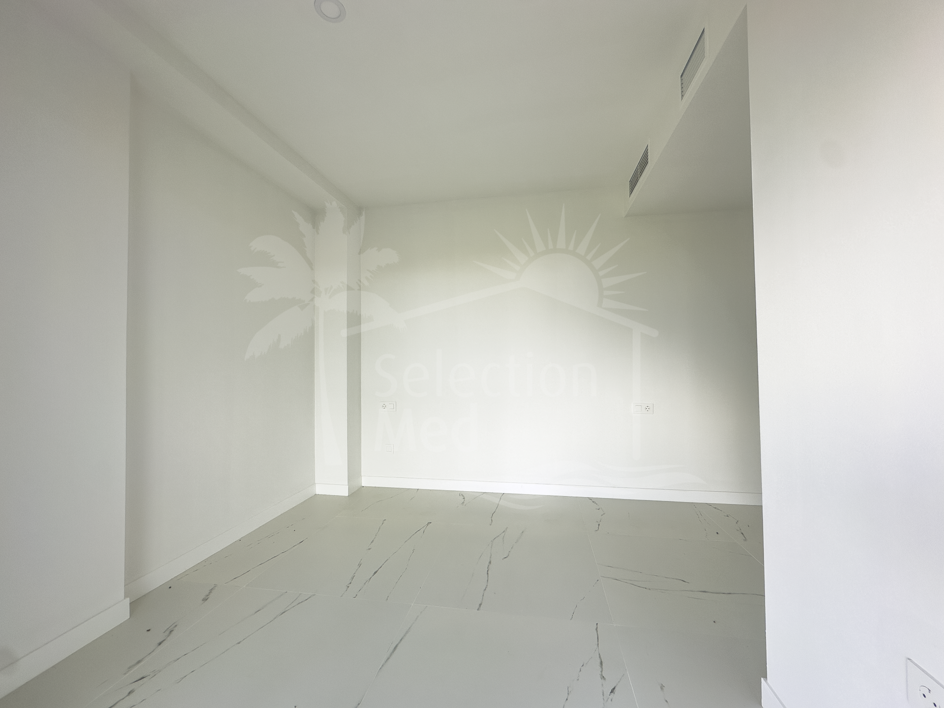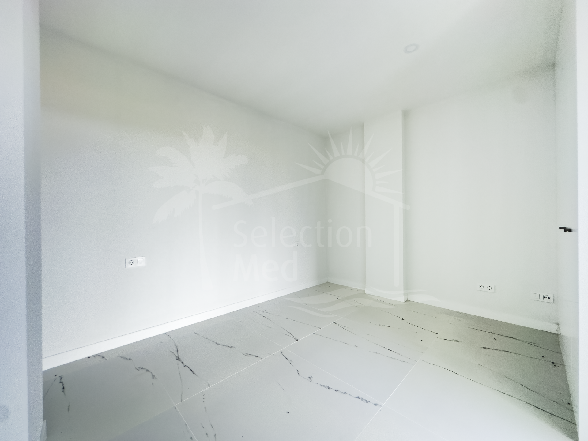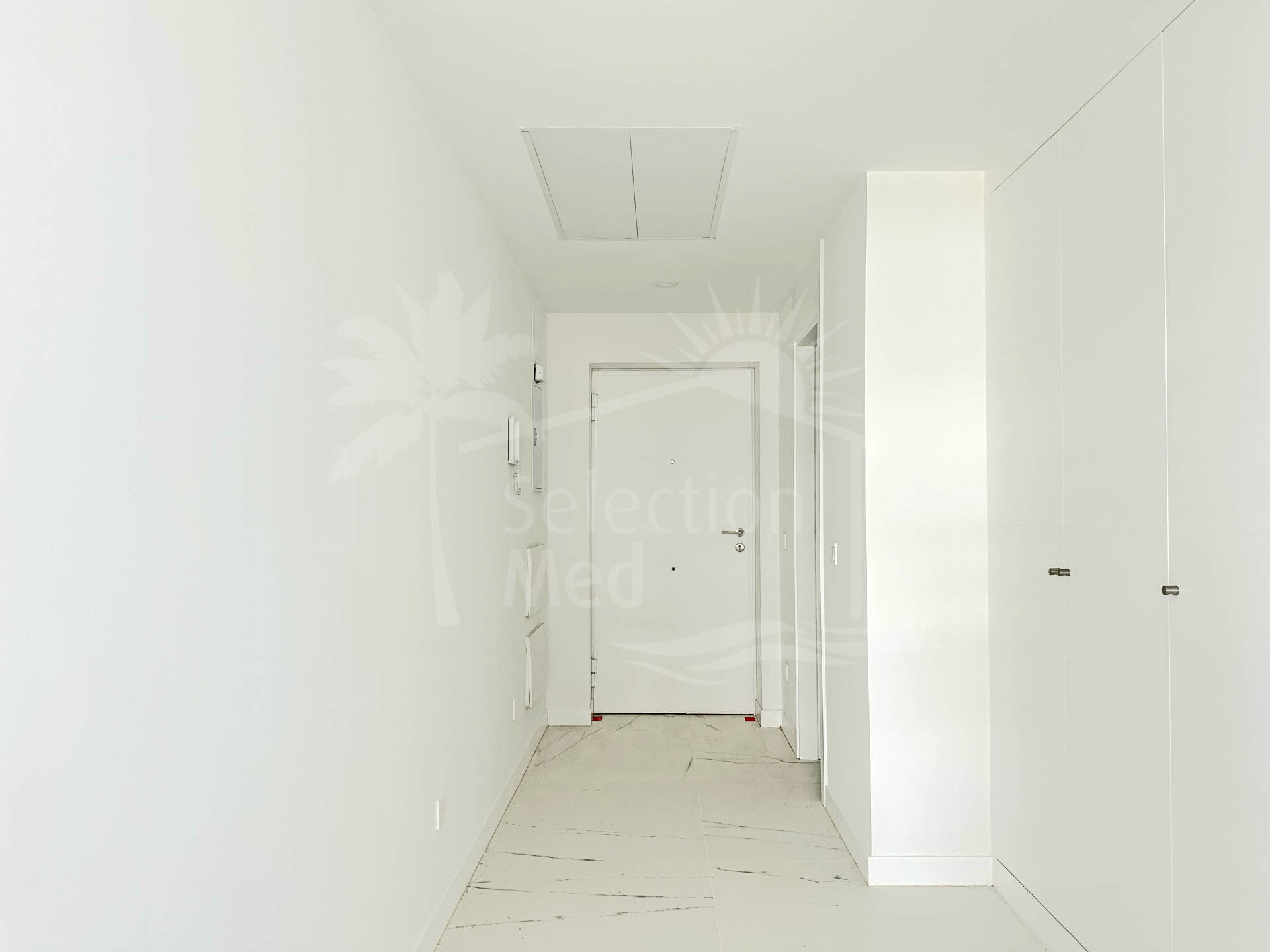Inside, the layout is contemporary and practical, with an open-plan fully fitted kitchen, spacious living and dining area, three bedrooms, and two bathrooms, including one en-suite, plus a guest toilet. Quality finishes include porcelain flooring, double glazing, armoured security door, fitted wardrobes, and a video entry system.