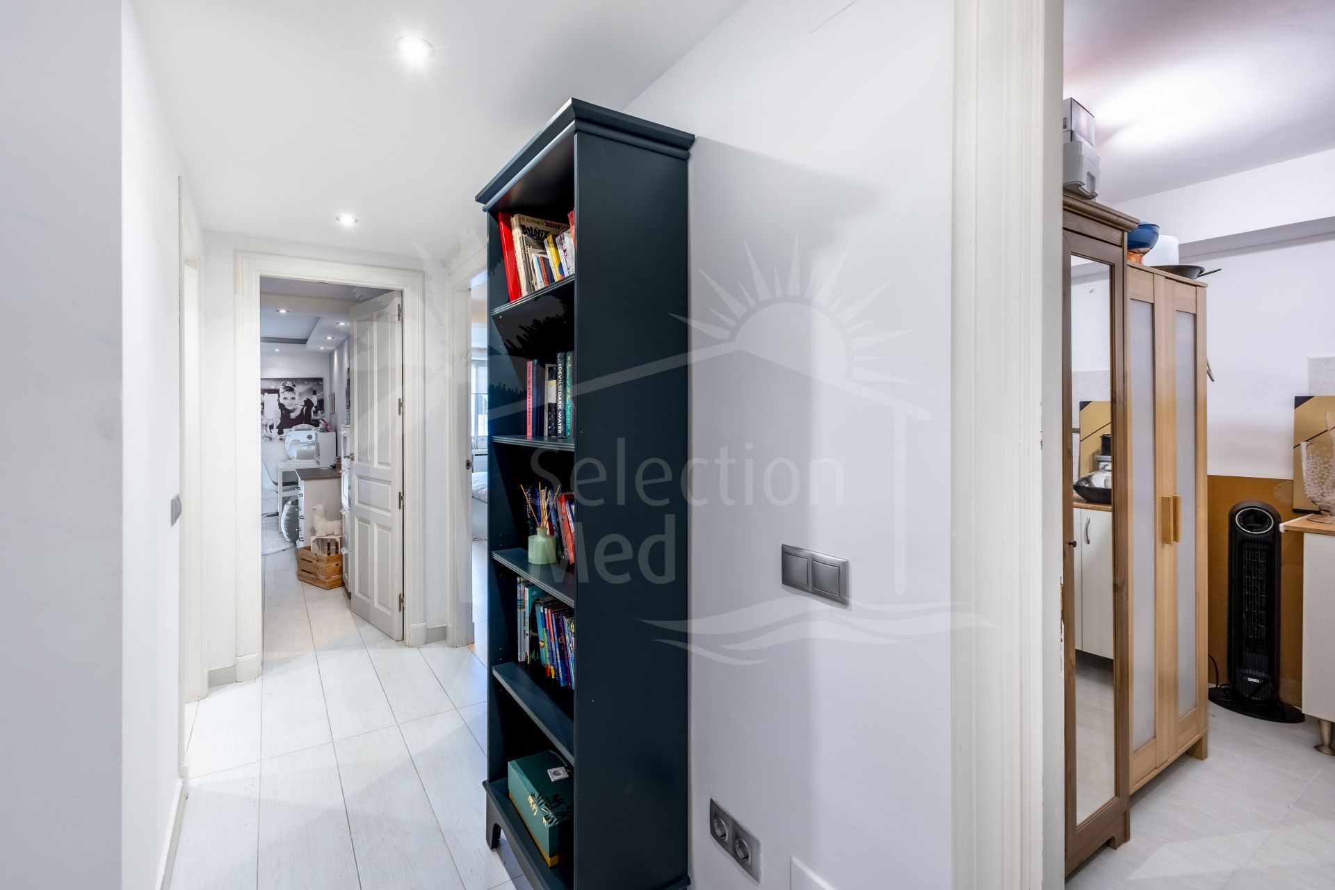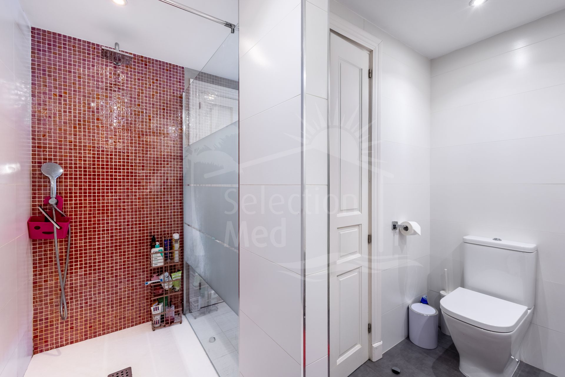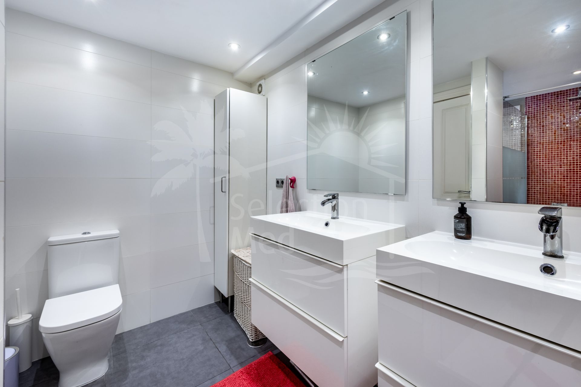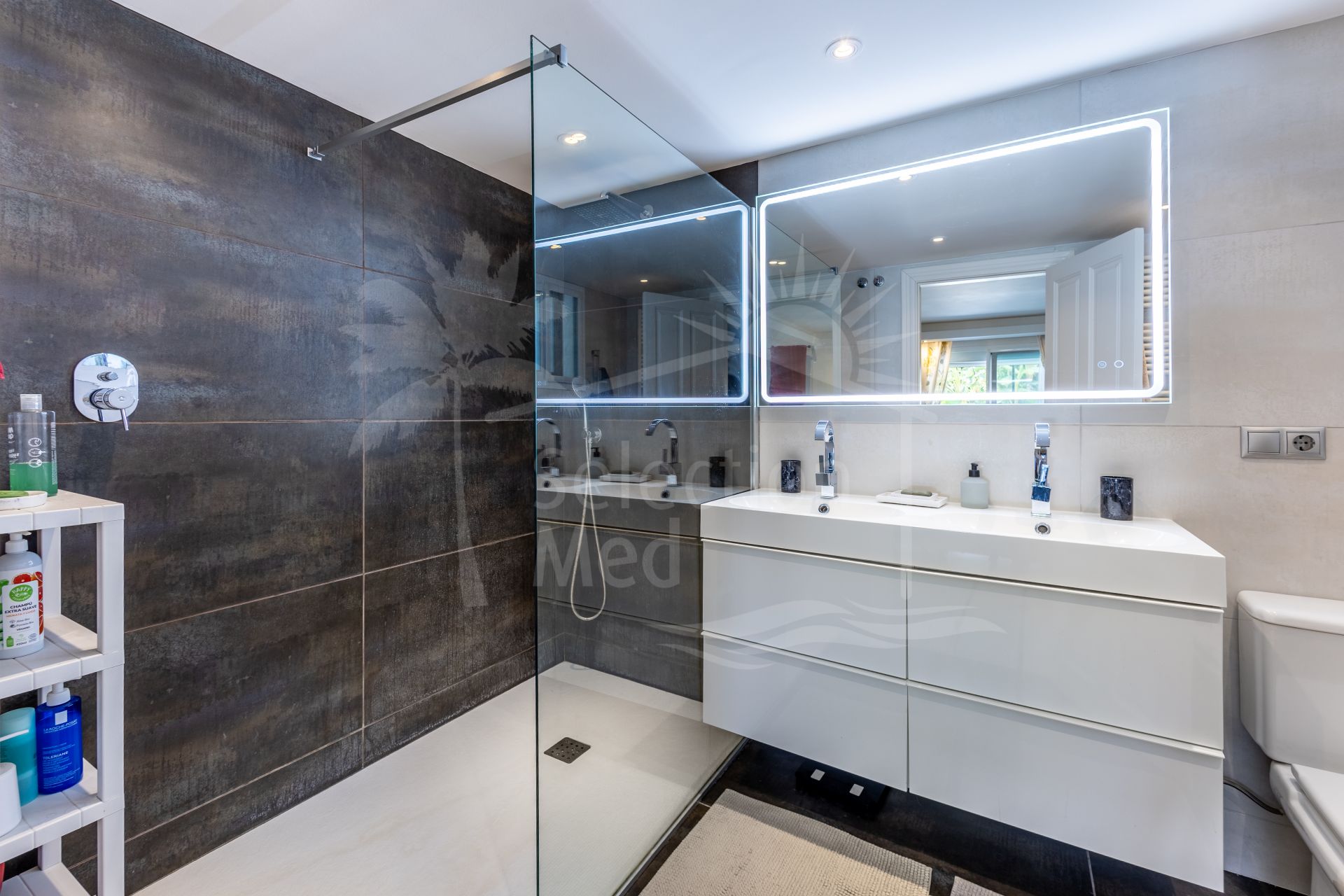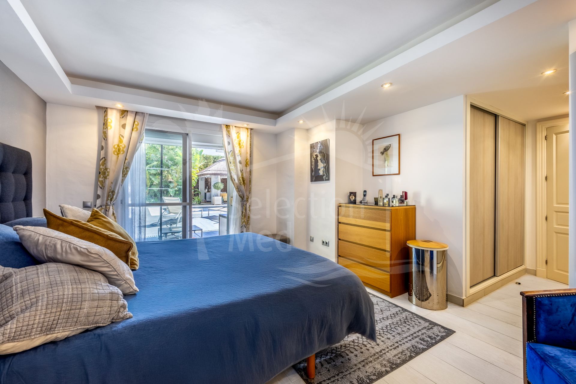 On the lower floor, which surprises with its natural light and spaciousness, you will find the master bedroom with a walk-in closet and en-suite bathroom, as well as two large double bedrooms (one with an en-suite bathroom), a kitchenette, and a separate storage room. From this floor, you can access the pool area and sun terrace directly, offering the possibility to adapt it as an independent apartment if desired.