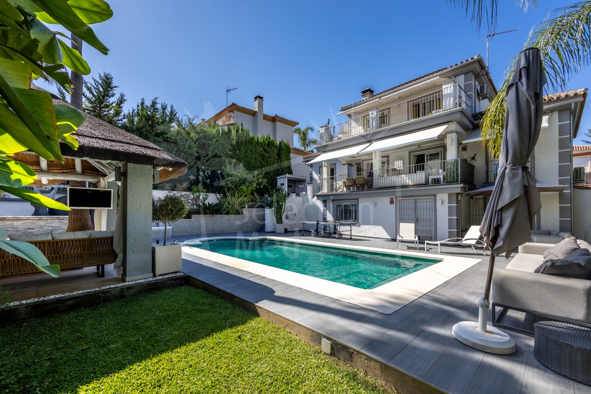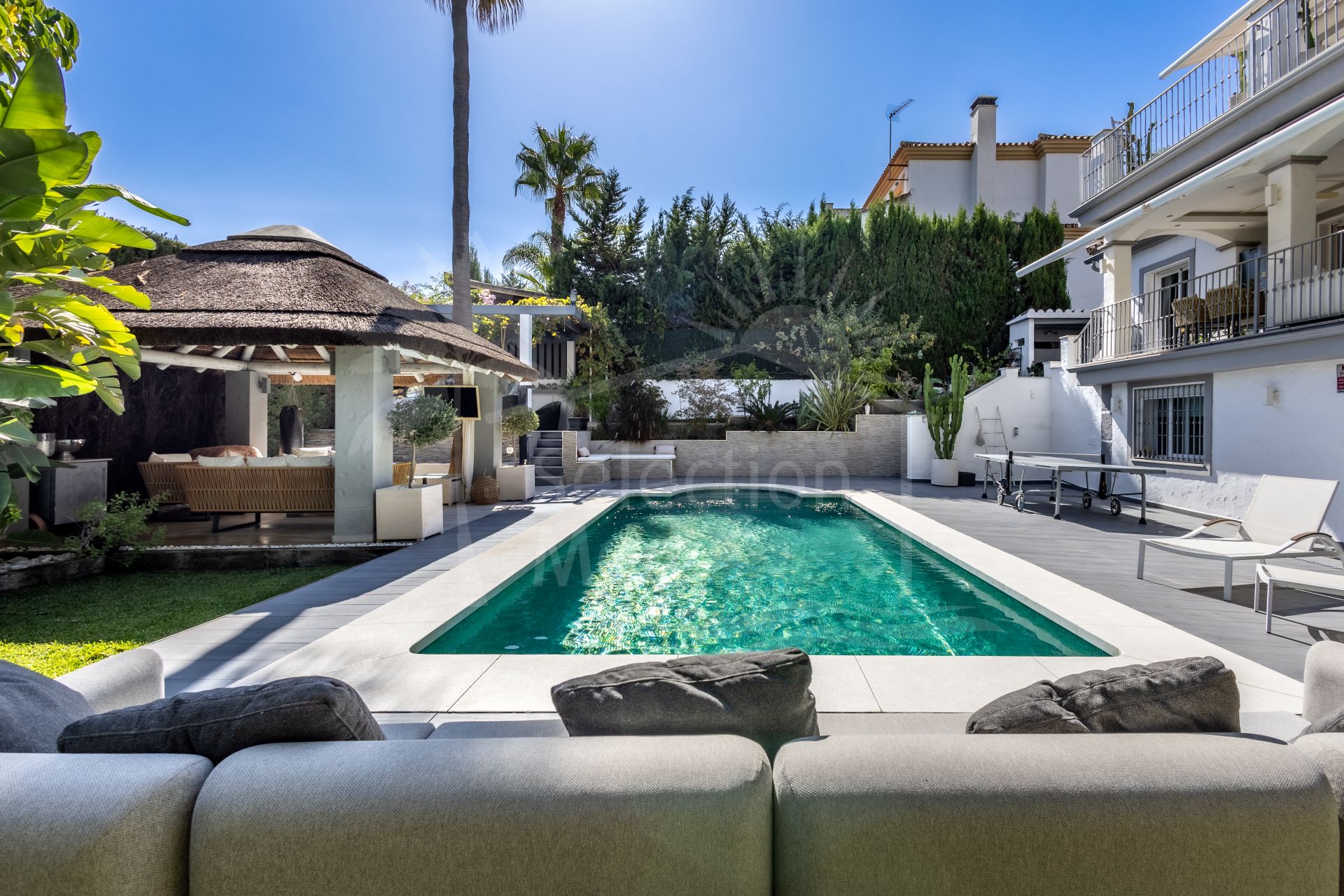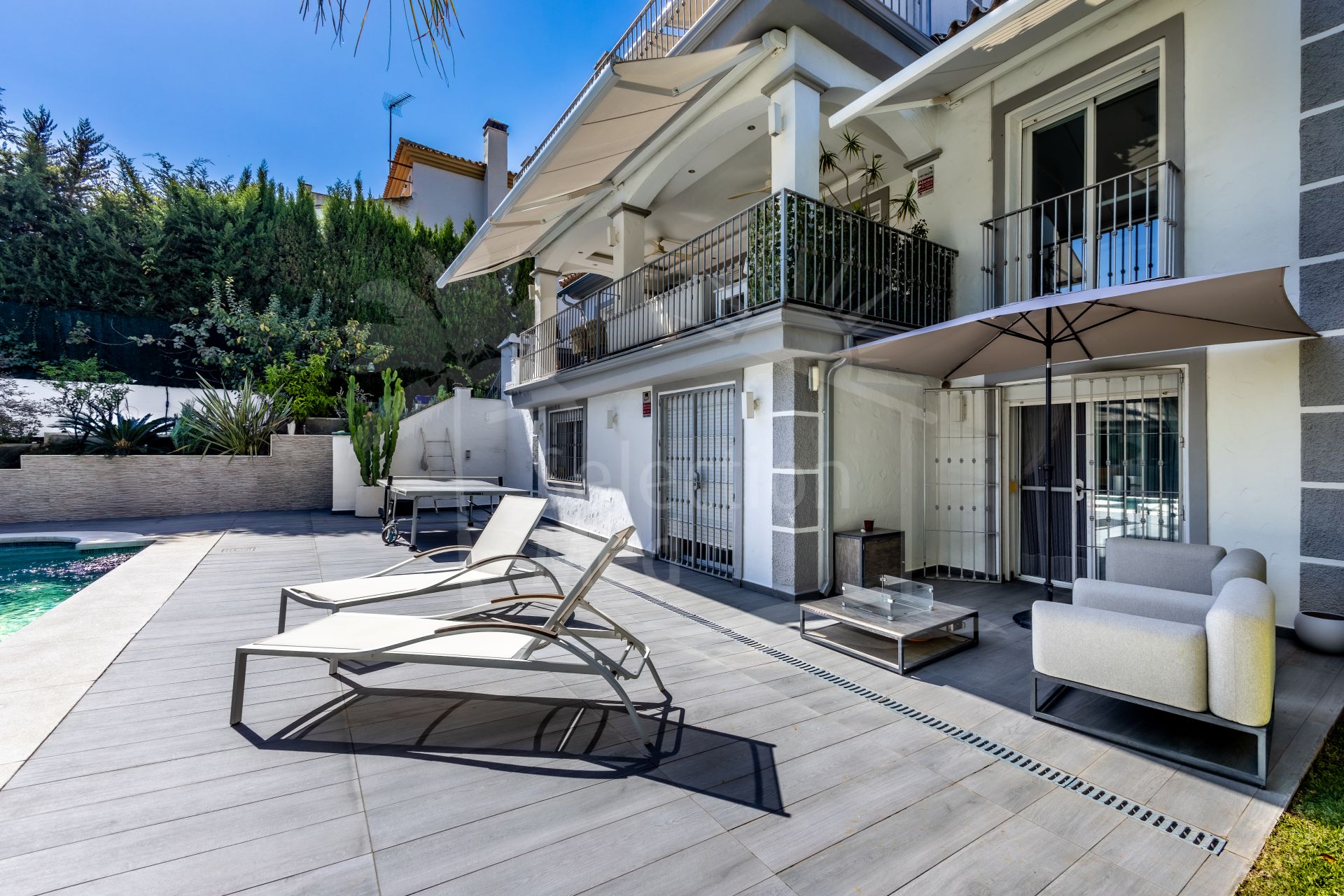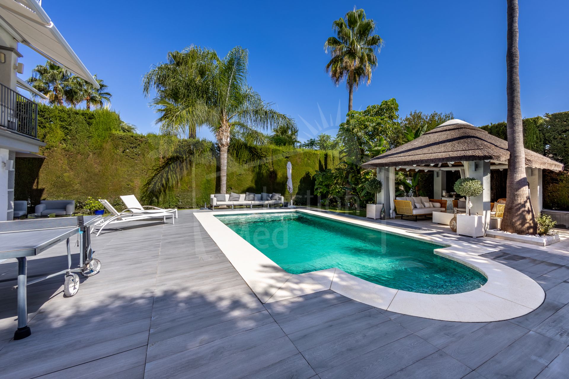 The exterior of the villa is an impressive, secure, and fully established retreat, landscaped to offer multiple seating areas, relaxation spaces, and outdoor dining options. Among its charms, you will find a barbecue area, a romantic corner in the orchard, fruit trees, and a small vegetable garden. The main terrace can accommodate more than 12 diners, providing direct access to the pool, solarium, and gardens.